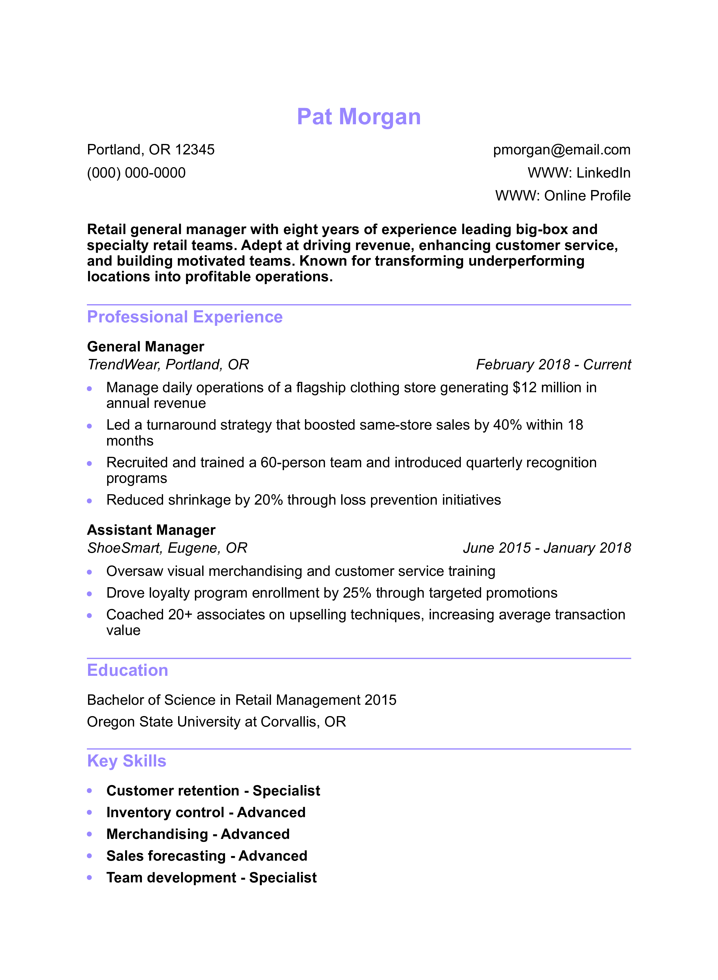 This resume highlights a successful retail turnaround with strong leadership and performance data. Here’s how to present retail skills in a compelling way.