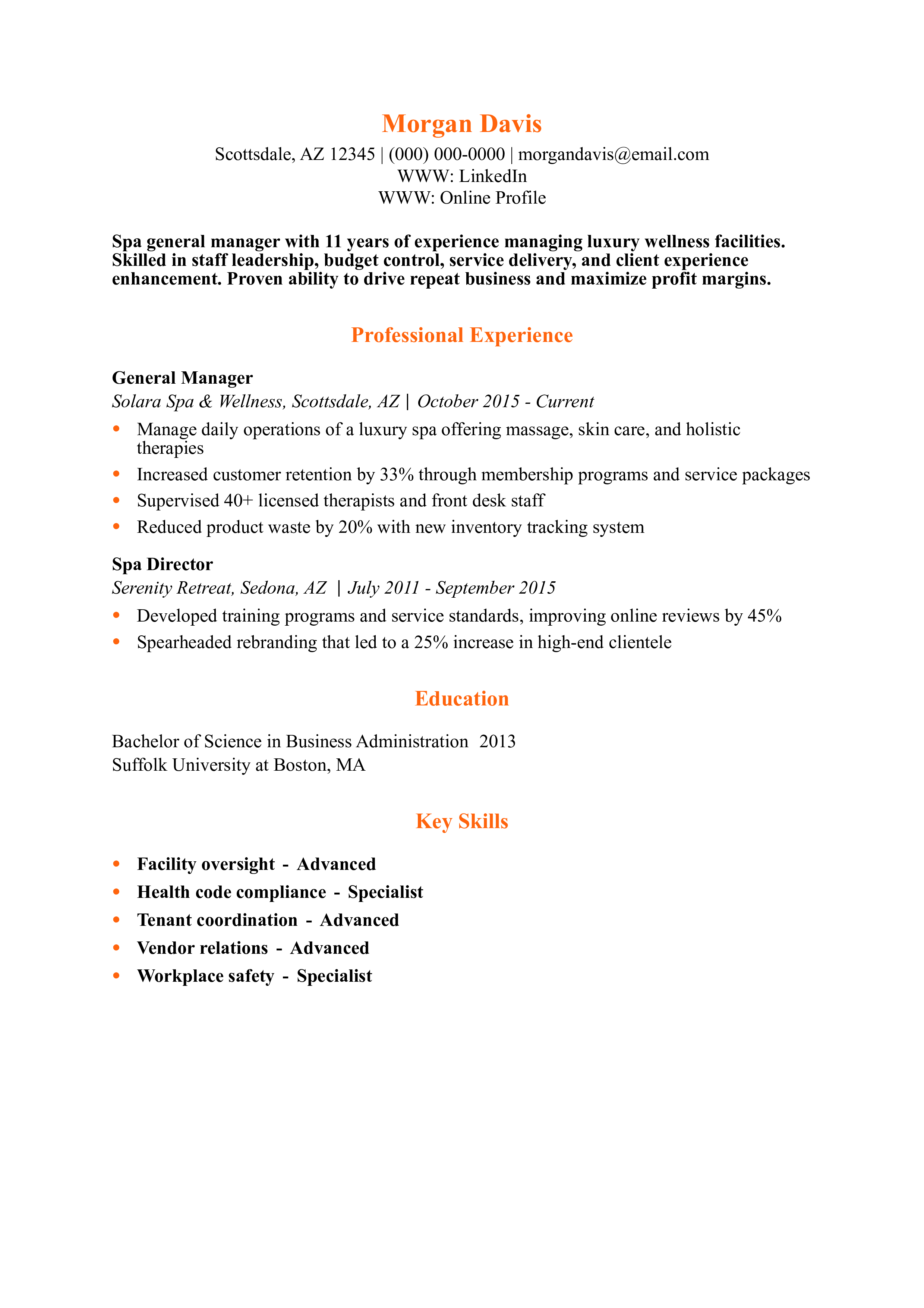 Spa General Manager Resume