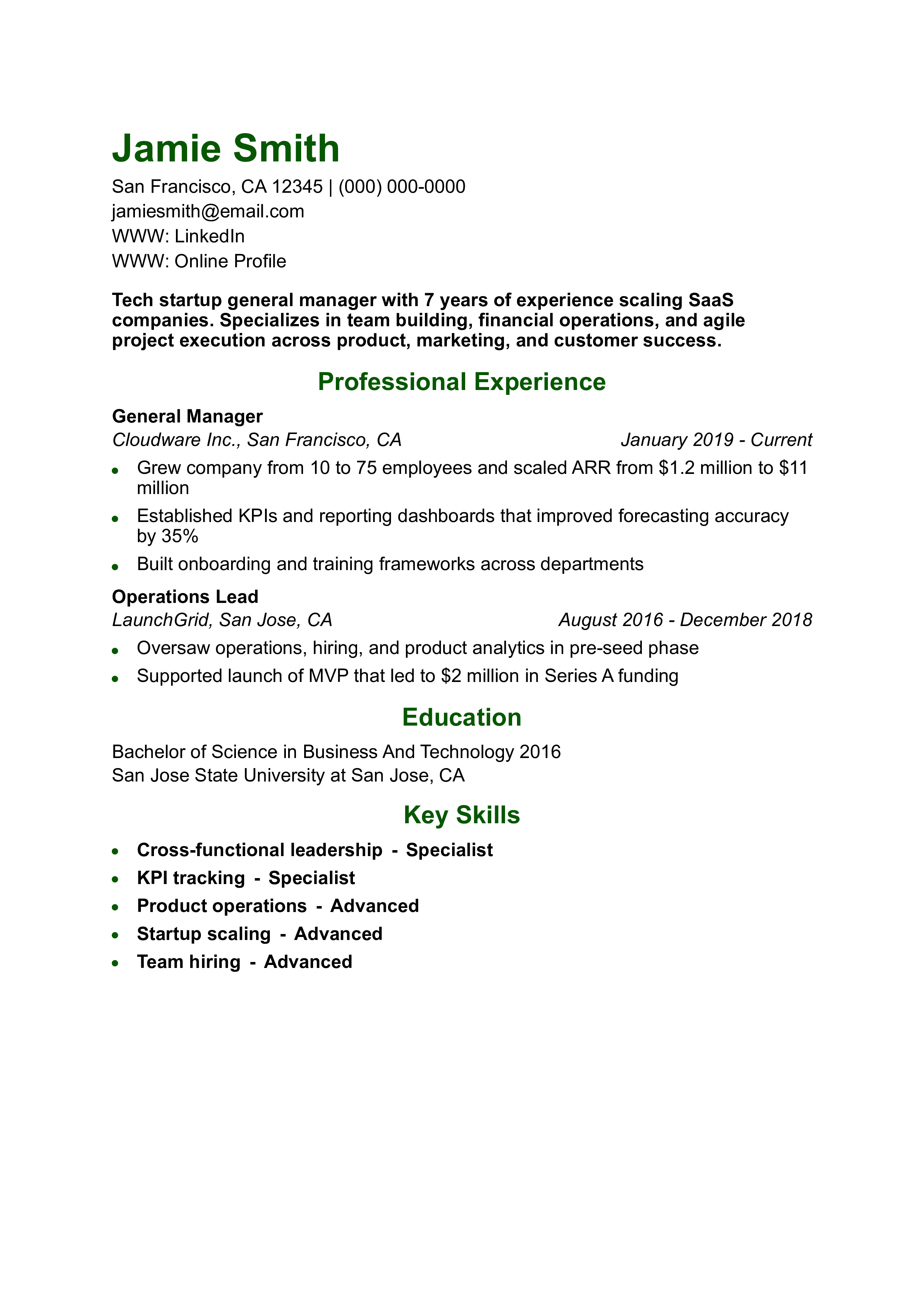 Tech Startup General Manager Resume