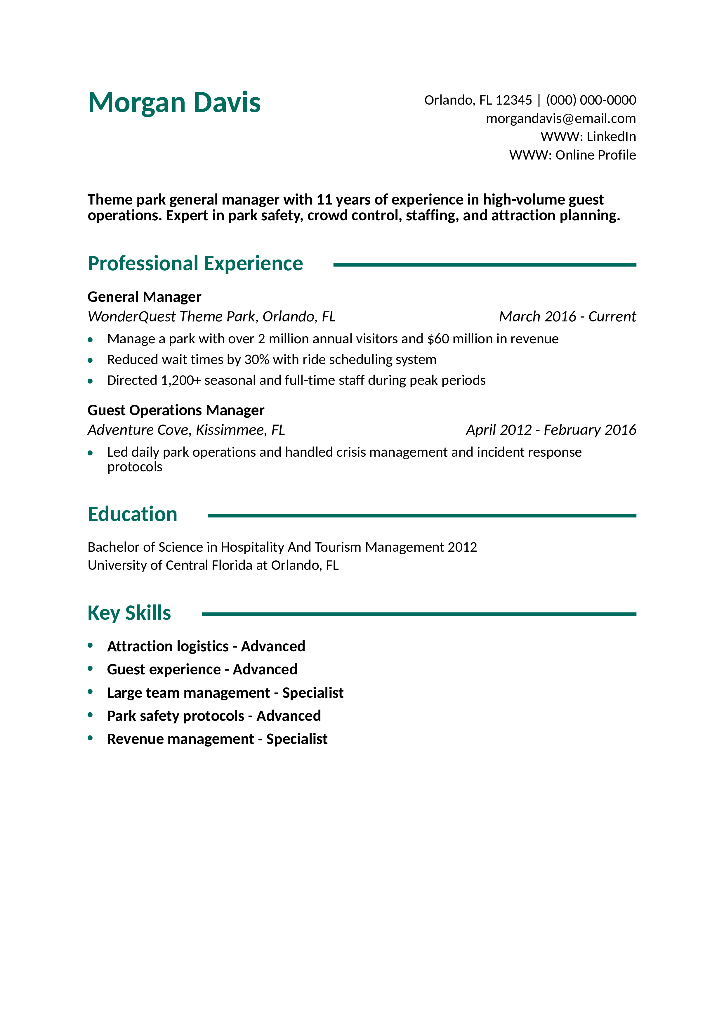 This resume displays high-level coordination for large-scale attractions and seasonal workforce leadership. Learn how to prioritize relevant skills in your resume.
