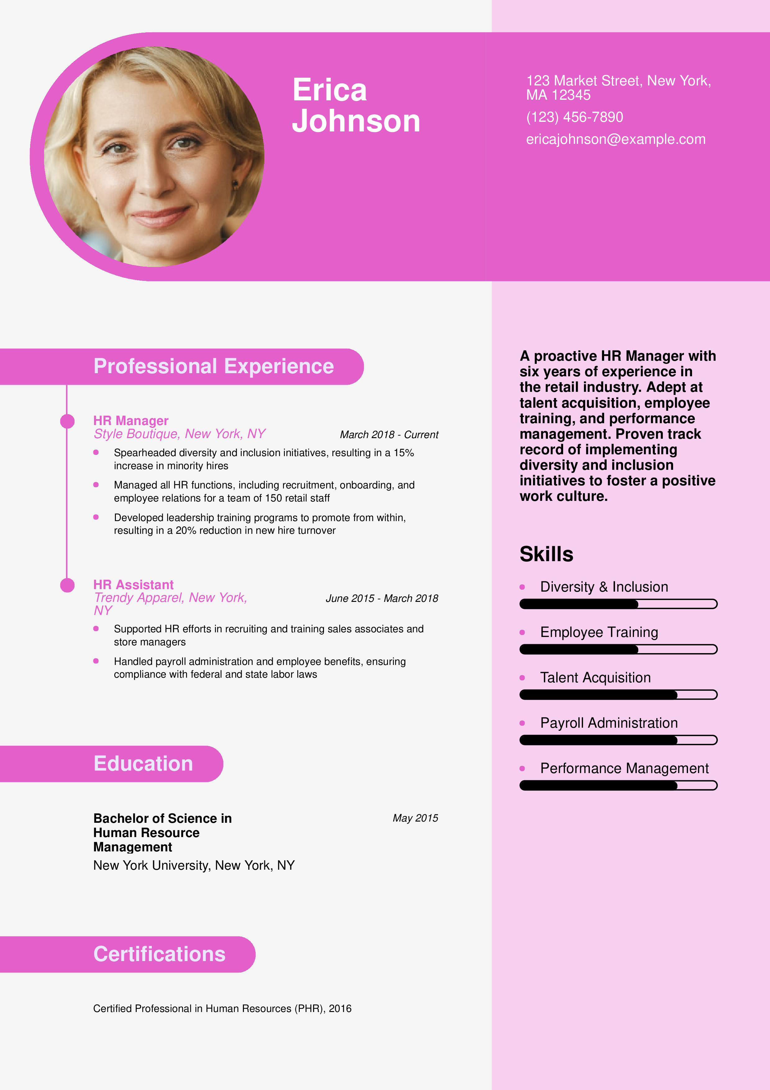 This resume highlights the candidate’s success in implementing diversity and inclusion programs, an important initiative in today’s retail environment. By demonstrating leadership in HR functions and fostering an inclusive work culture, this candidate is well-suited for HR roles in retail. For more tips on organizing your resume, check out how to make a resume.