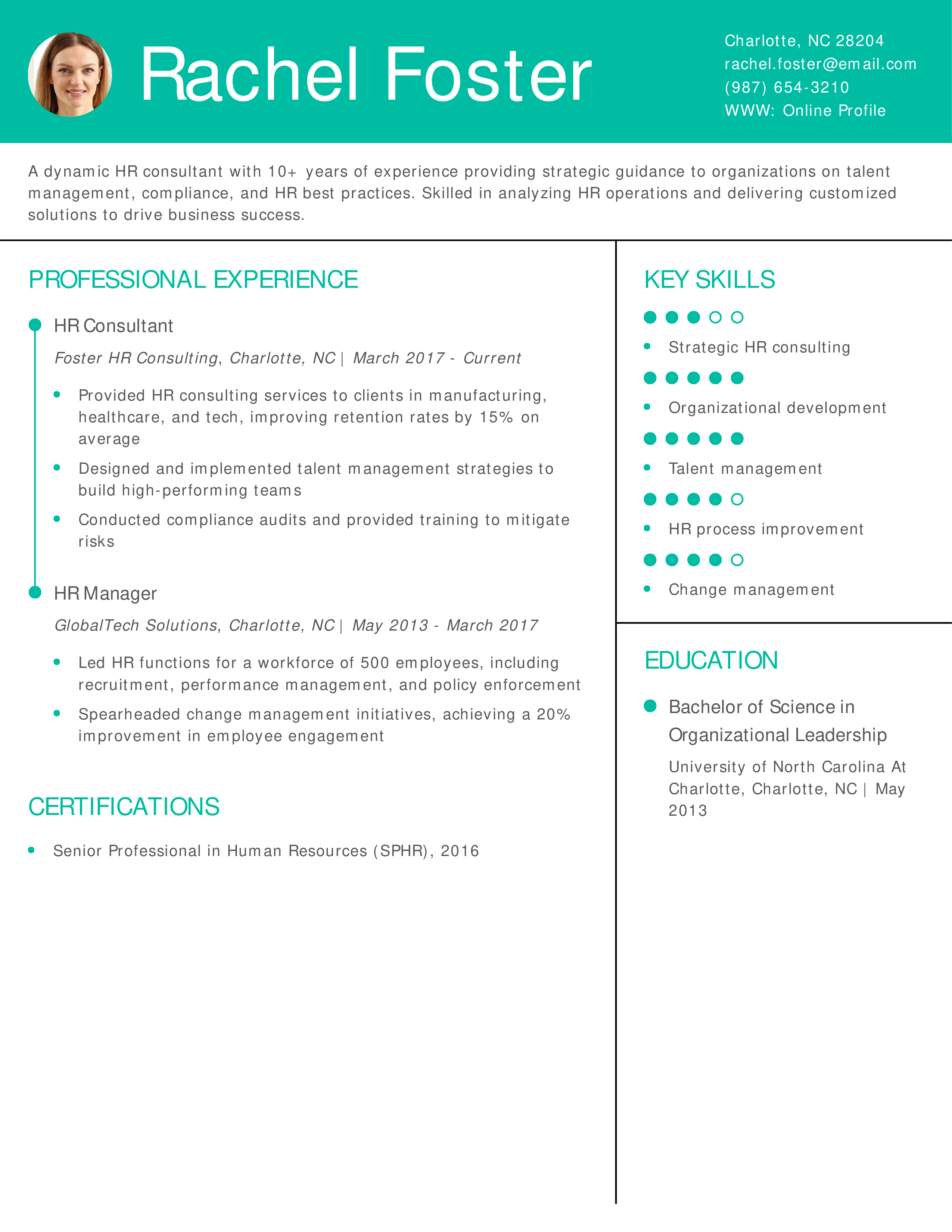 When you’re ready to write your resume, you’ll need to select a template to lay the foundation for your document. The best resume template for a human resources manager is clean and orderly. It should direct the reader’s attention to your most relevant professional information and have a simple, organized design. Avoid overly decorative fonts and loud graphics that may distract from the content of your resume. Remember, the goal is to present a visually appealing and well-structured resume that effectively highlights your HR expertise and credentials to capture the attention of hiring managers.