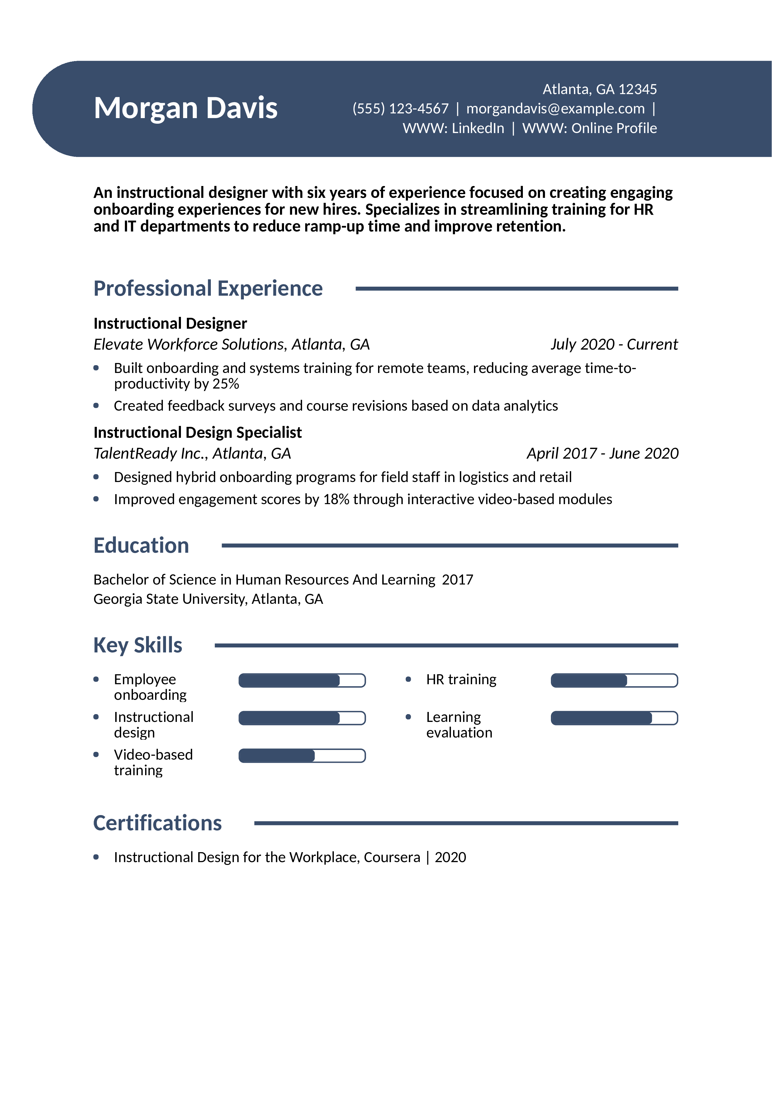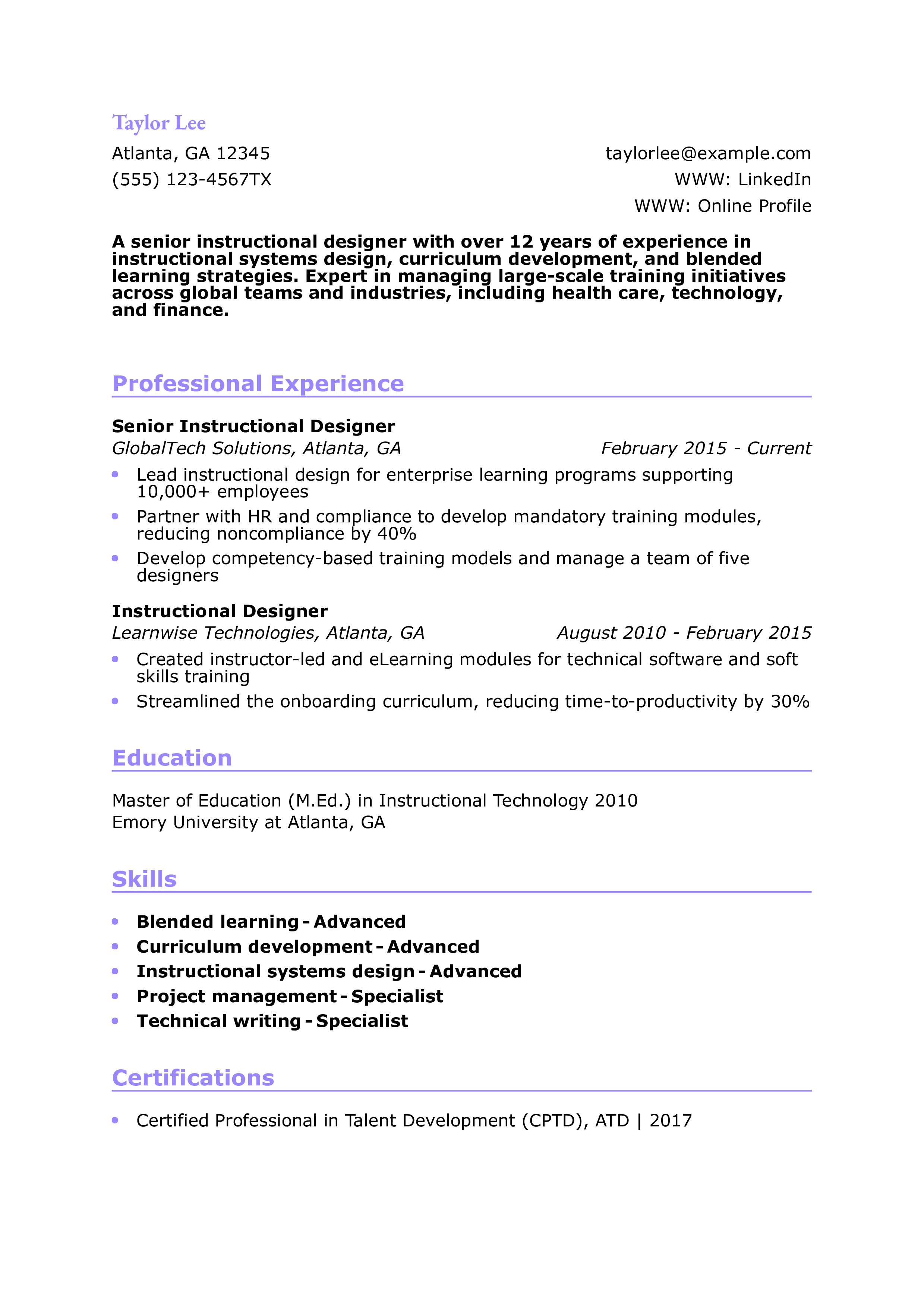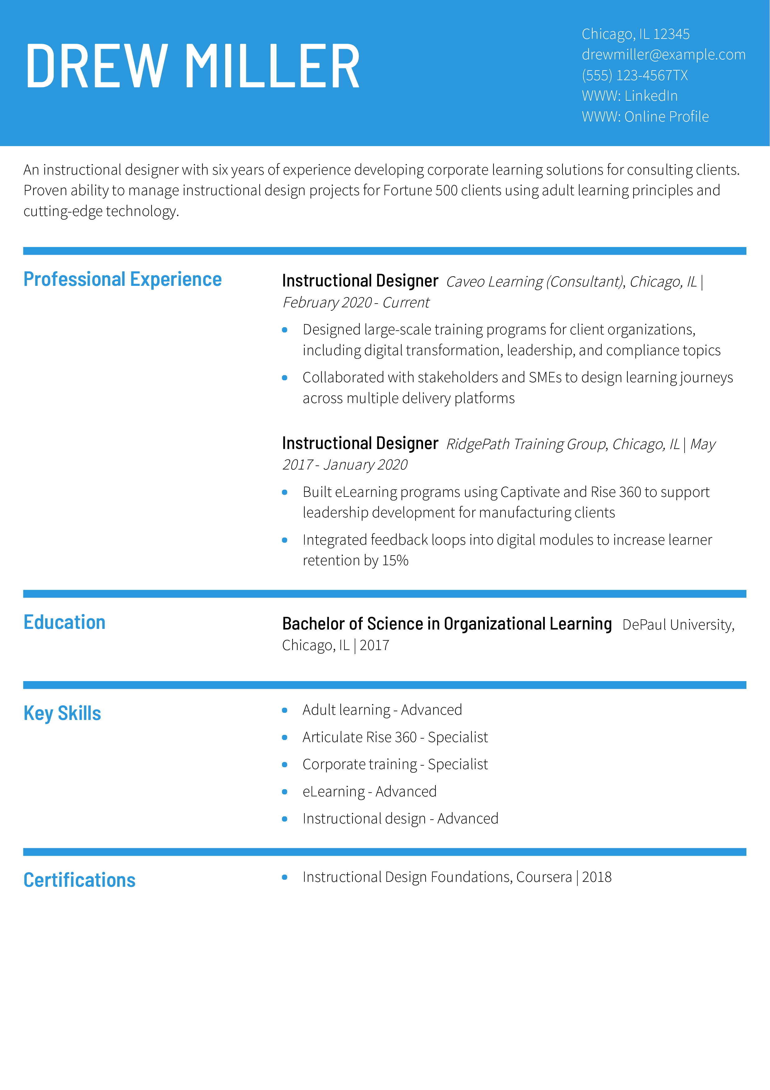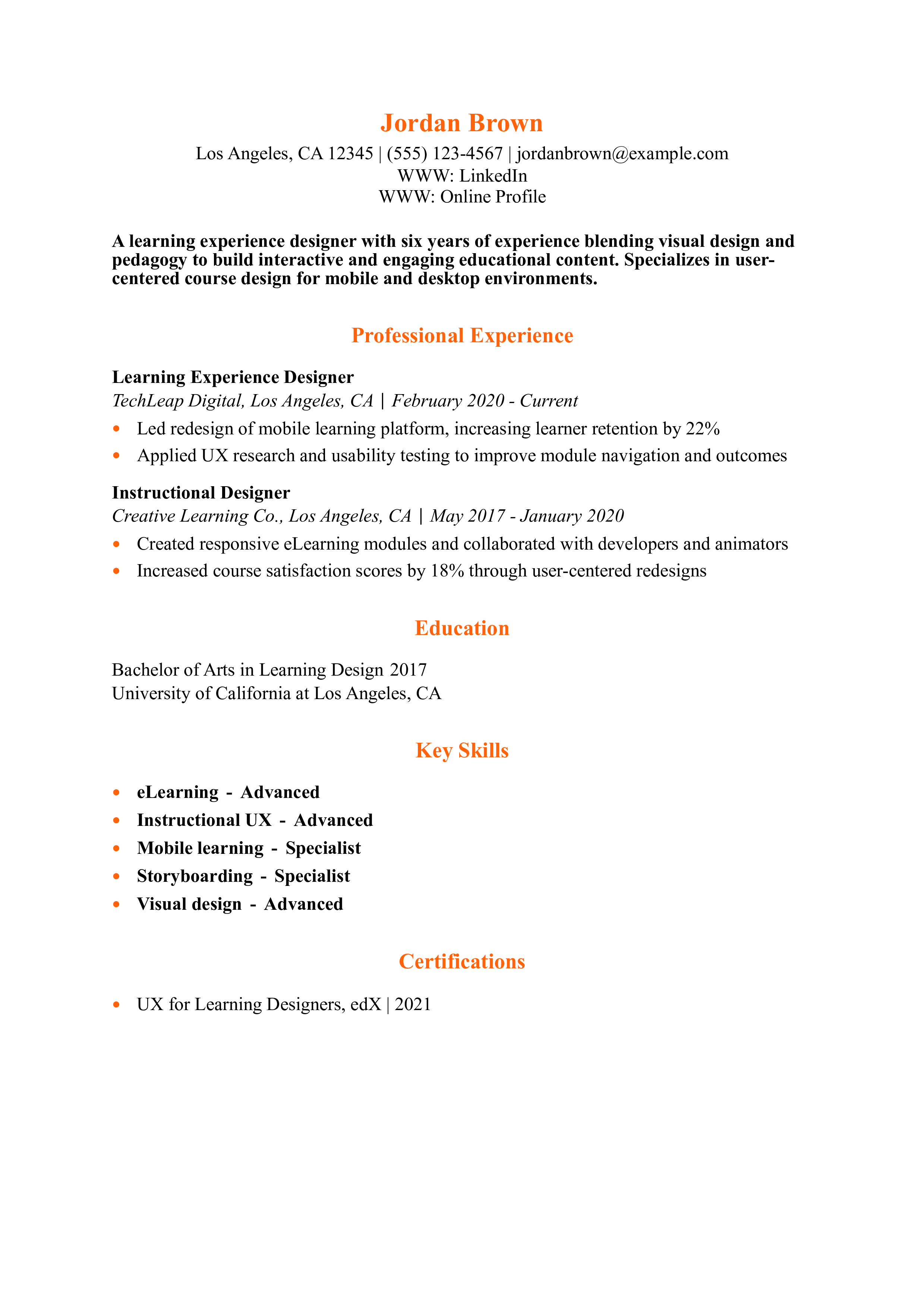 A reverse chronological resume format is the right choice for most instructional design professionals. It’s easy to customize and helps you tell a story about your career progression.