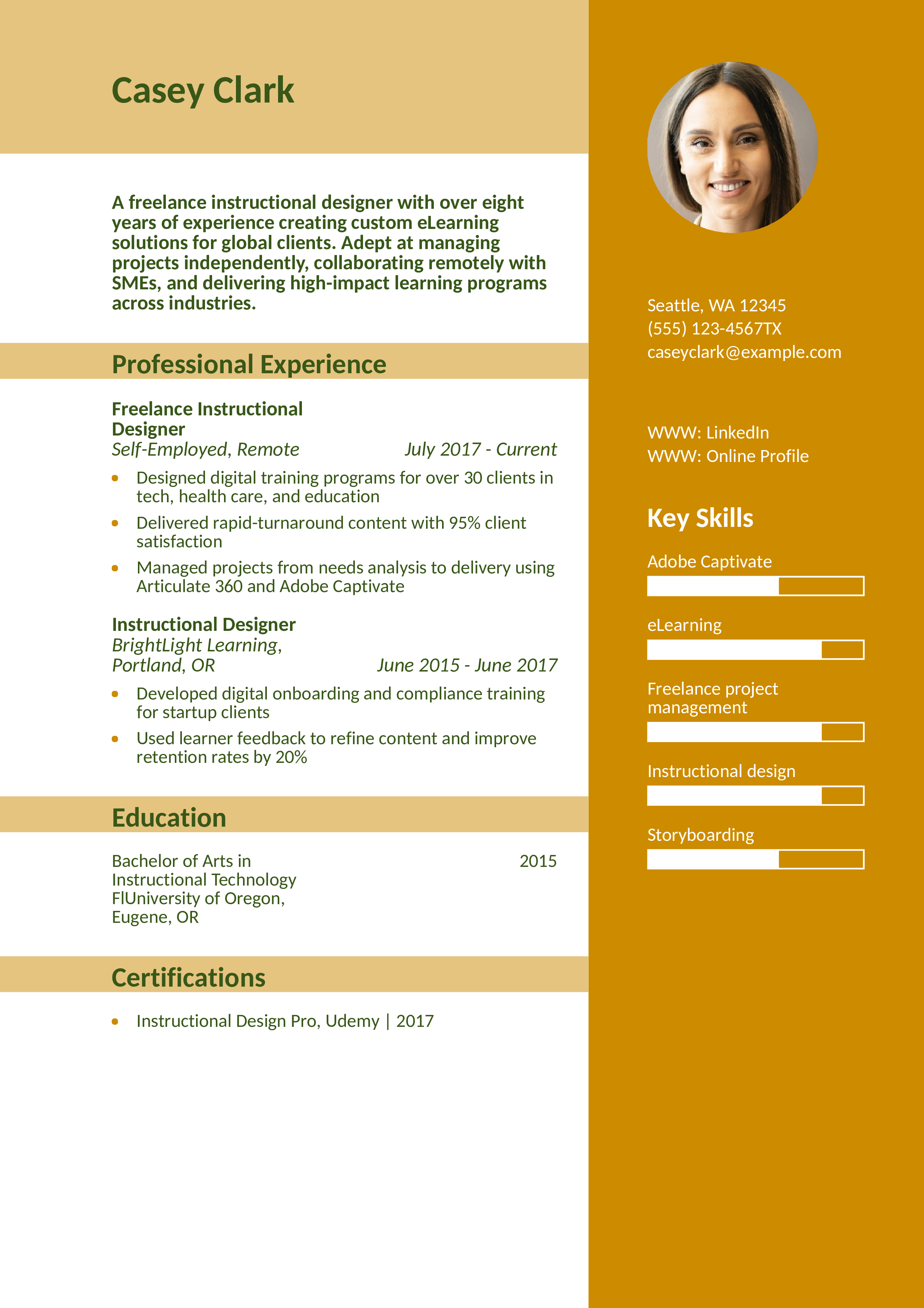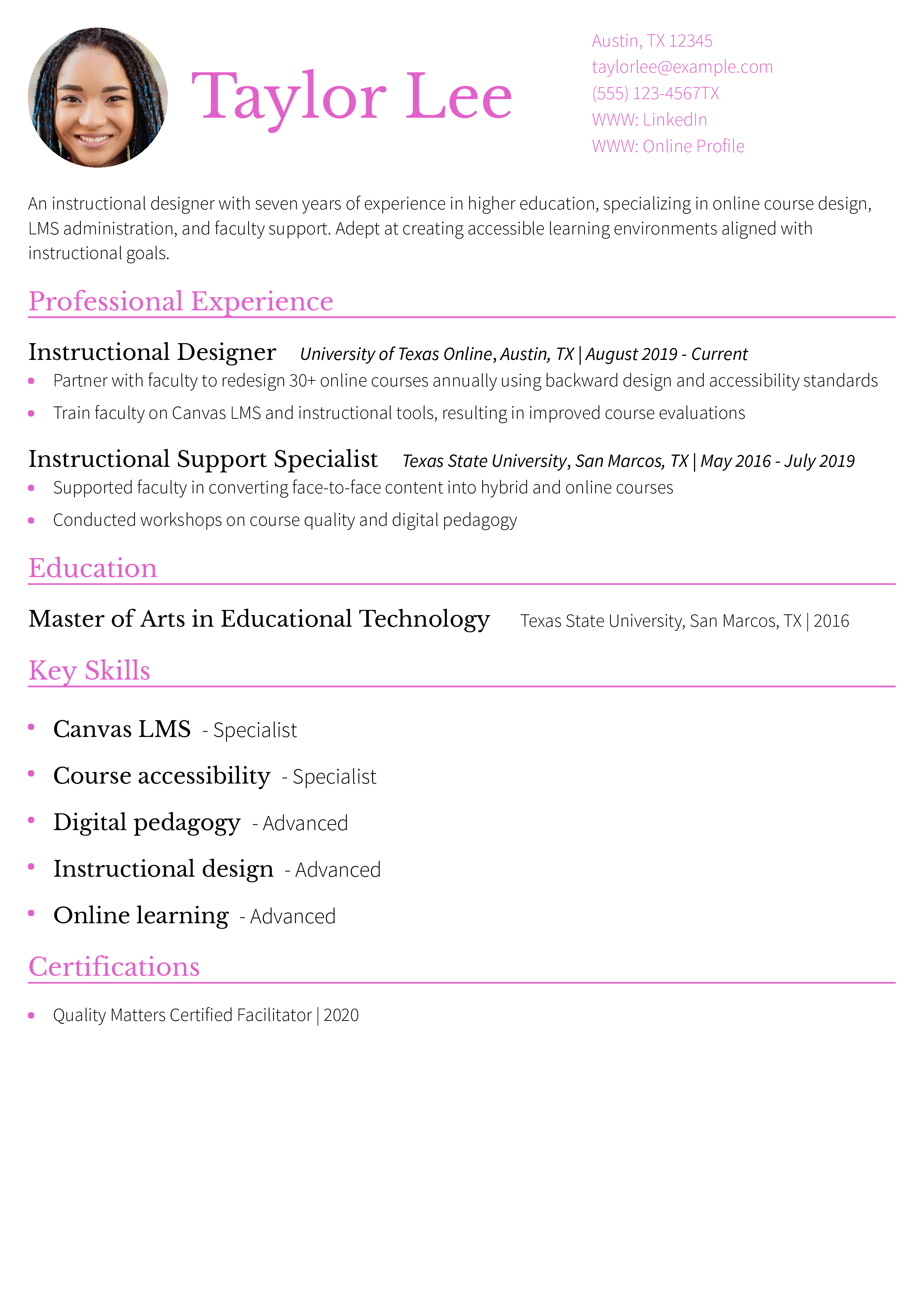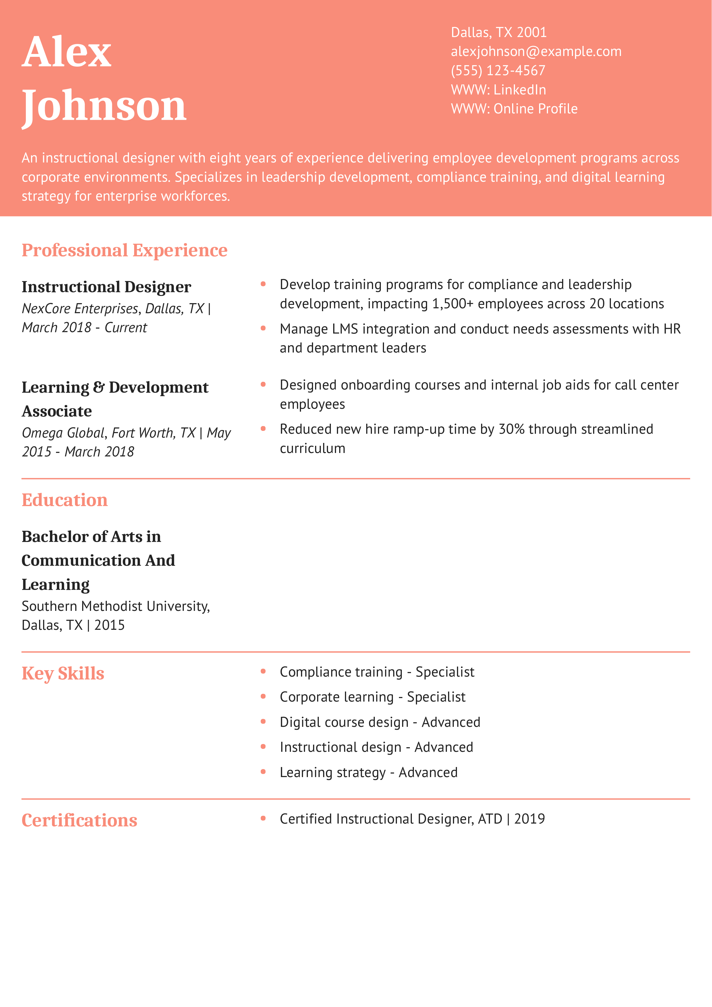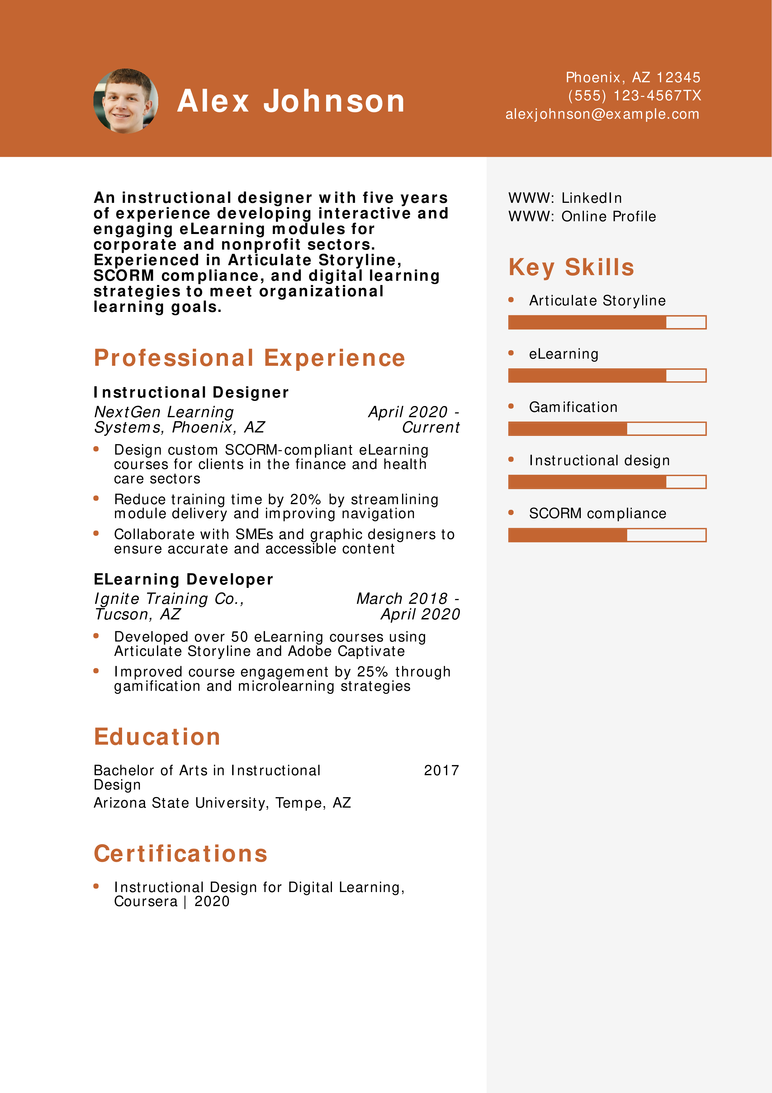 A reverse chronological resume format is the right choice for most instructional design professionals. It’s easy to customize and helps you tell a story about your career progression.