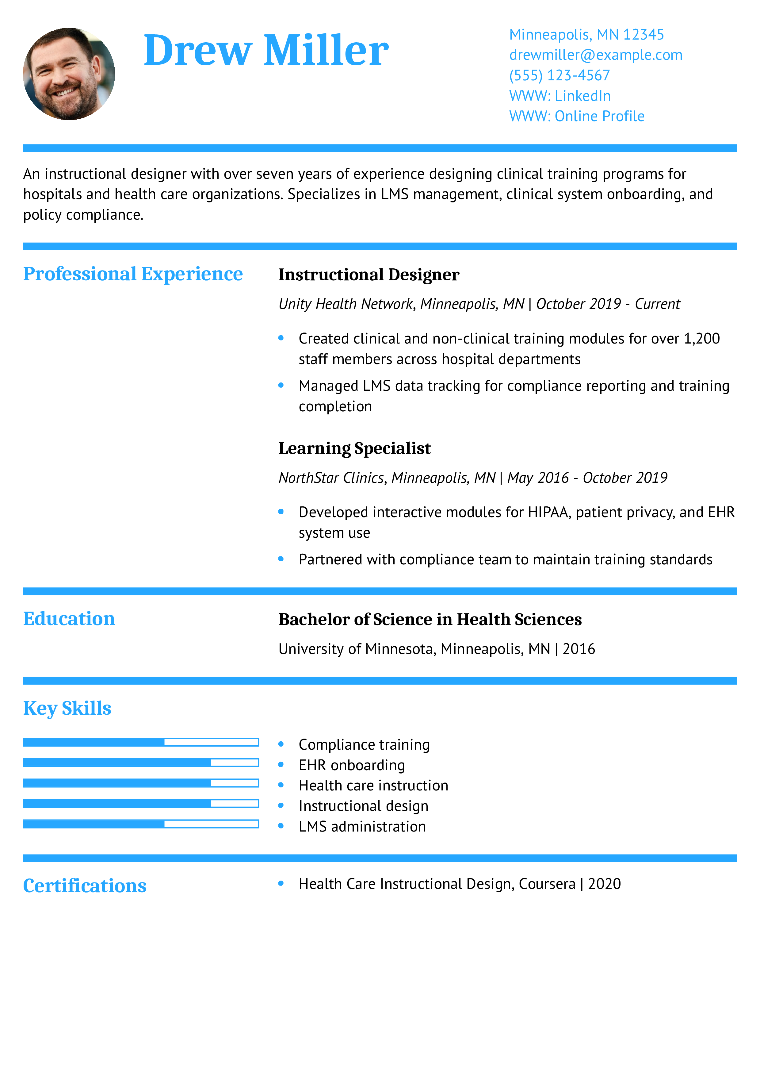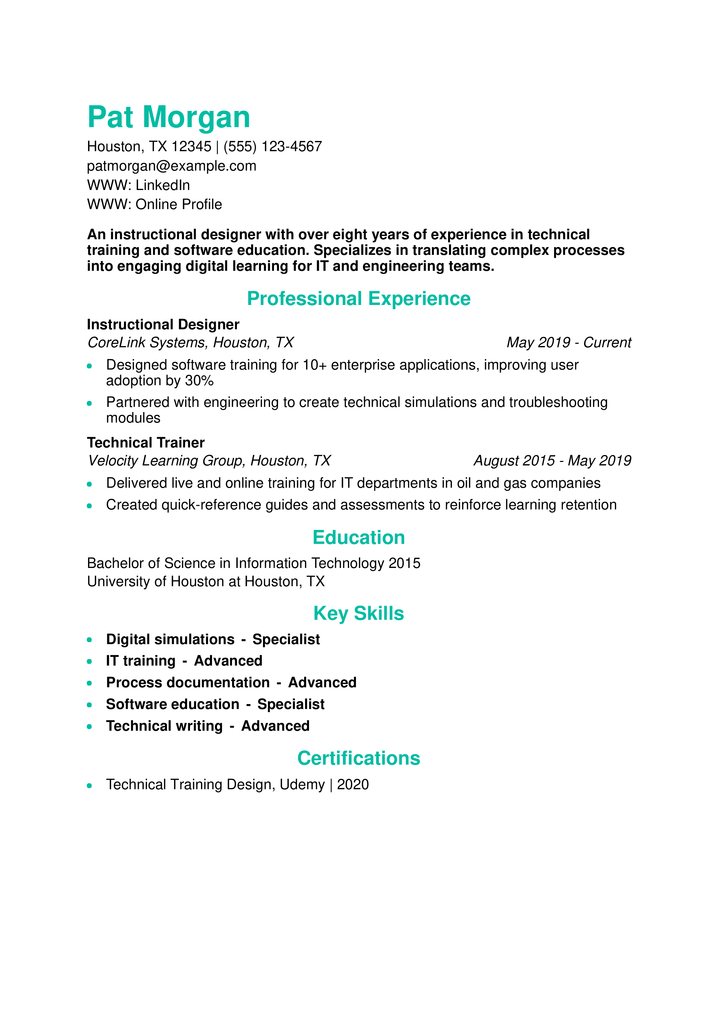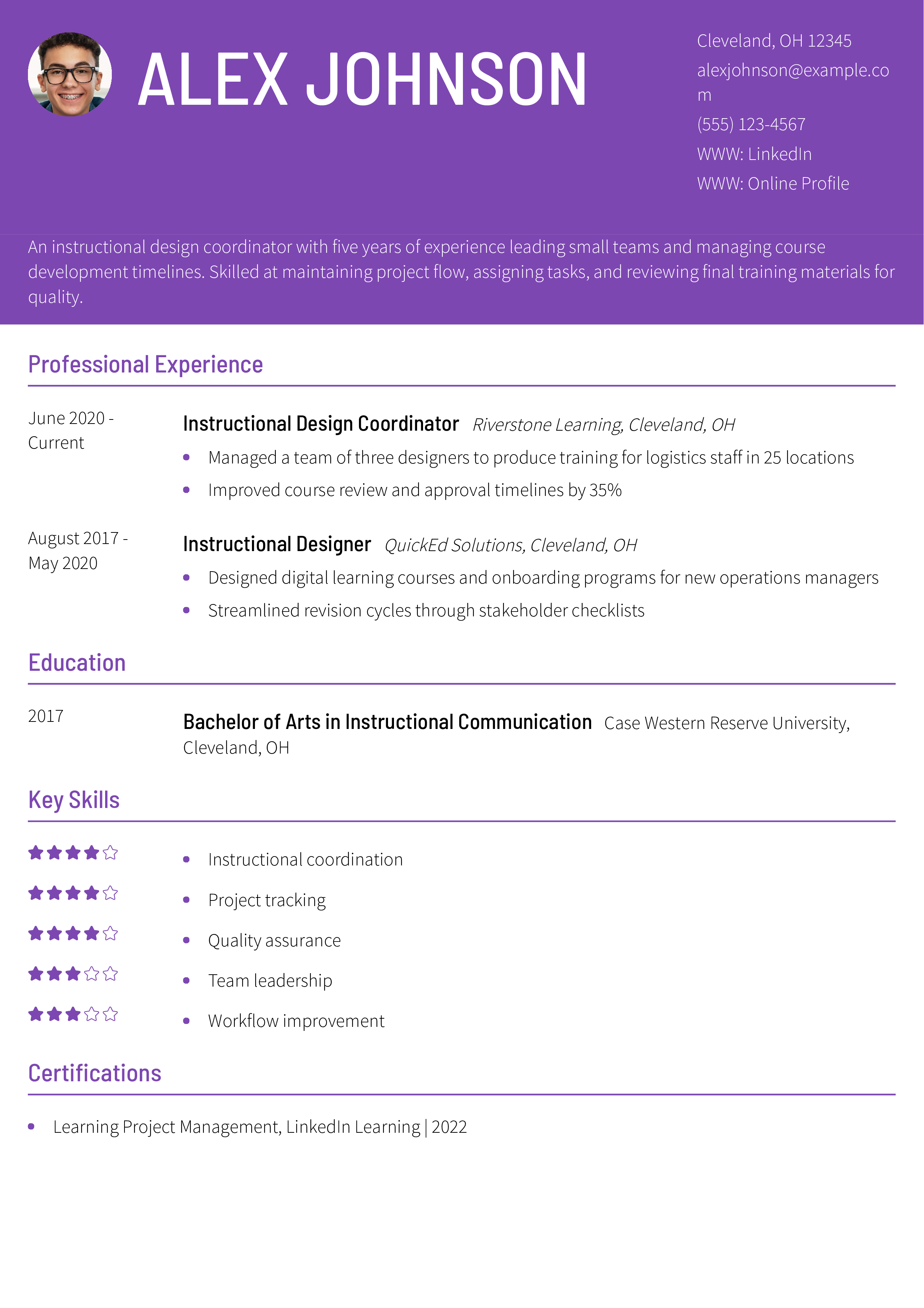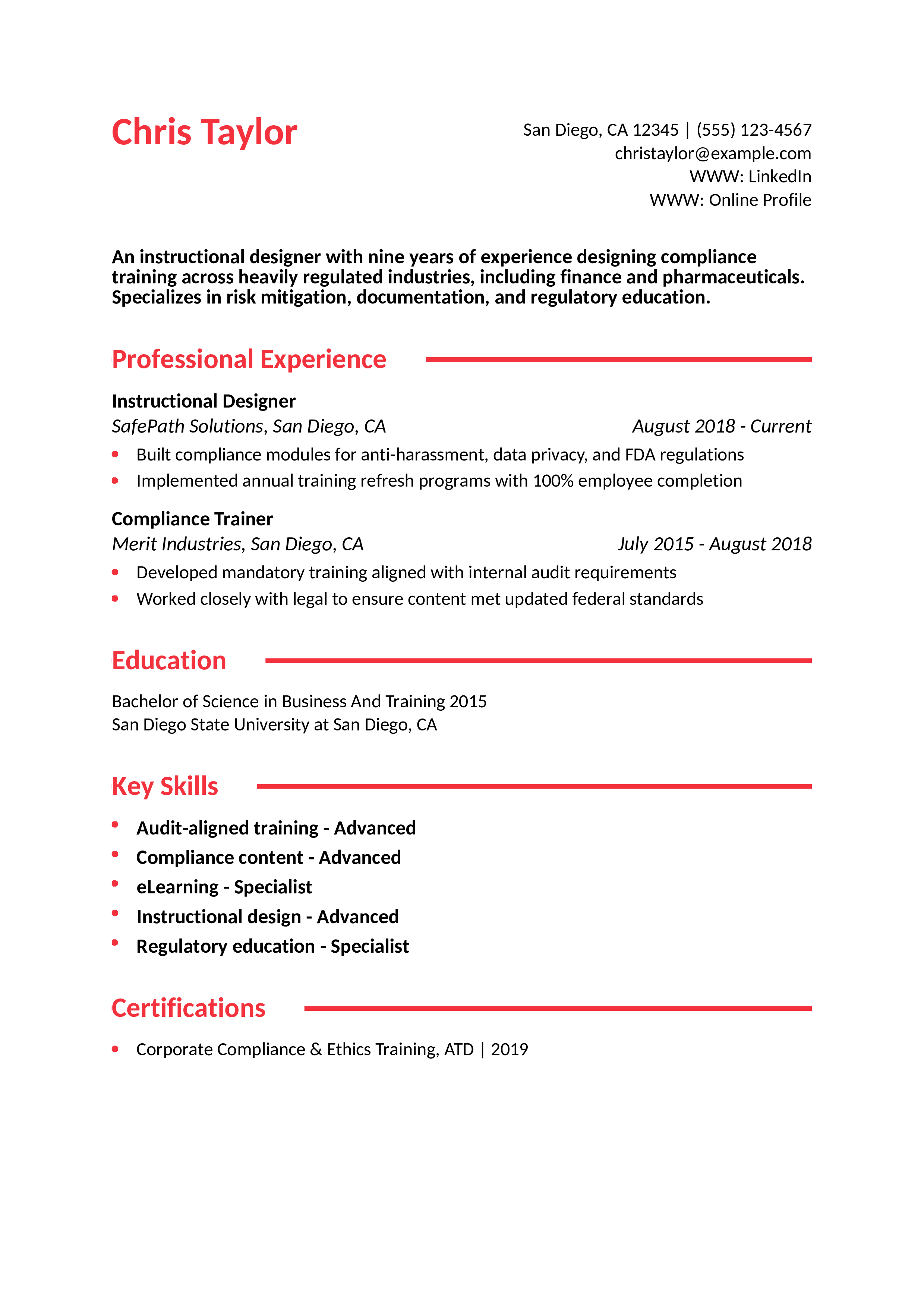 A reverse chronological resume format is the right choice for most instructional design professionals. It’s easy to customize and helps you tell a story about your career progression.