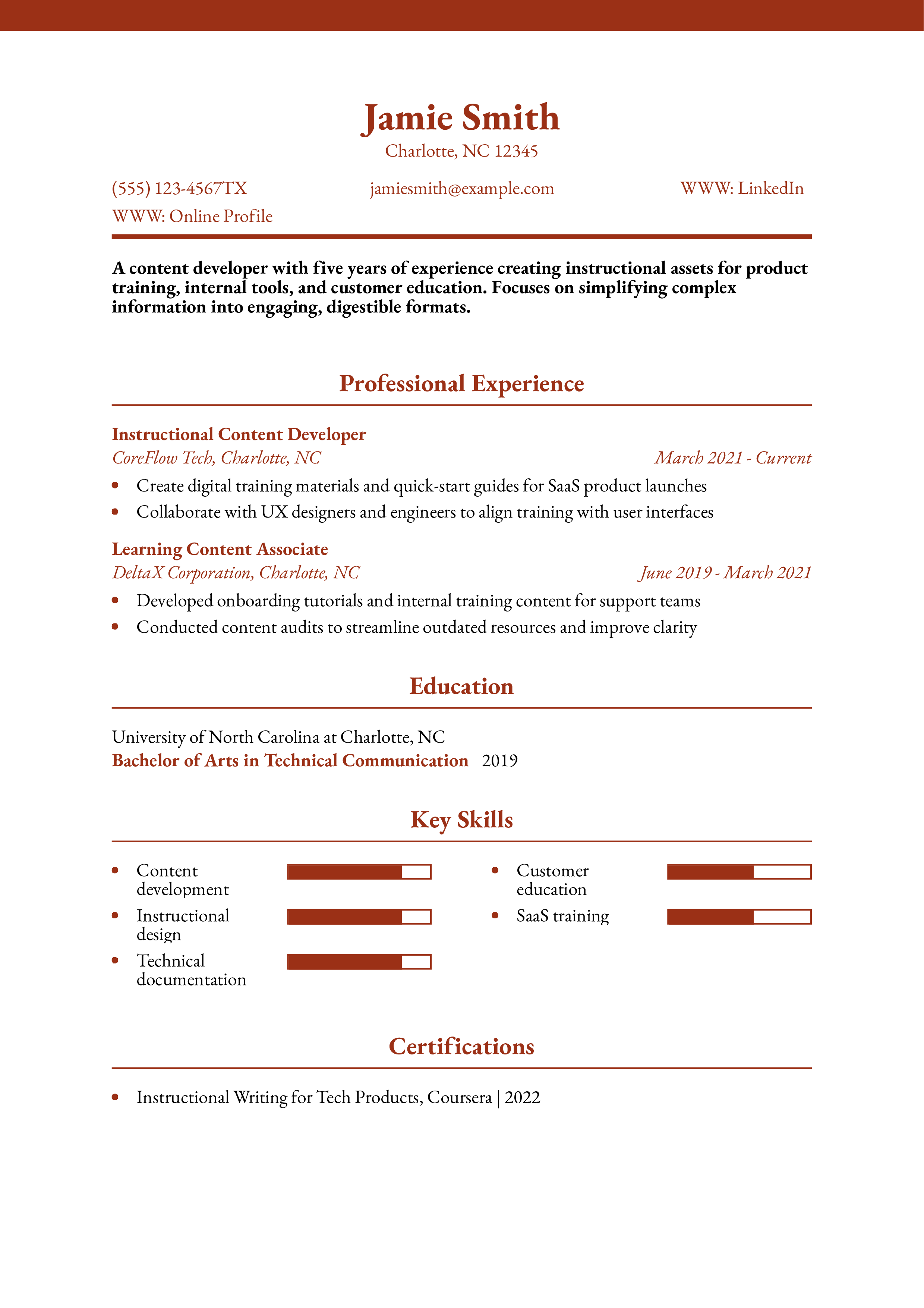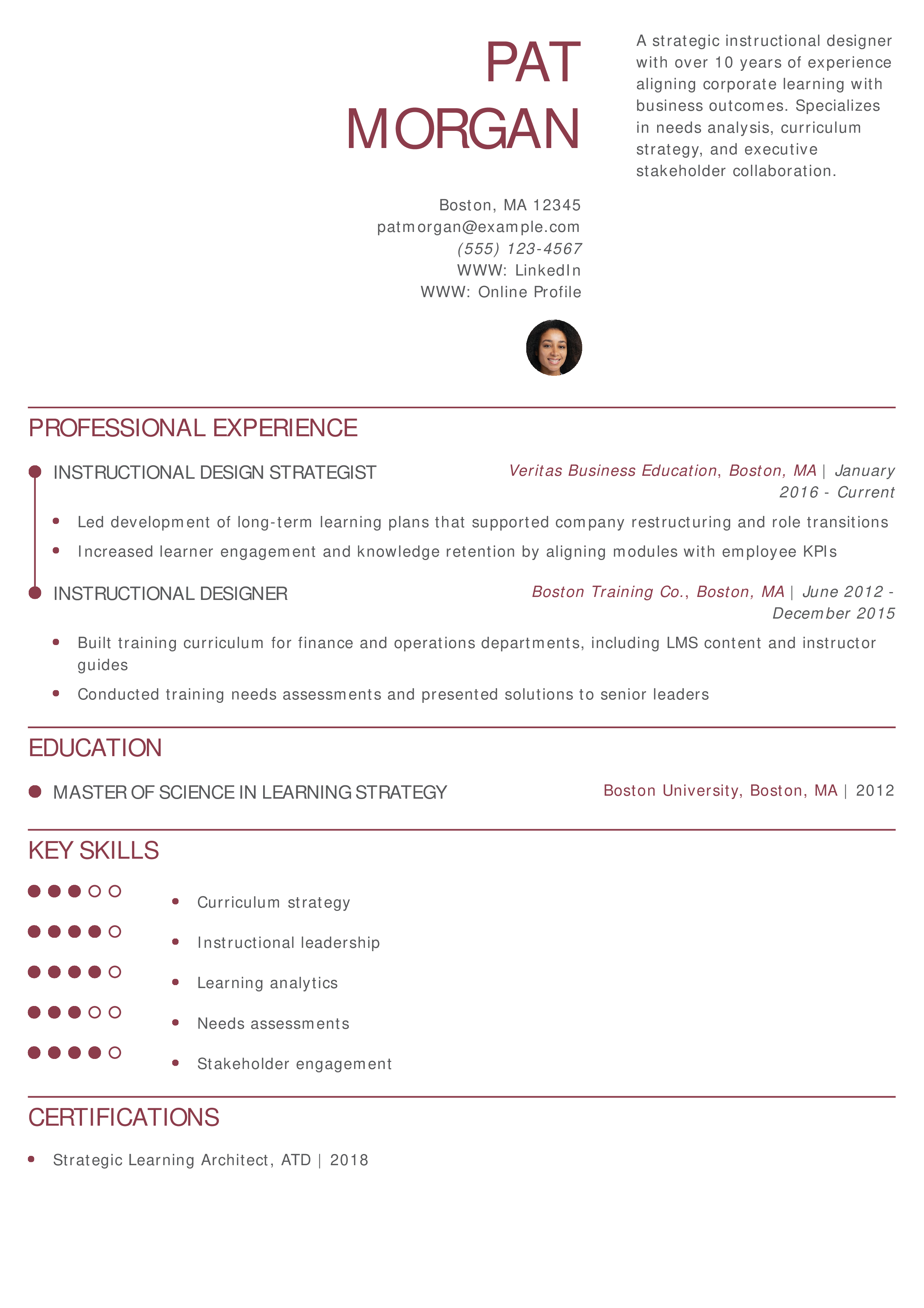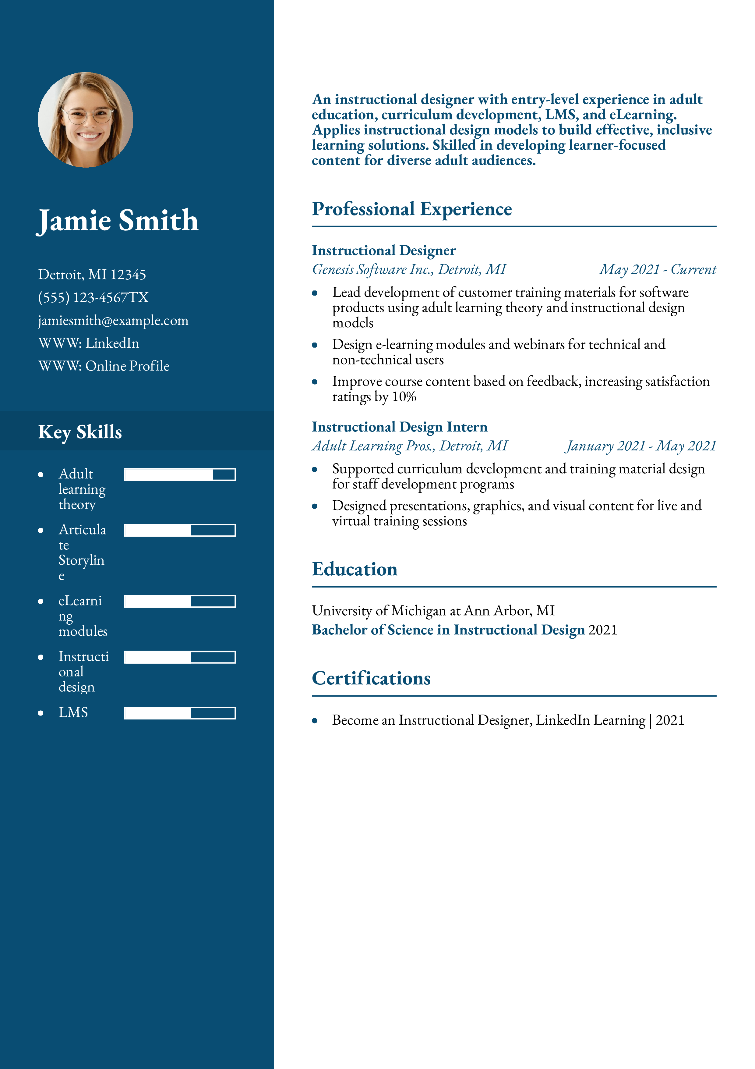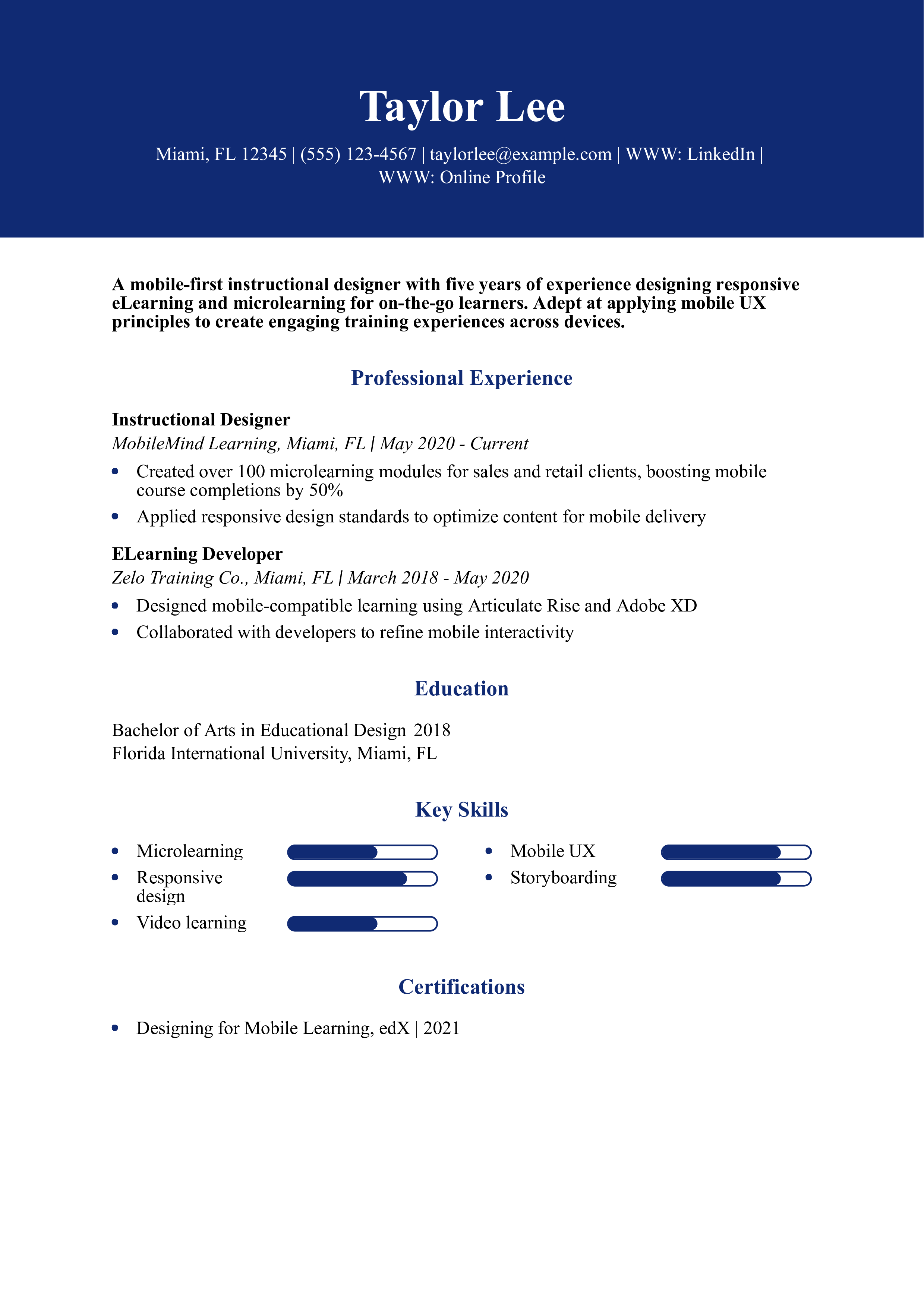 A reverse chronological resume format is the right choice for most instructional design professionals. It’s easy to customize and helps you tell a story about your career progression.