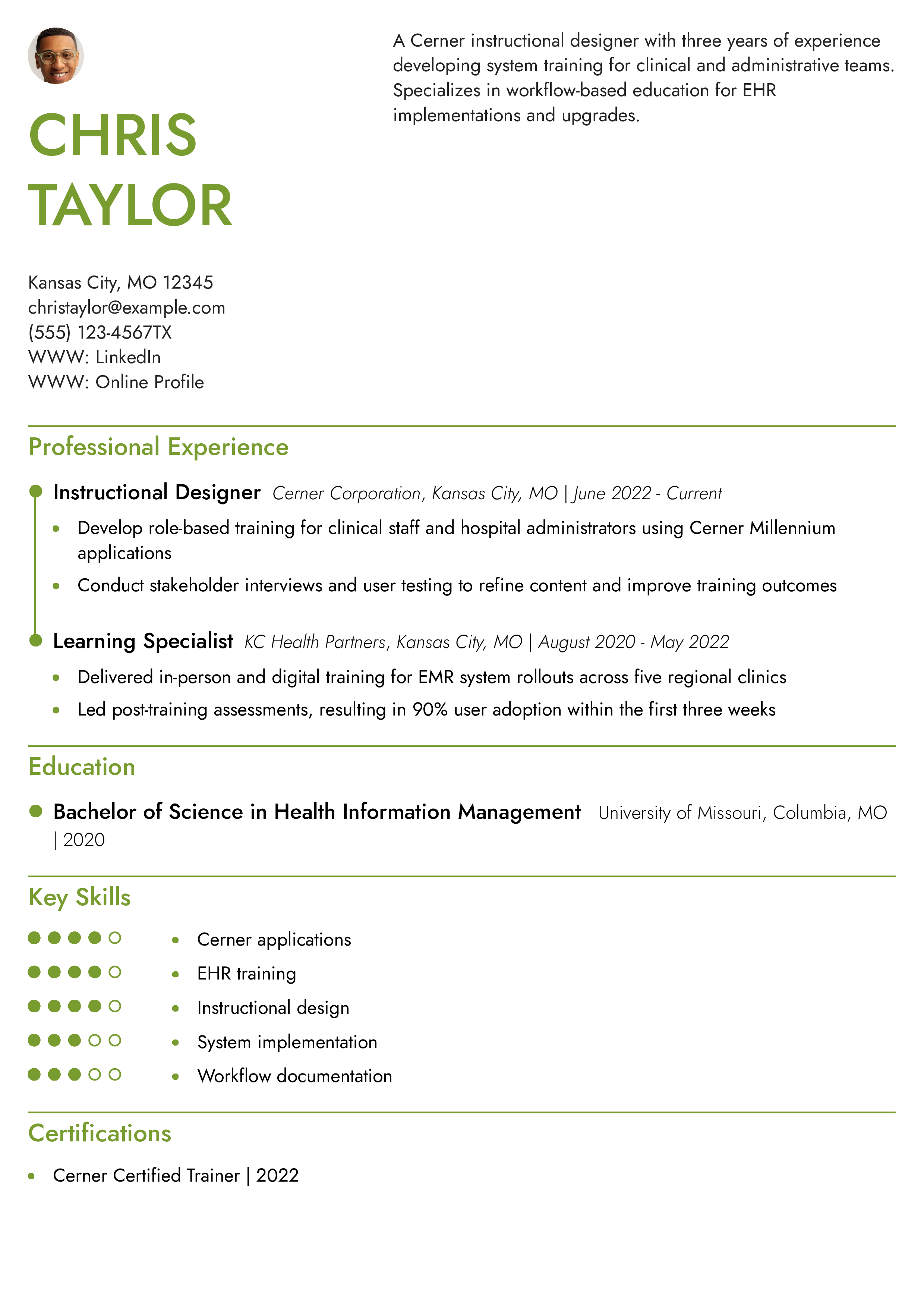 This resume clearly focuses on a specialized skill set in EHR systems. It highlights role-specific training outcomes and shows how instructional design supports clinical operations.