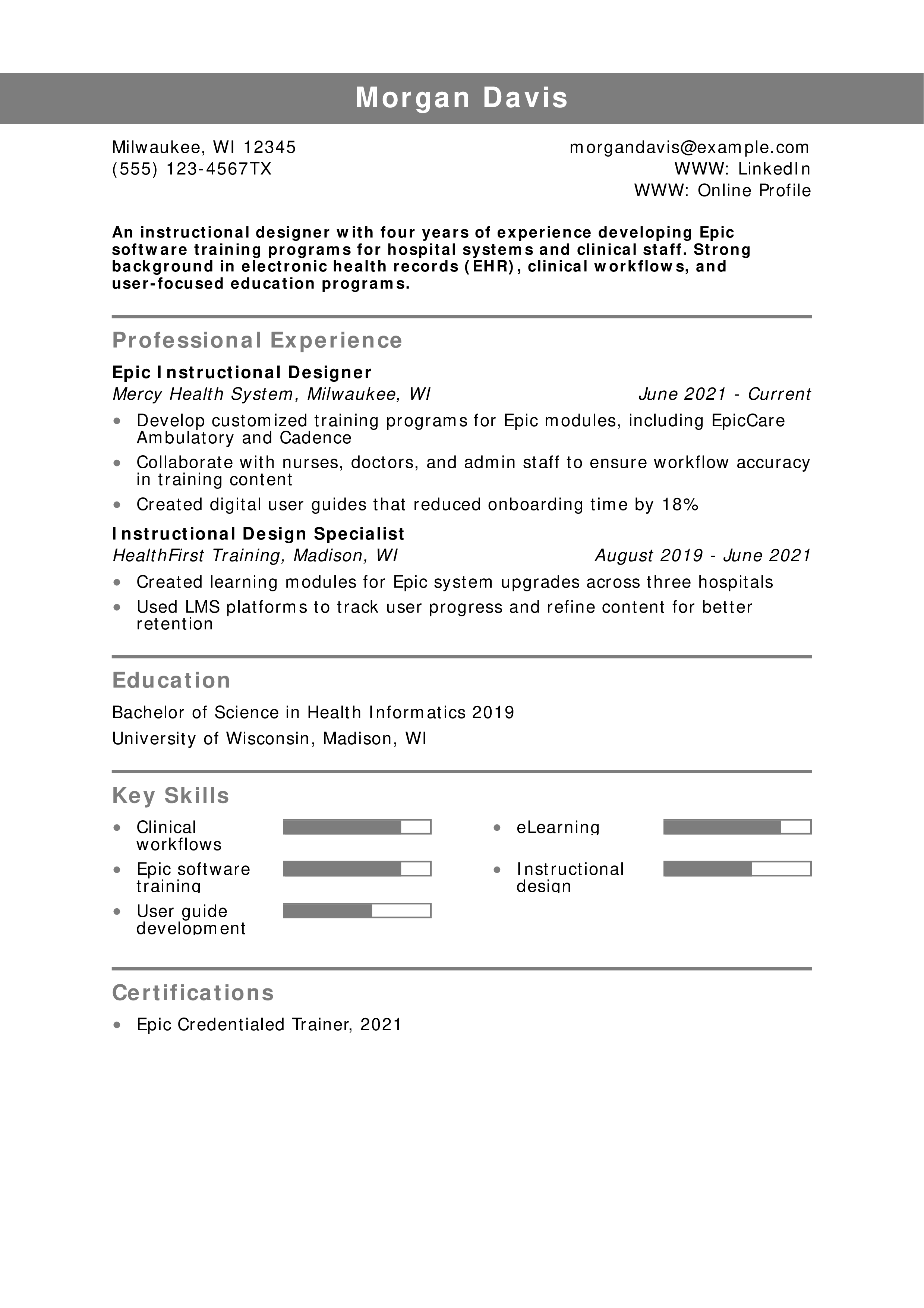 This resume directly connects the applicant's instructional design skills to Epic system training, a highly specialized niche. It also quantifies impact and shows collaboration with health care professionals.