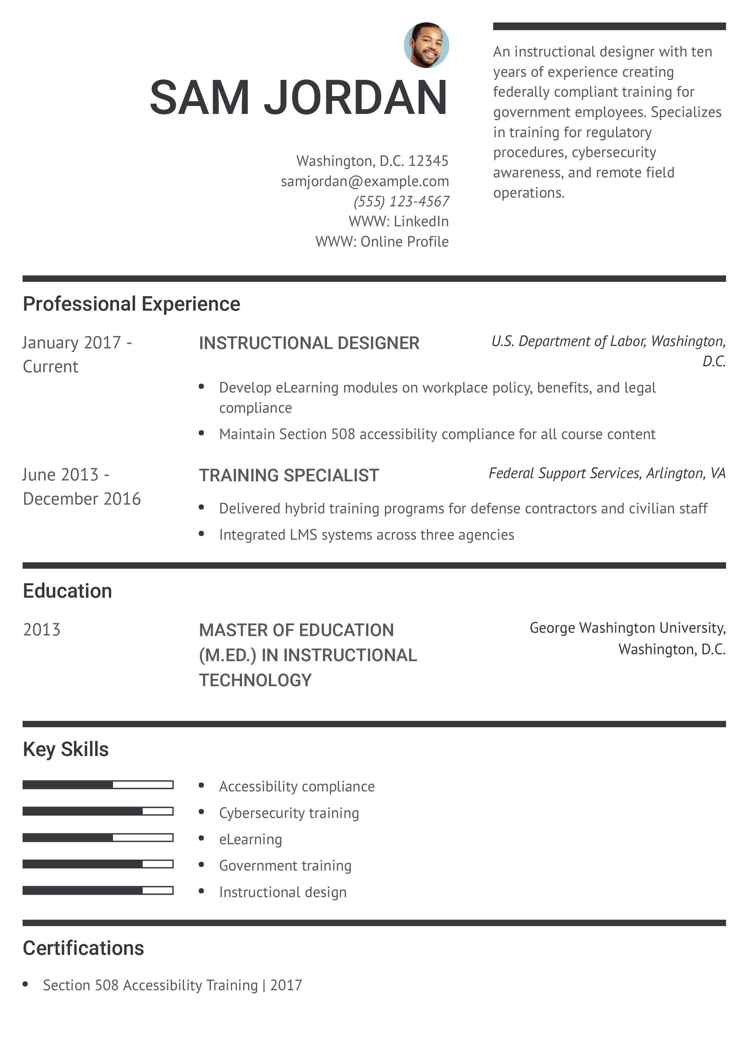 This resume demonstrates depth in government-specific instructional design, including compliance and accessibility. It communicates precision, policy knowledge, and digital training experience.
