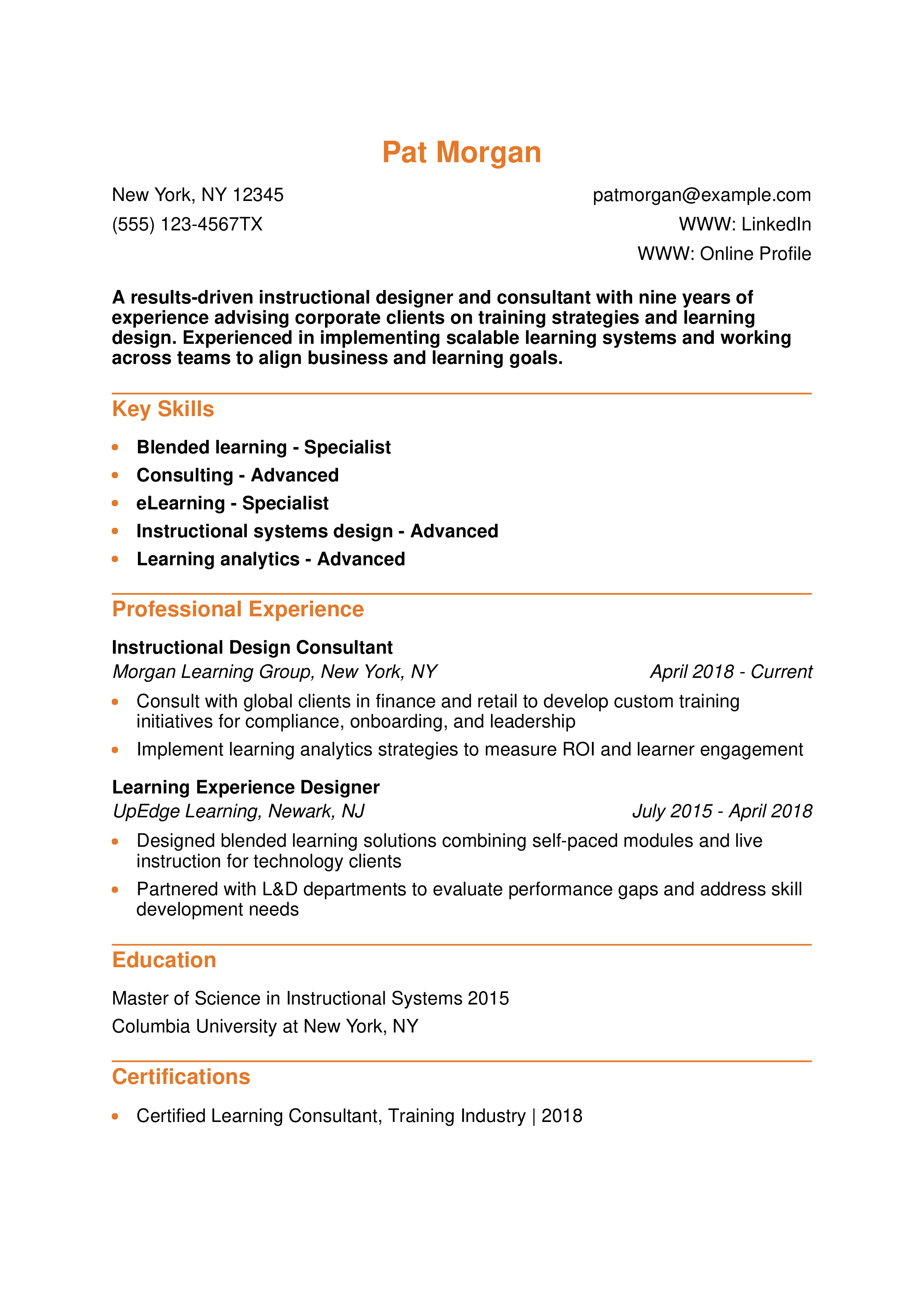 This resume does a great job of blending instructional design expertise with consulting work. It shows how the candidate drives impact at the business level, not just in the classroom.