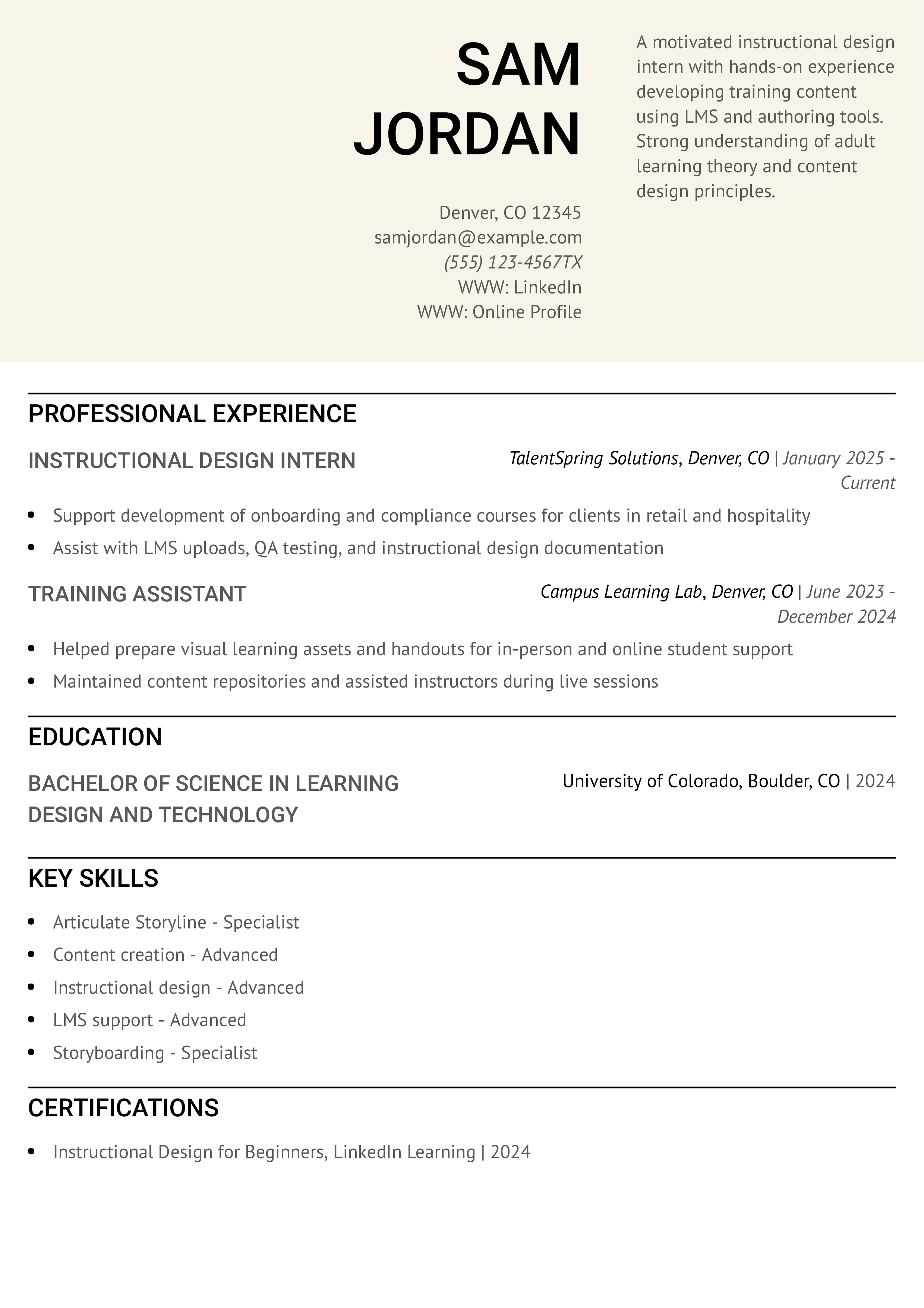 Yes, using an Instructional Designer resume example can provide guidance on structuring your resume, even if you’re at the beginning of your career. Focus on your internships, education, and skills that are transferable to the job you want. A strong entry-level resume example will highlight your potential and willingness to learn, making your limited experience a benefit.