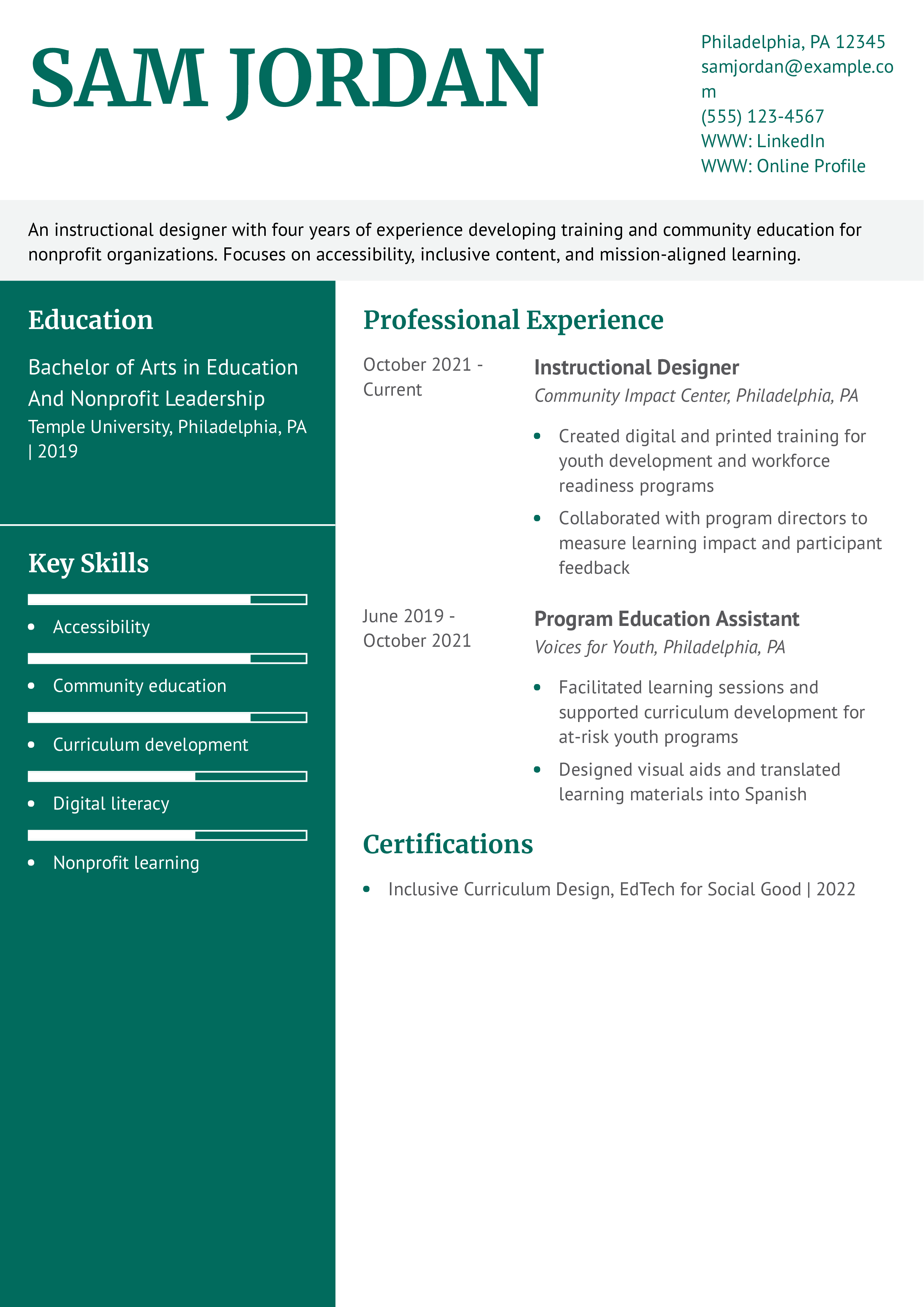 This resume highlights mission-driven work in nonprofit education. It connects learning design to social impact and showcases community-focused outcomes.