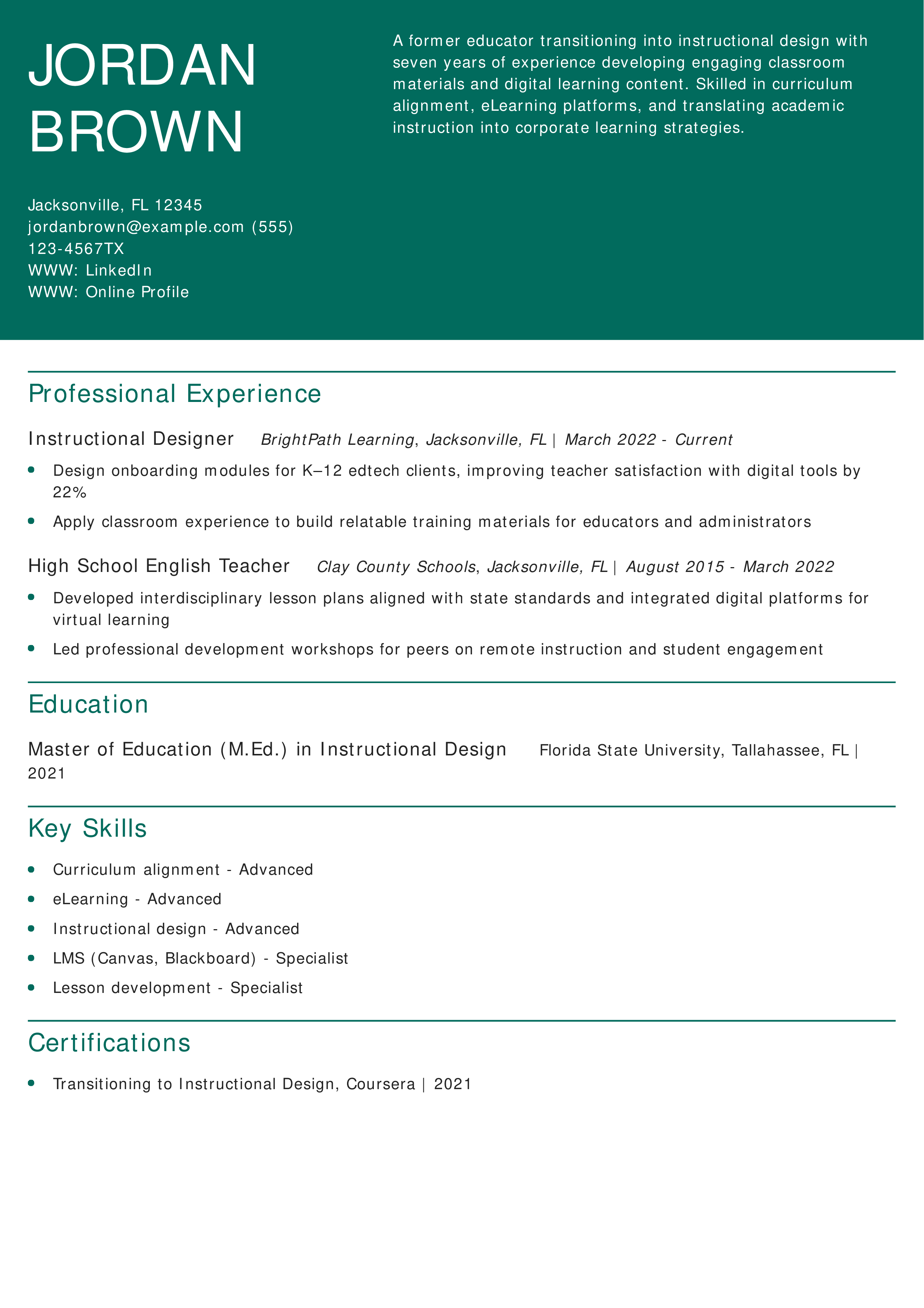 This resume demonstrates how teaching experience translates into instructional design, especially in curriculum and technology integration. It also shows a clear transition with relevant certifications and advanced education.