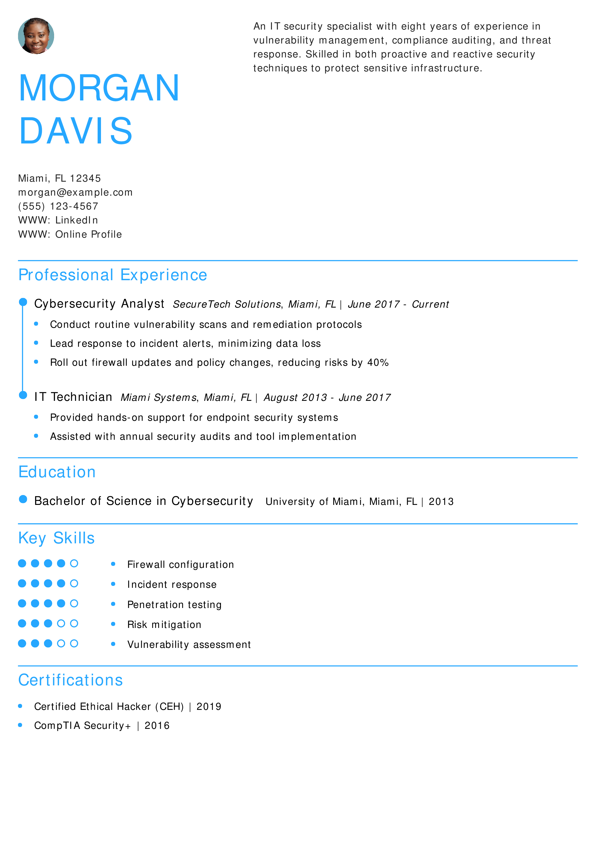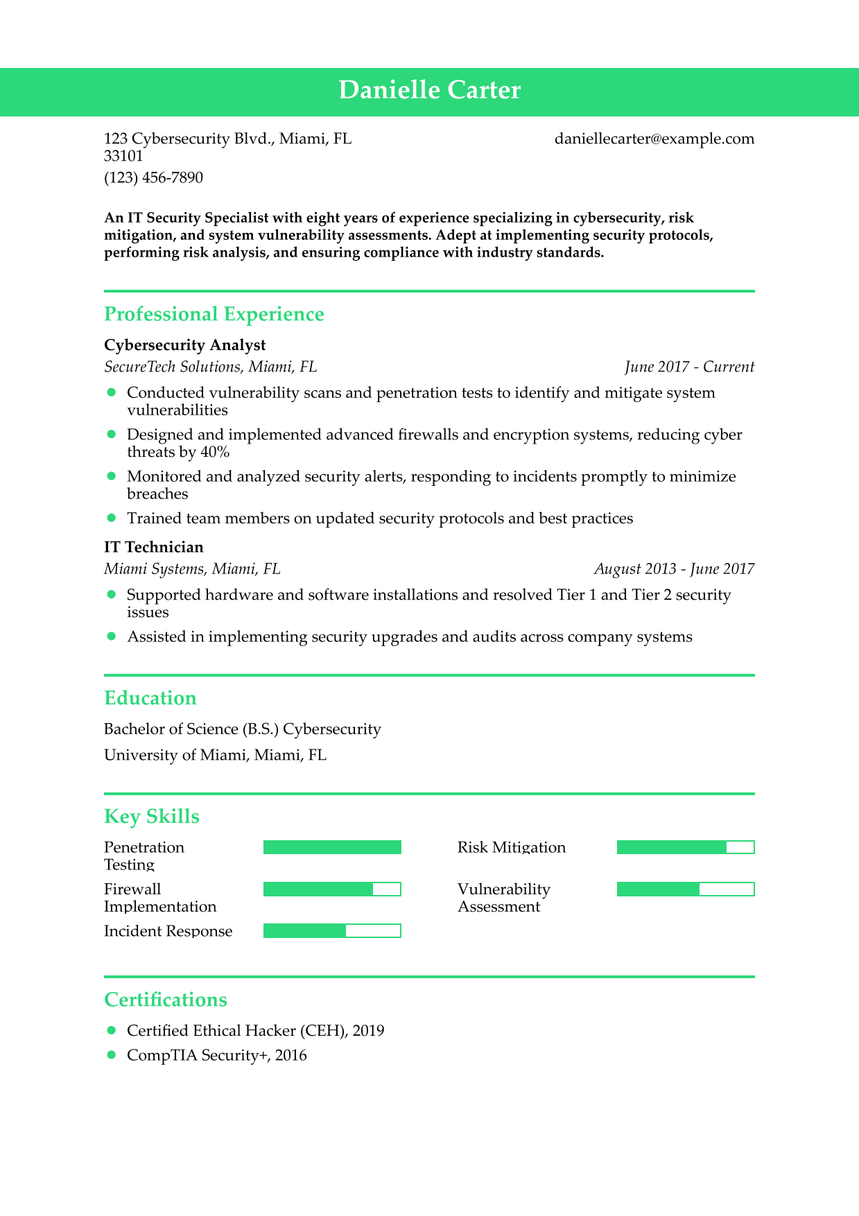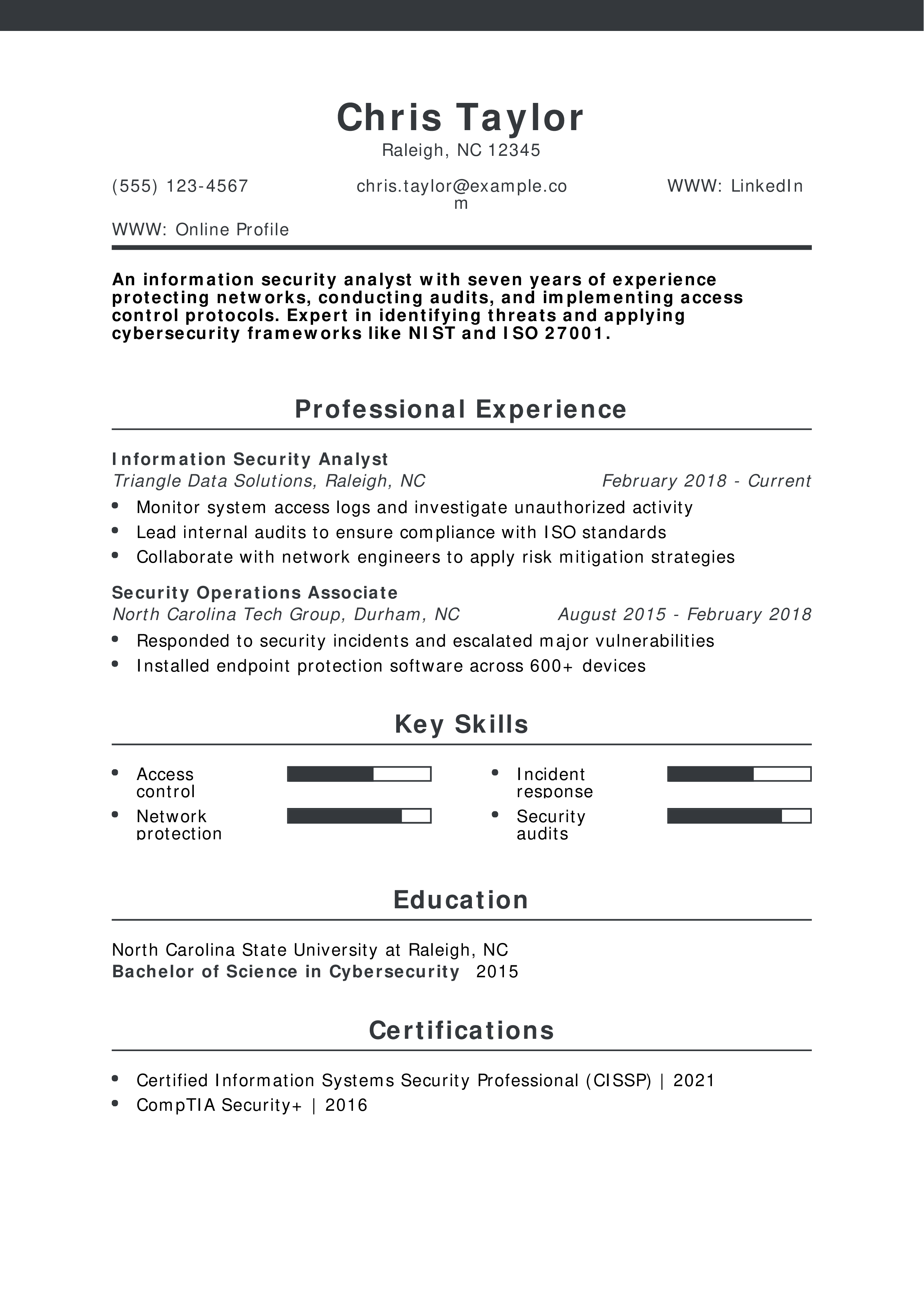 This resume emphasizes security certifications and experience with risk analysis. For more on how to present this type of technical expertise, check out soft skills for a resume.