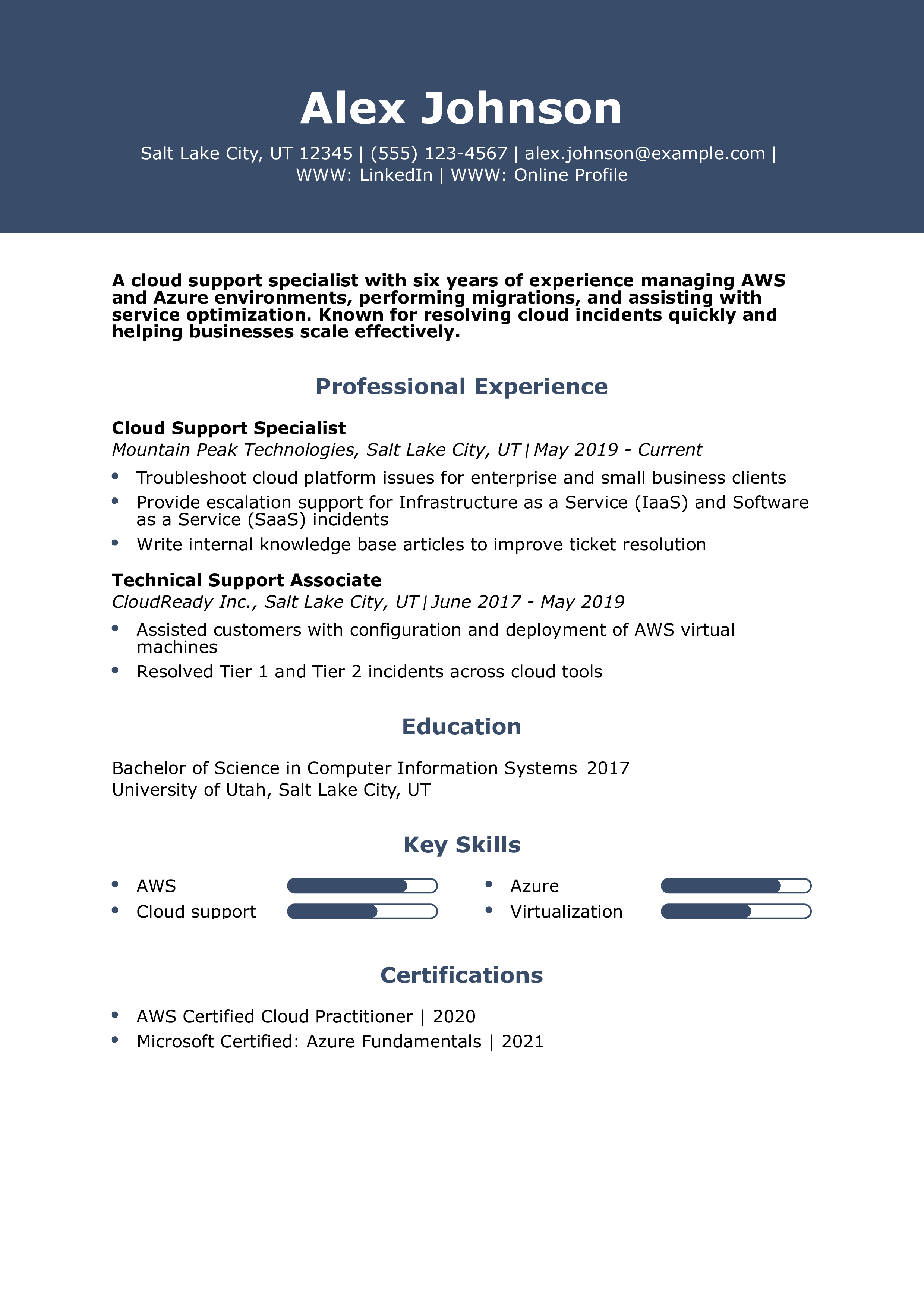 This resume highlights both technical and customer-facing cloud experience. To improve how your technical knowledge is presented, see how to list certifications on a resume.