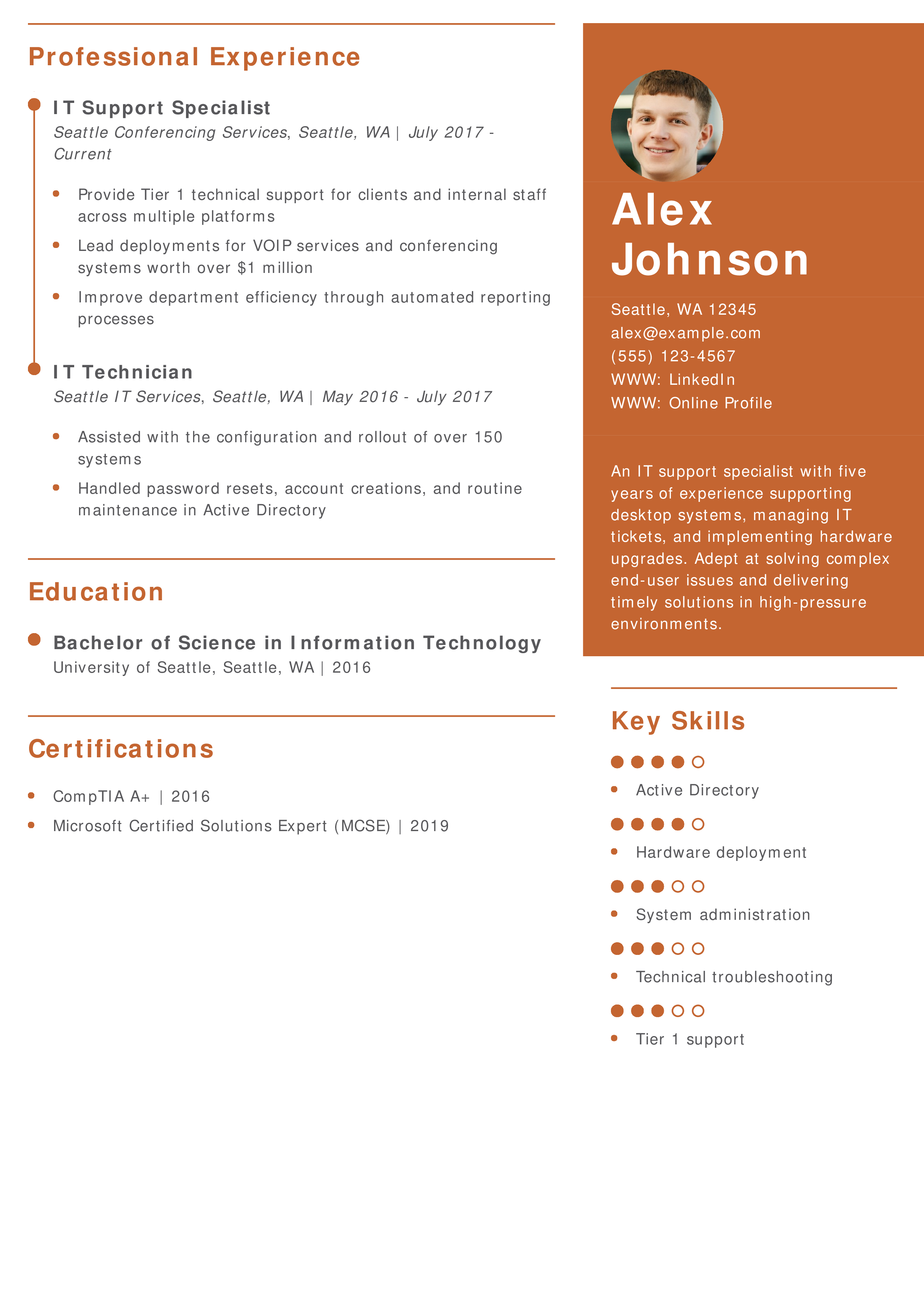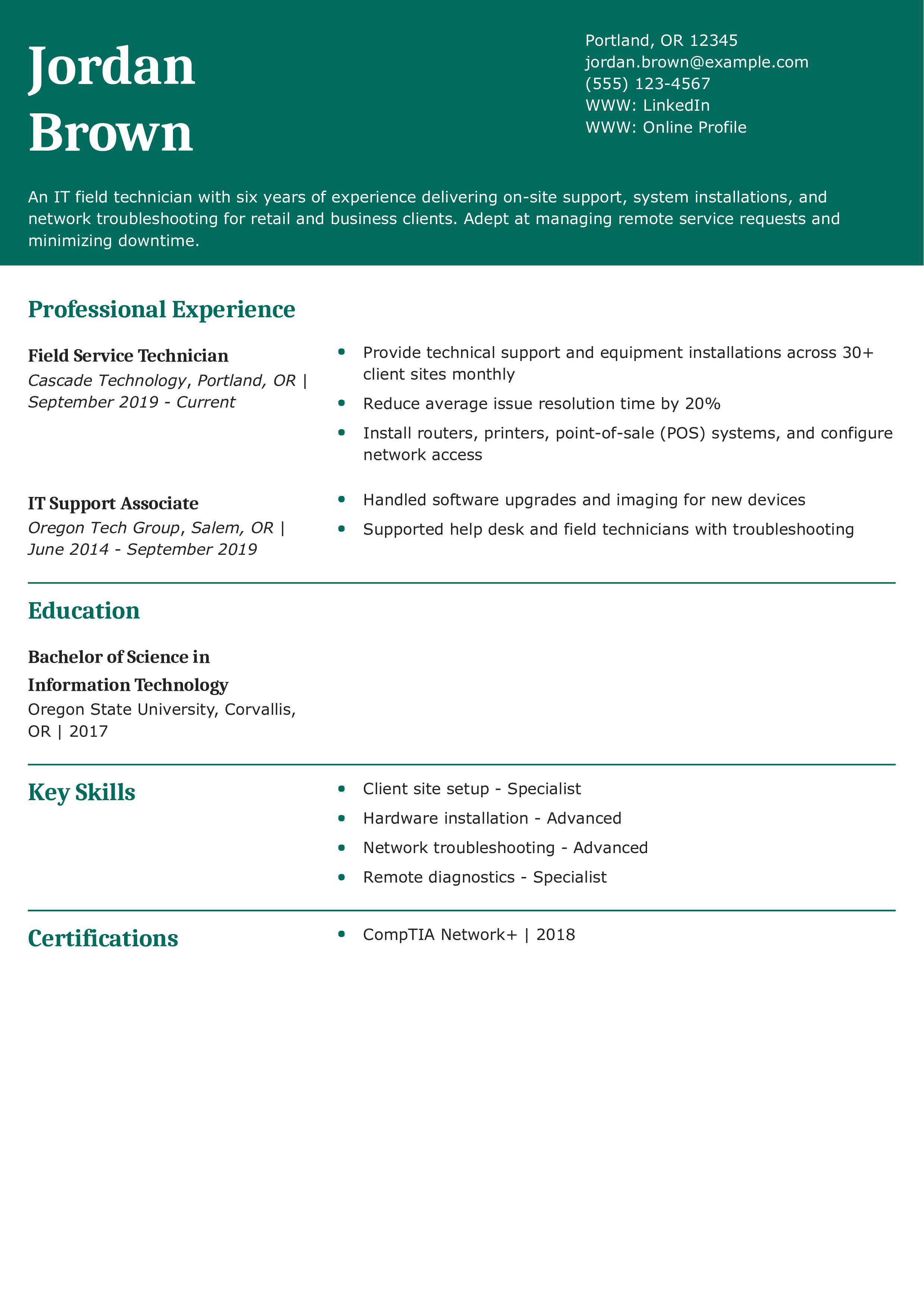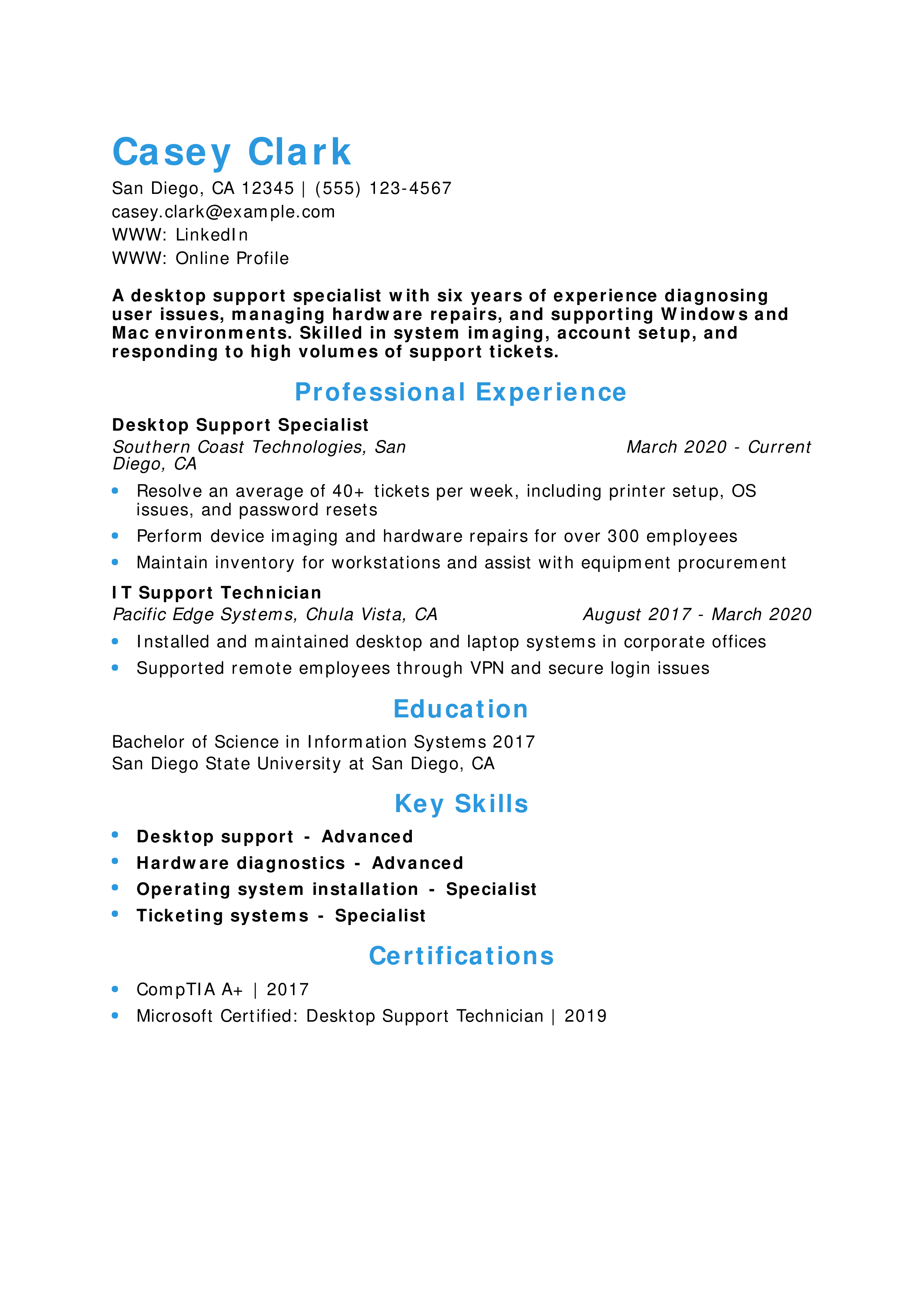 Hiring managers want to see tangible results from your work history, so provide specific details and insights to paint a clearer picture of your career experience. For example, if you were leading an installation project for a client account, clarify the number of devices you were deploying. If you managed the budget for your IT department, be sure to include a monetary figure. And if you created a knowledge base to reduce ticket resolution times, quantify this accomplishment with hard data.