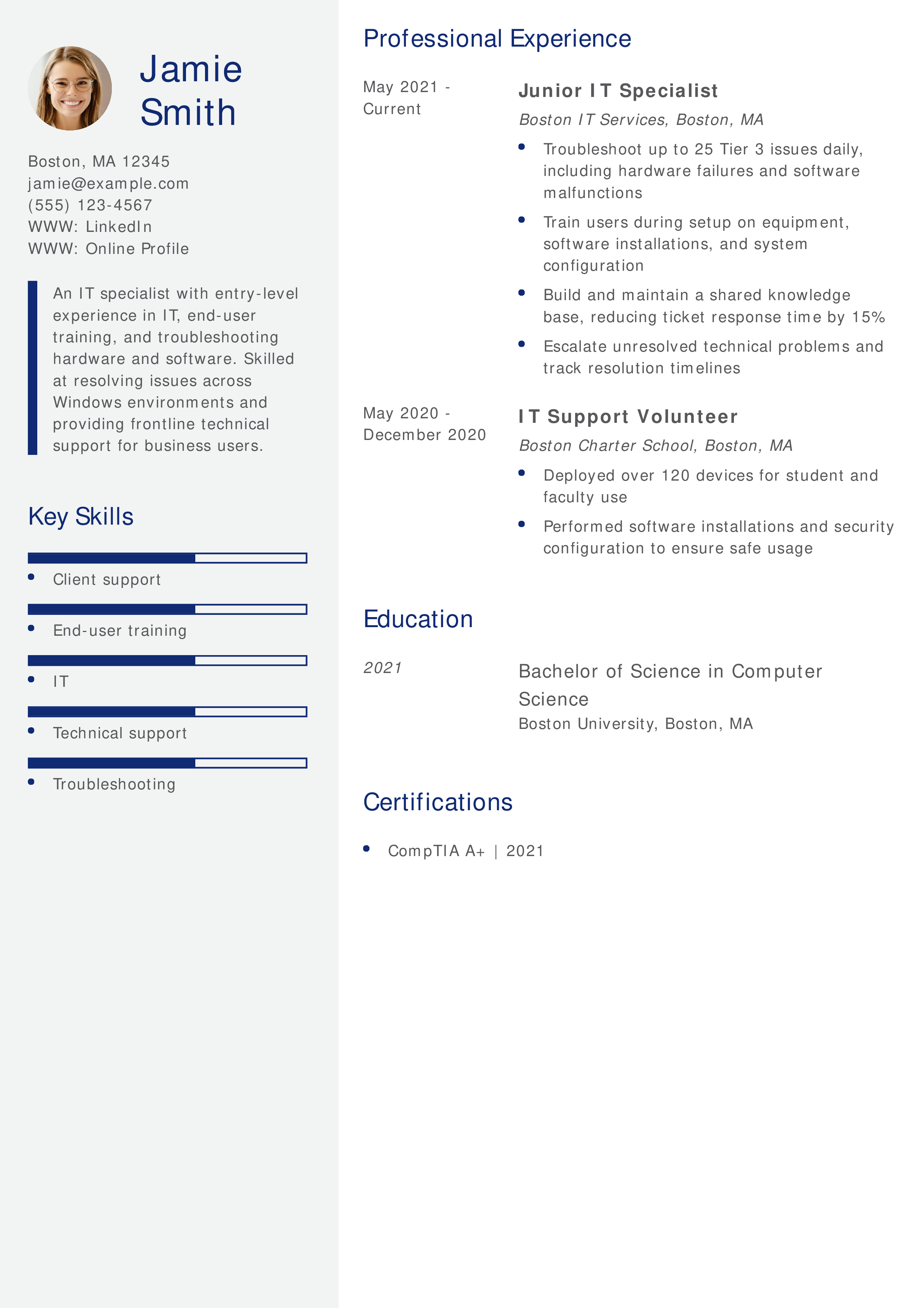 This resume is effective because it shows direct, hands-on experience with real user environments, even in a support or volunteer role. It uses action verbs and measurable outcomes to show impact. For more tips on crafting a first-time resume, visit how to make a resume.