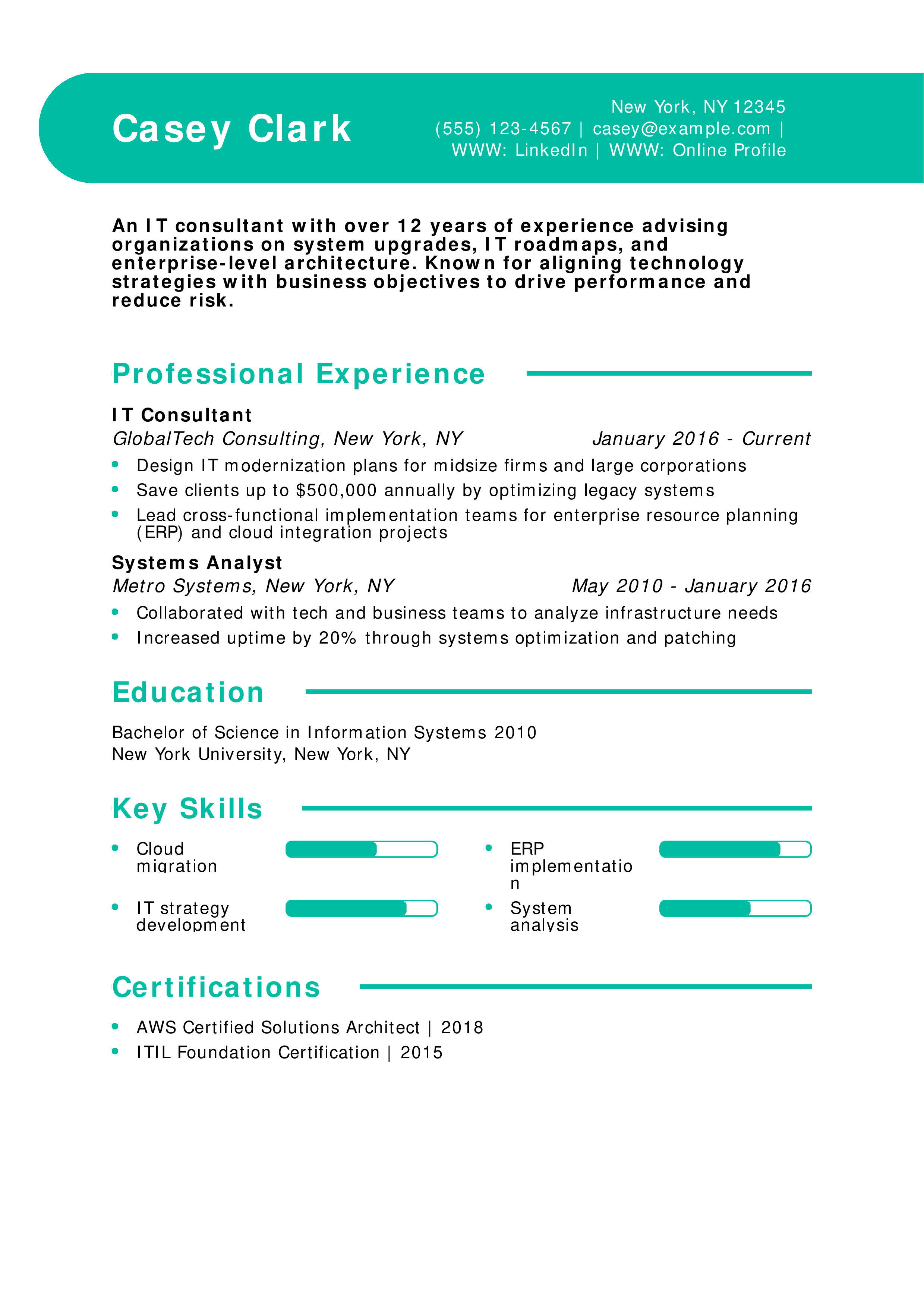This resume highlights the ability to connect IT and business strategy, showcasing analytical skills with measurable outcomes. To improve your resume’s summary, check out resume summary examples.