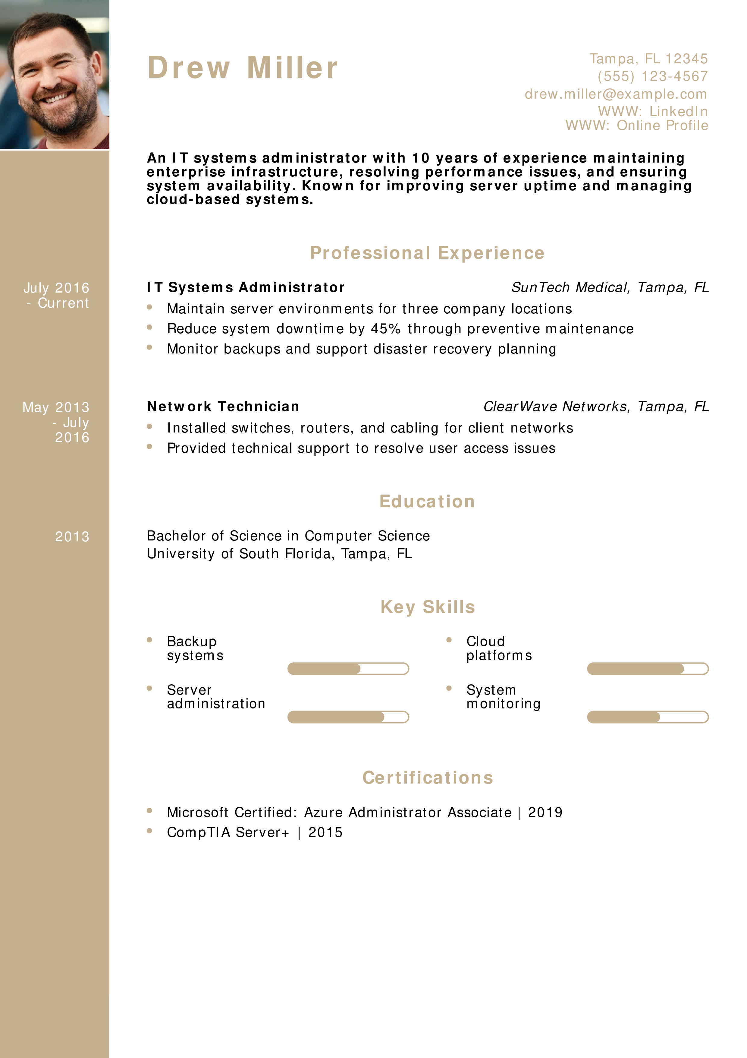 The traditional reverse chronological resume format is ideal for IT specialists. This approach ensures that your most recent and relevant work experience is featured towards the top of your document. Functional resume formats should be avoided, even at the entry level, as skill-based resumes aren’t designed for detailed bullet points. In this situation, place your skills above your professional experience while providing thoughtful bullet points for your academic projects and previous jobs.