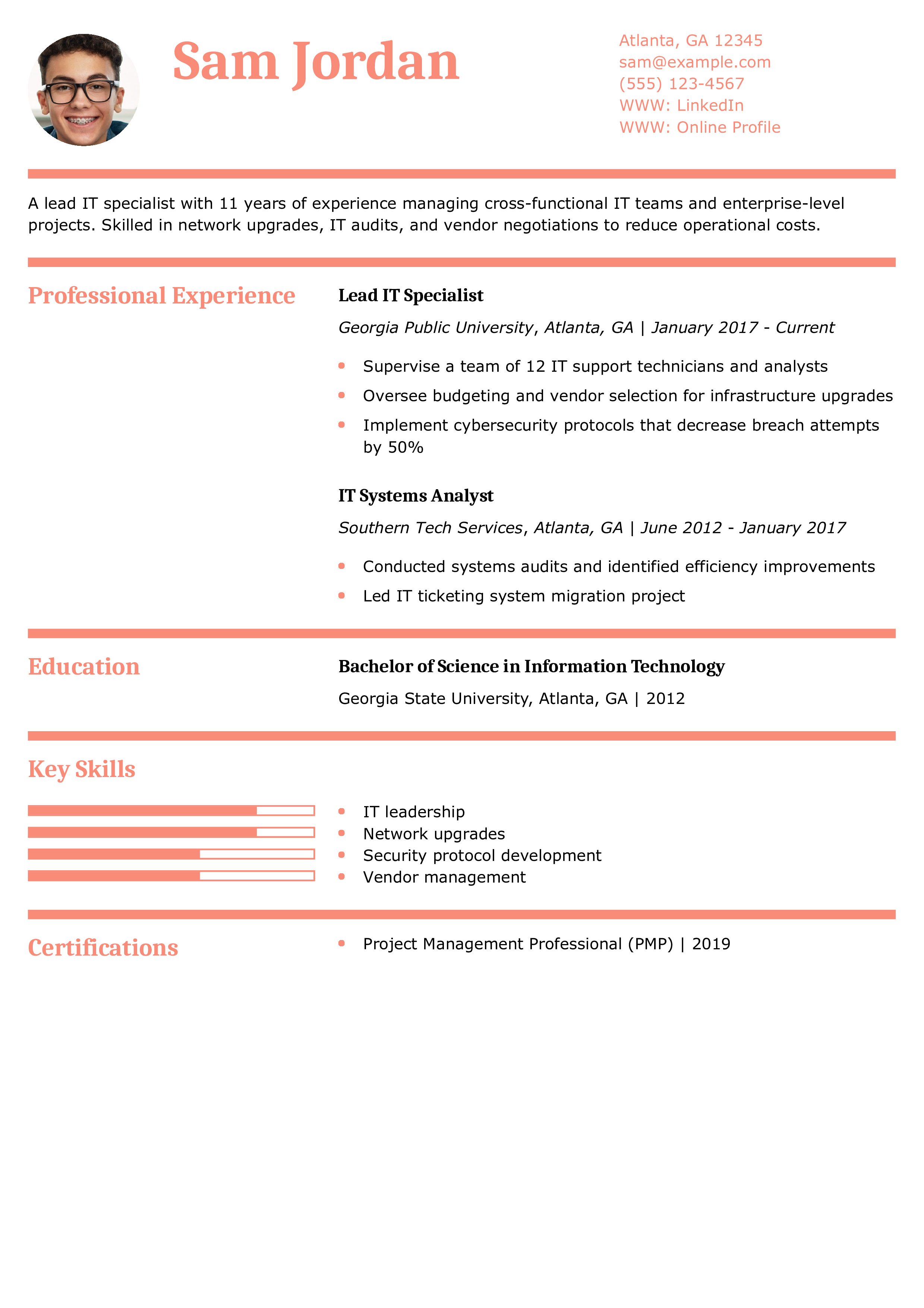 Once you have a hiring manager’s attention, the next objective is to keep it, which is where the professional experience section comes in. List your jobs and show how your achievements in those positions have made you the ideal candidate for your next IT specialist job. Use hard numbers, monetary figures, and metrics to enhance the impact of your bullet points.