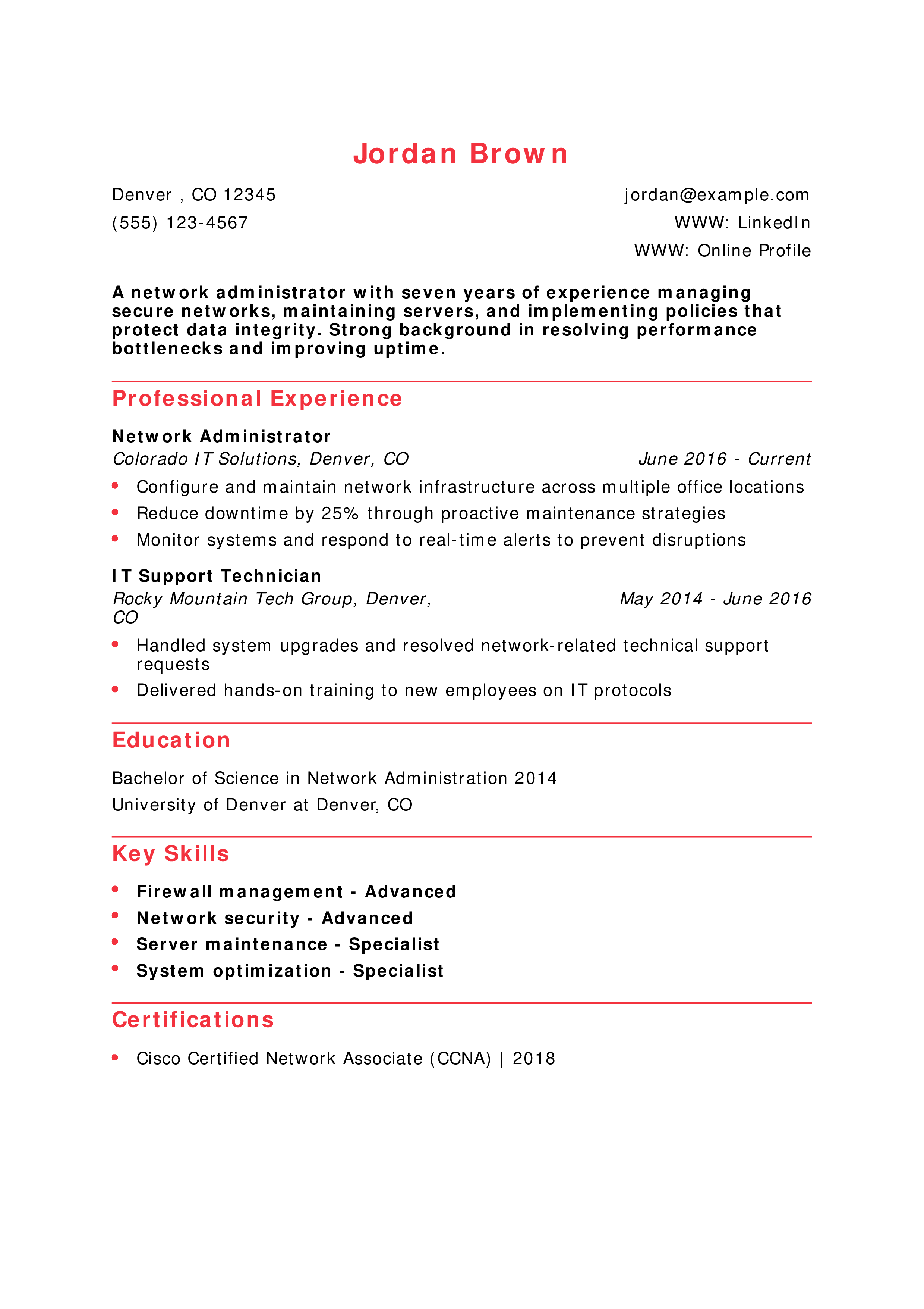 This resume clearly demonstrates technical competency in core areas of networking and uses measurable improvements like downtime reduction. For font tips that make your resume easier to scan, visit best font for a resume.