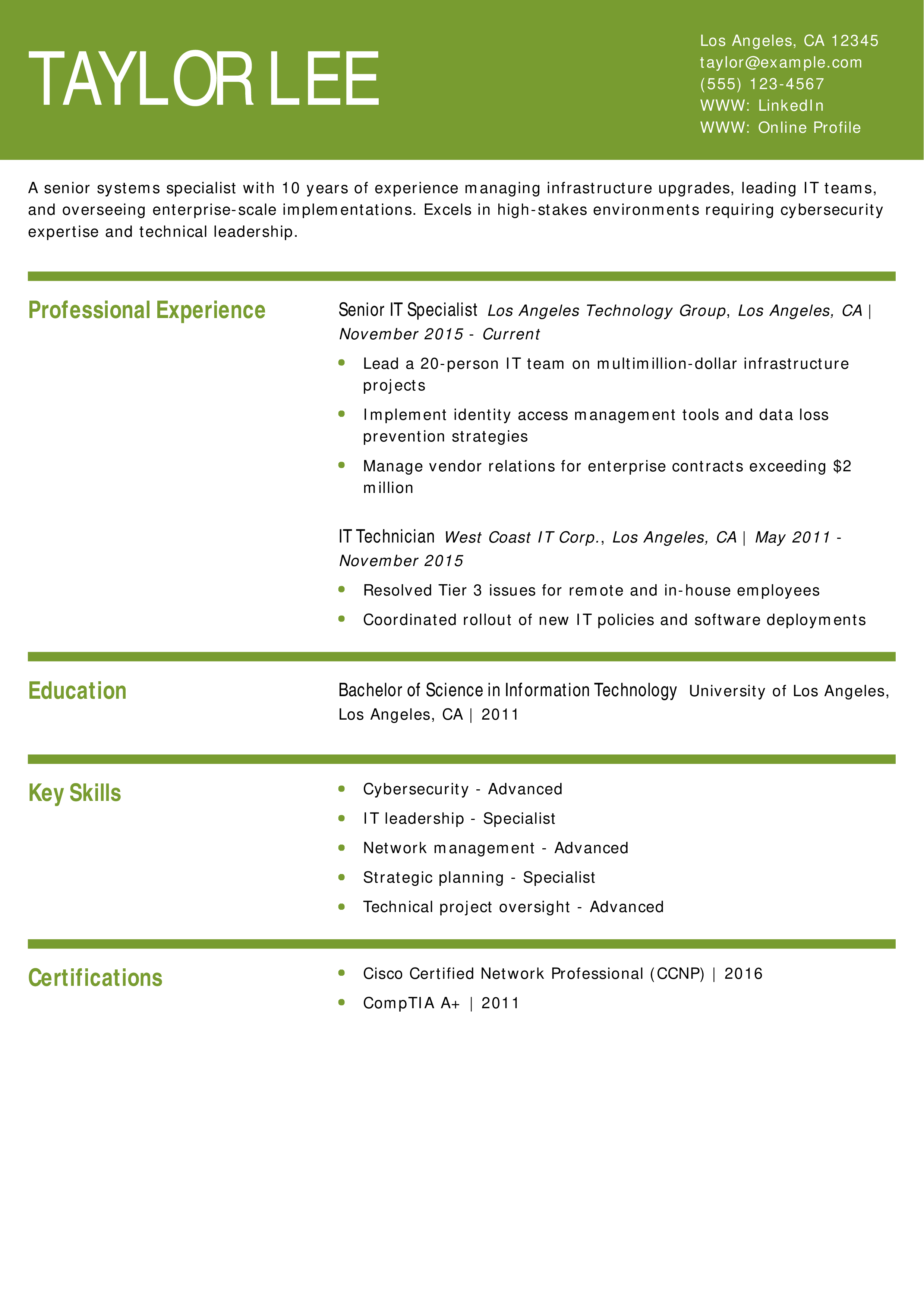 For example, if a company is looking for an IT specialist with a strong background in cybersecurity, emphasize your knowledge of VPNs, threat detection, and network security. If an organization is looking for a technical professional who excels in cross-functional collaboration, highlight your ability to translate complex concepts into accessible language for team members, stakeholders, and end users. Tailoring your resume towards individual job descriptions will greatly increase your odds of landing the interview.