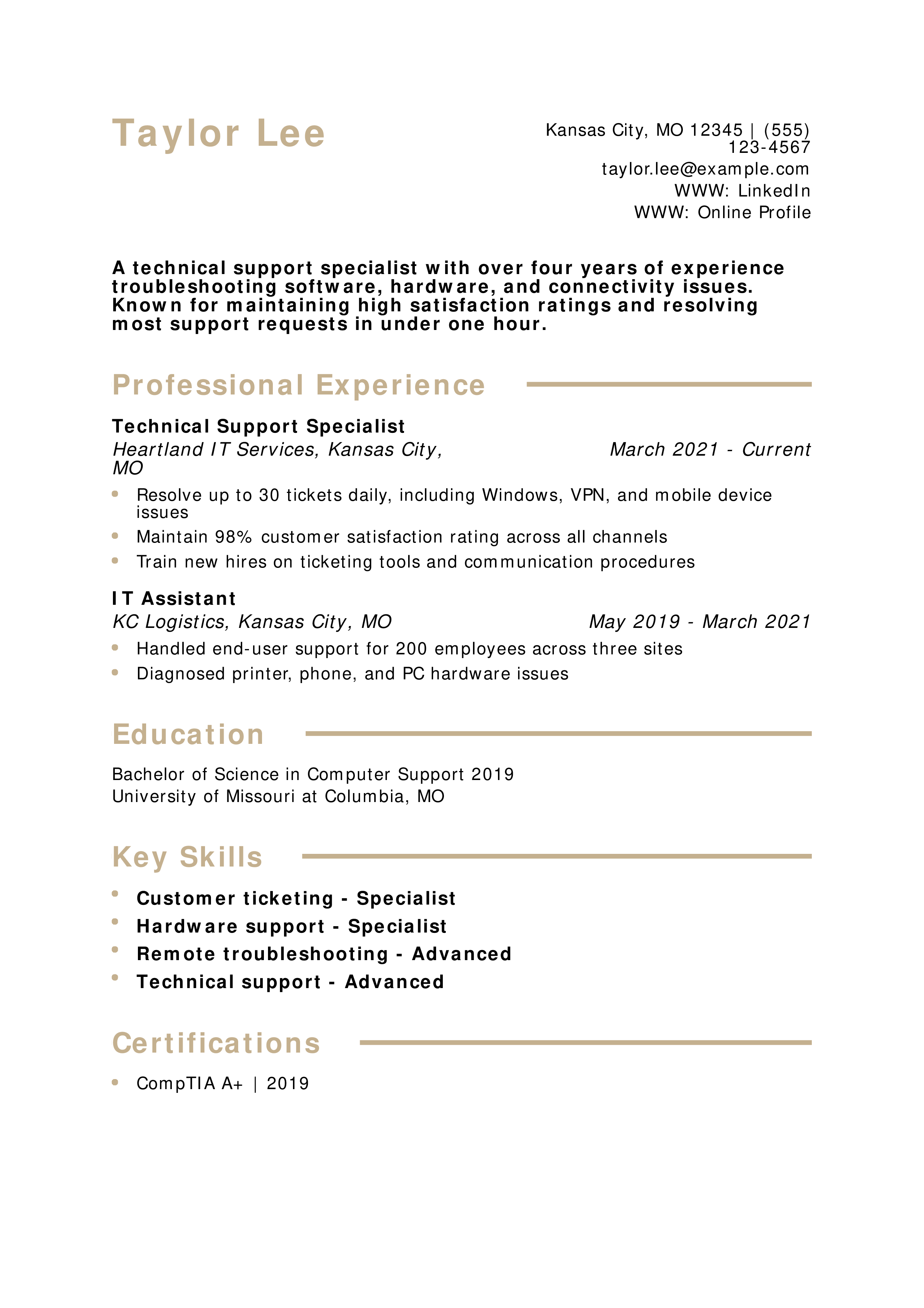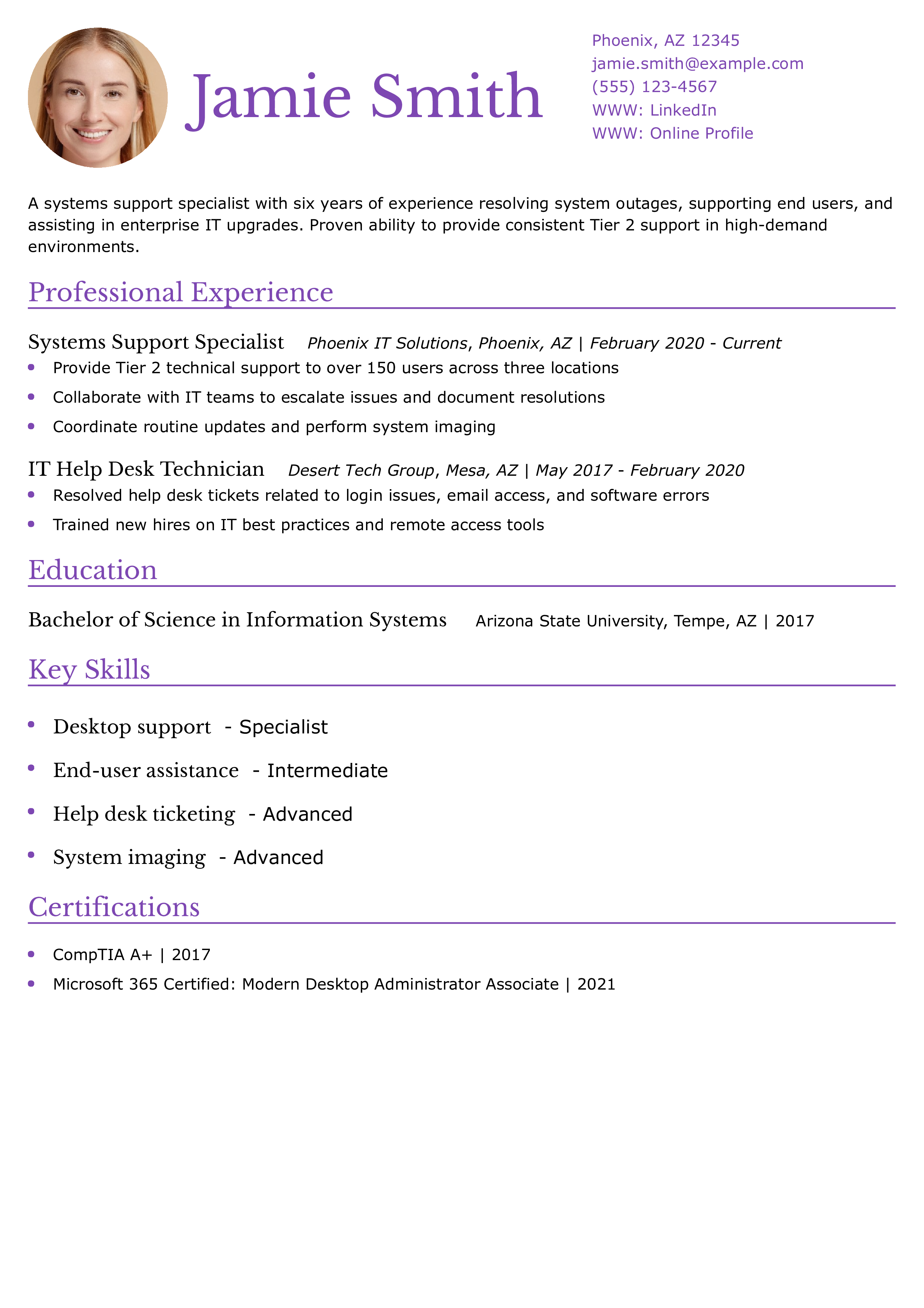 This resume clearly outlines the candidate’s support experience and shows progression from help desk to specialist. Learn how to structure your experience section using resume outline examples.