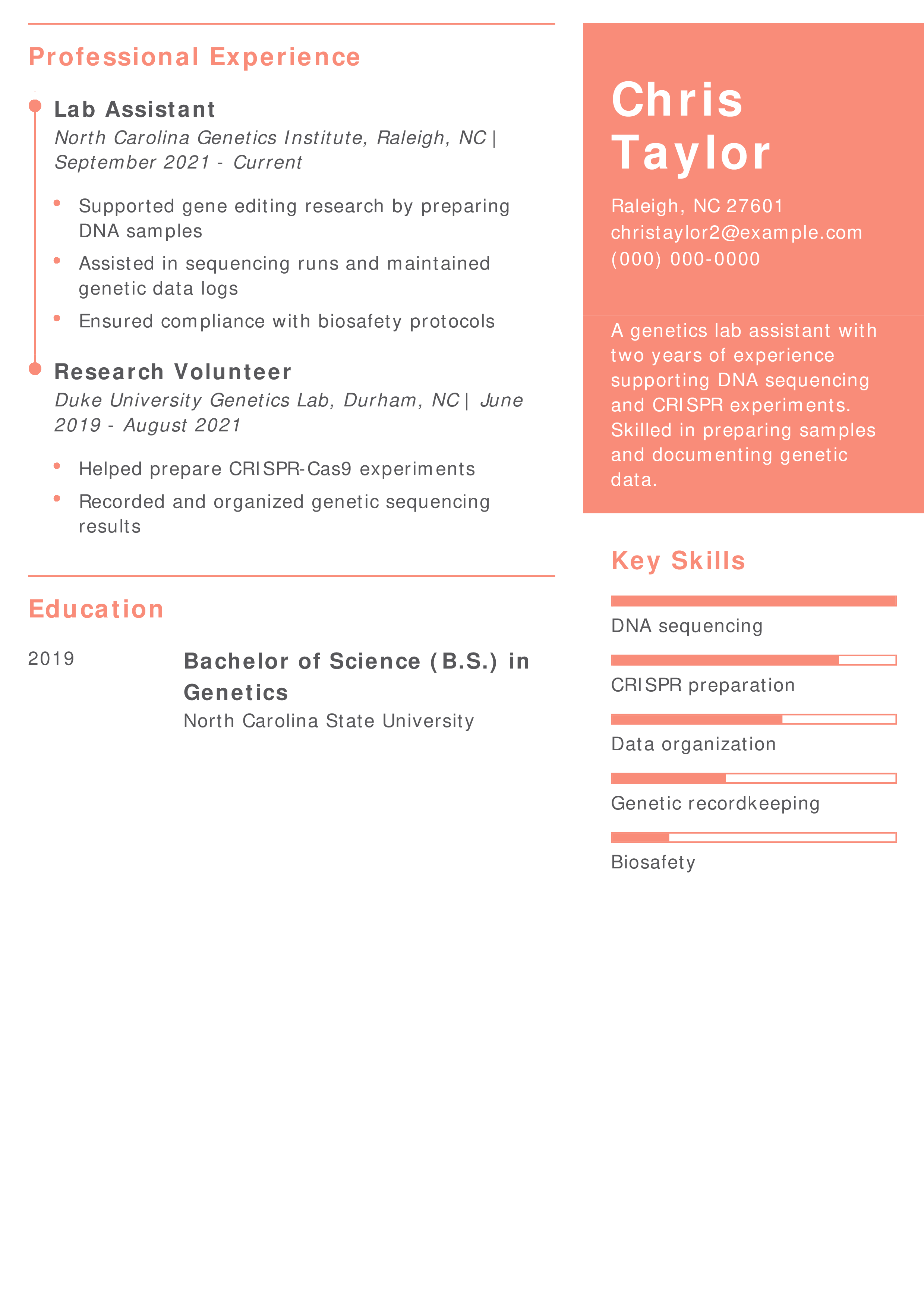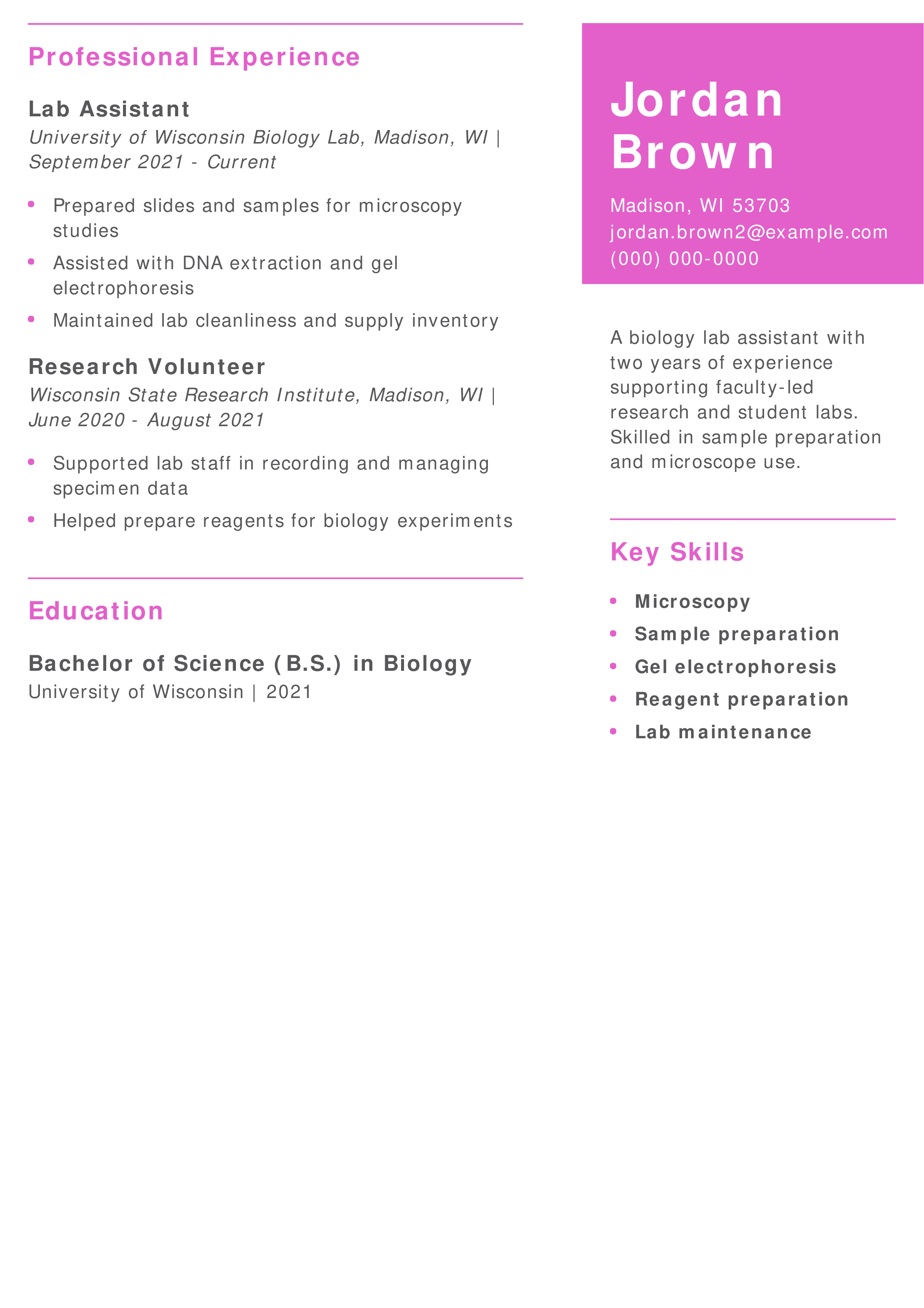 This resume is strong because it emphasizes biology-specific lab techniques and connects academic experience to lab assistant roles. Learn more about highlighting coursework at how to list relevant coursework on a resume.