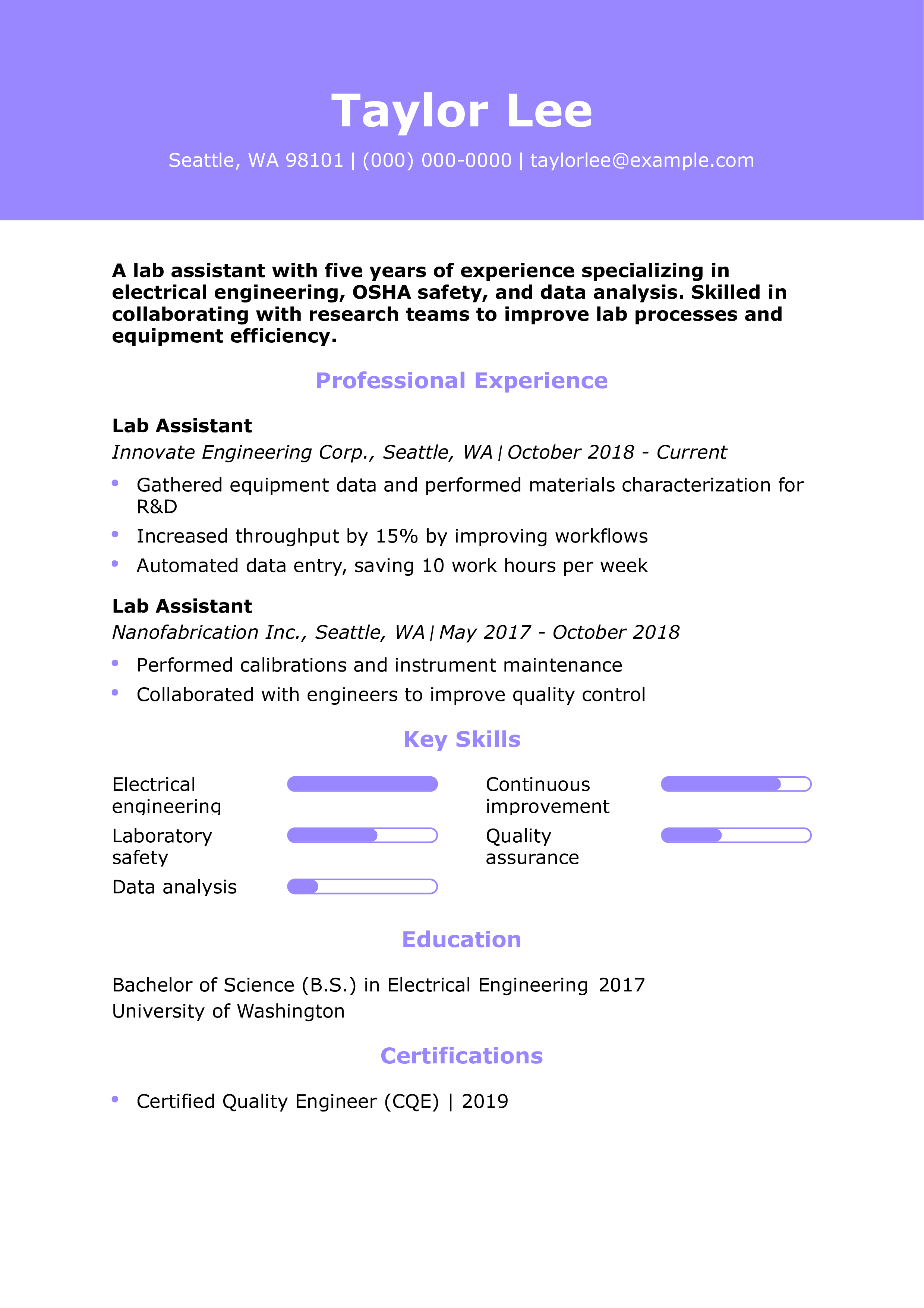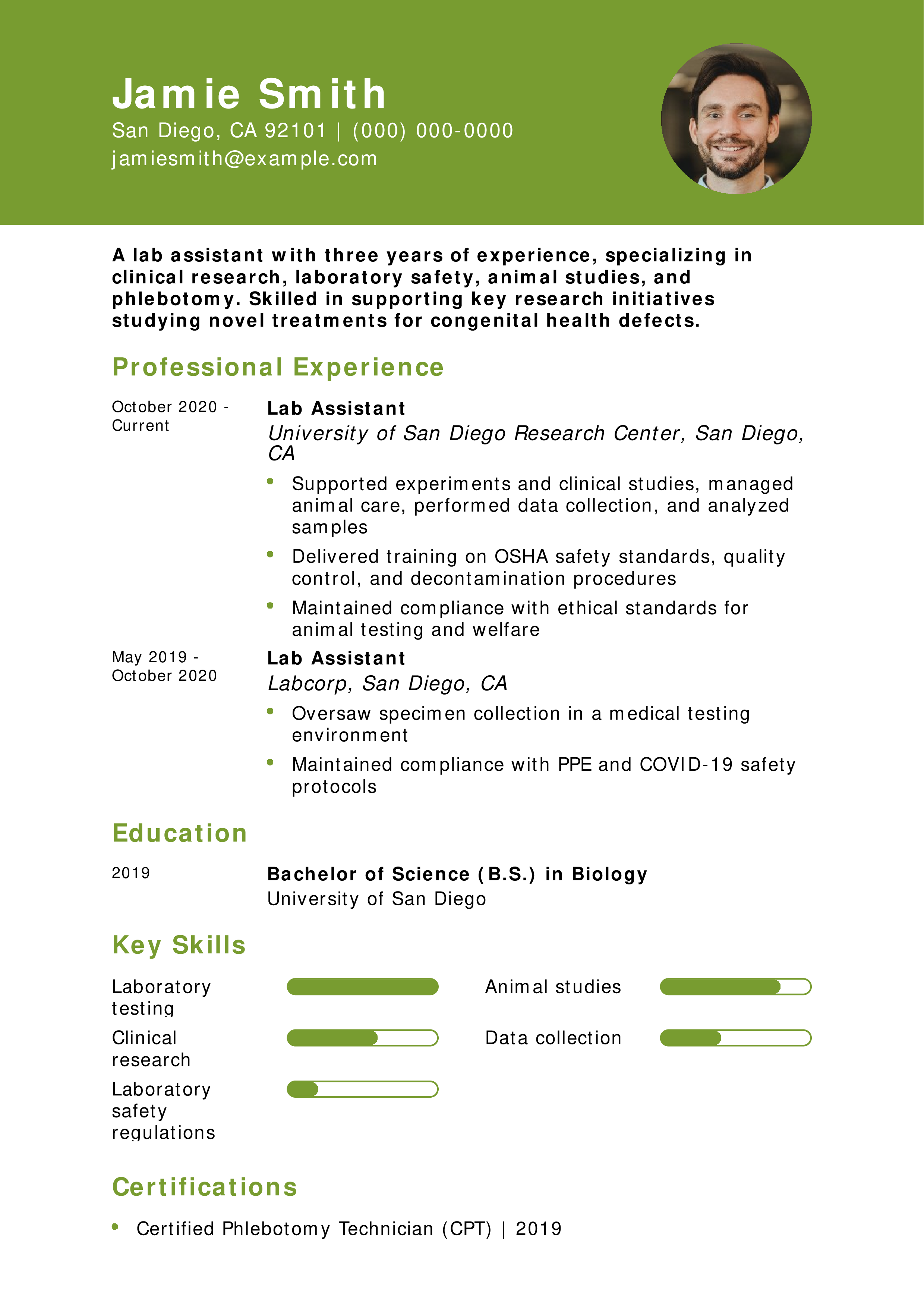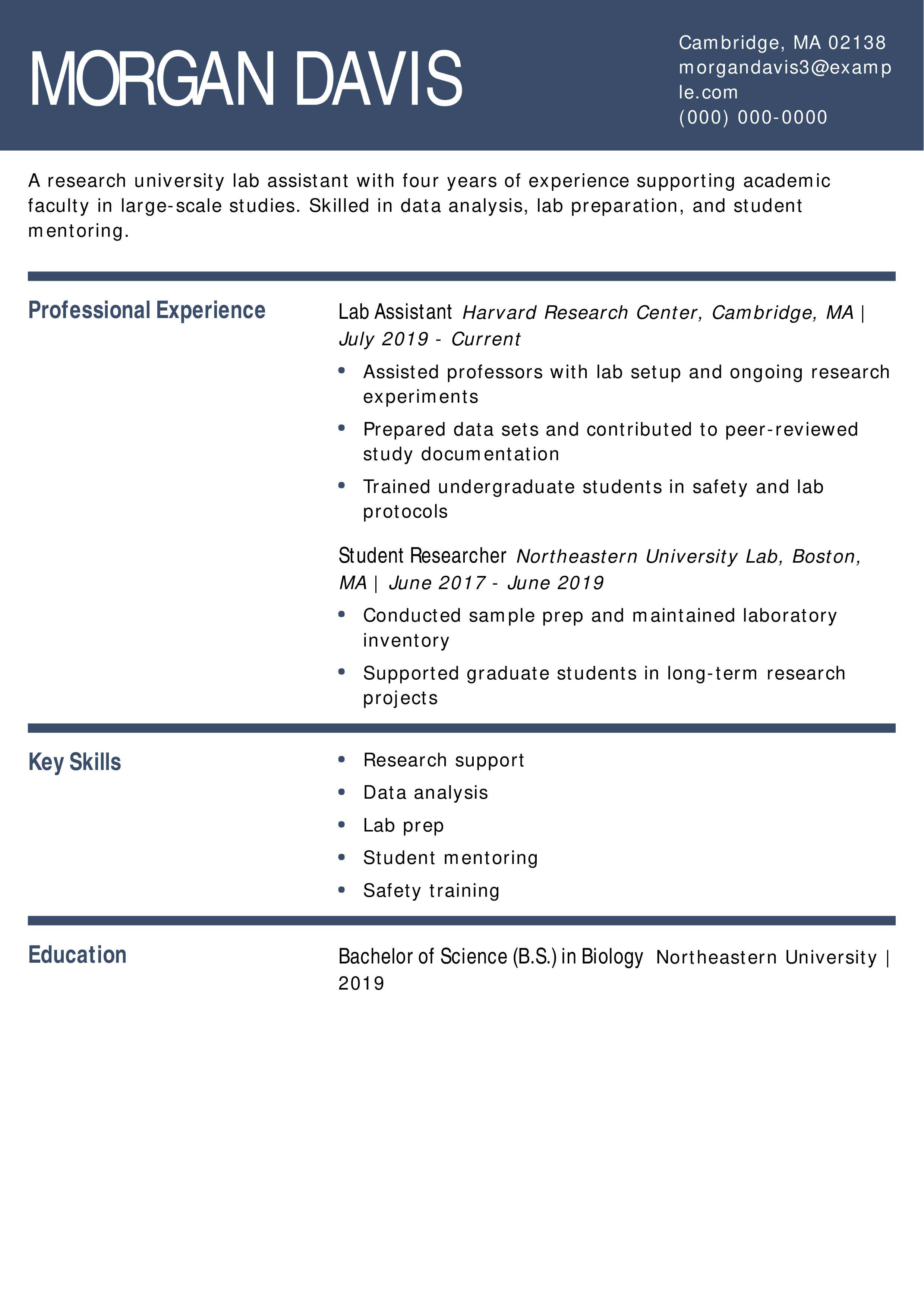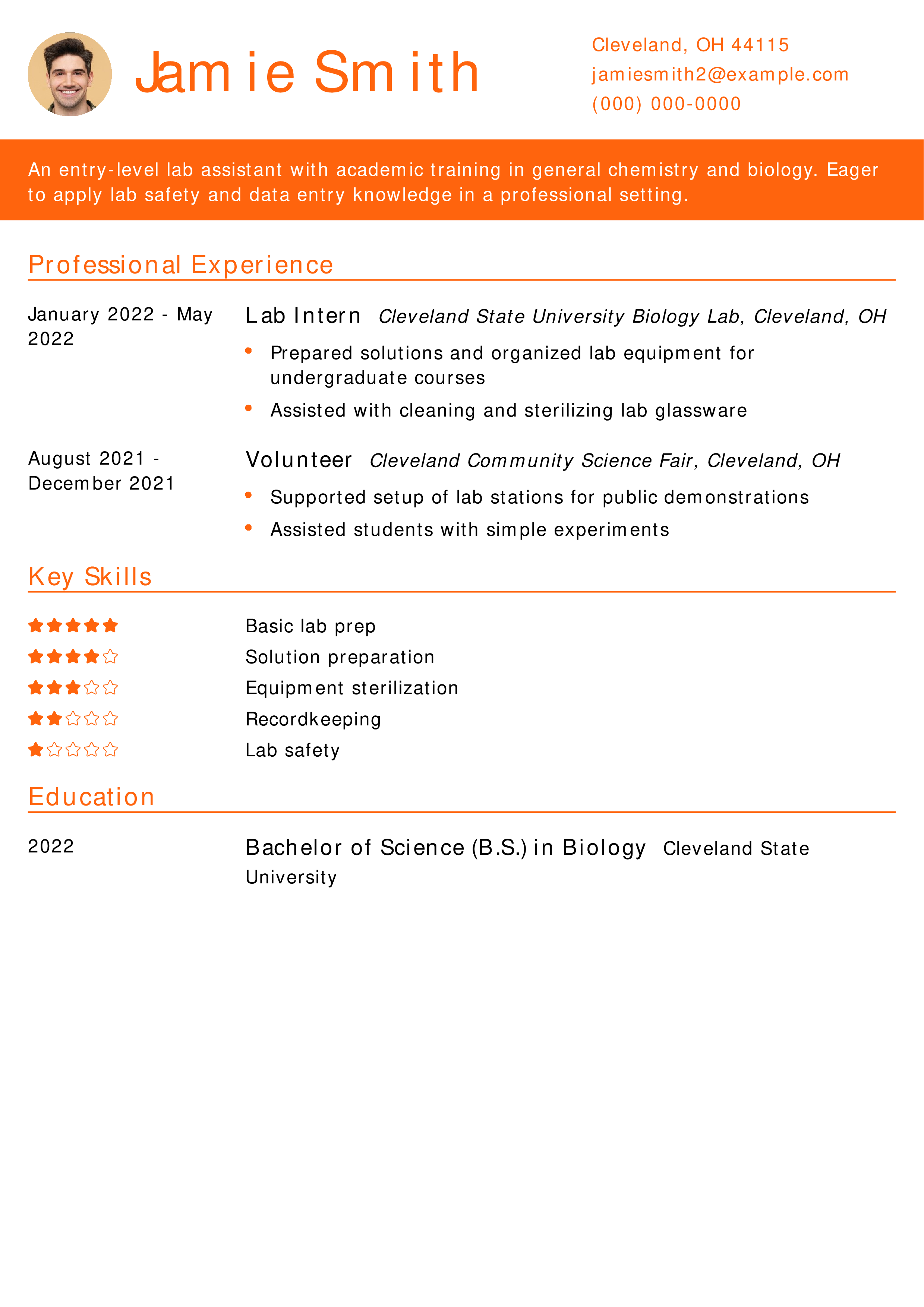 Reverse chronological is the ideal format for lab assistants. This approach places your most recent and relevant work history at the forefront of your document while showcasing your career progression. If you’re at the entry-level or making a career transition, place your skills and academic projects above your professional experience. Be sure to avoid functional resumes, as you still need to craft detailed bullet points to grab the attention of prospective employers.