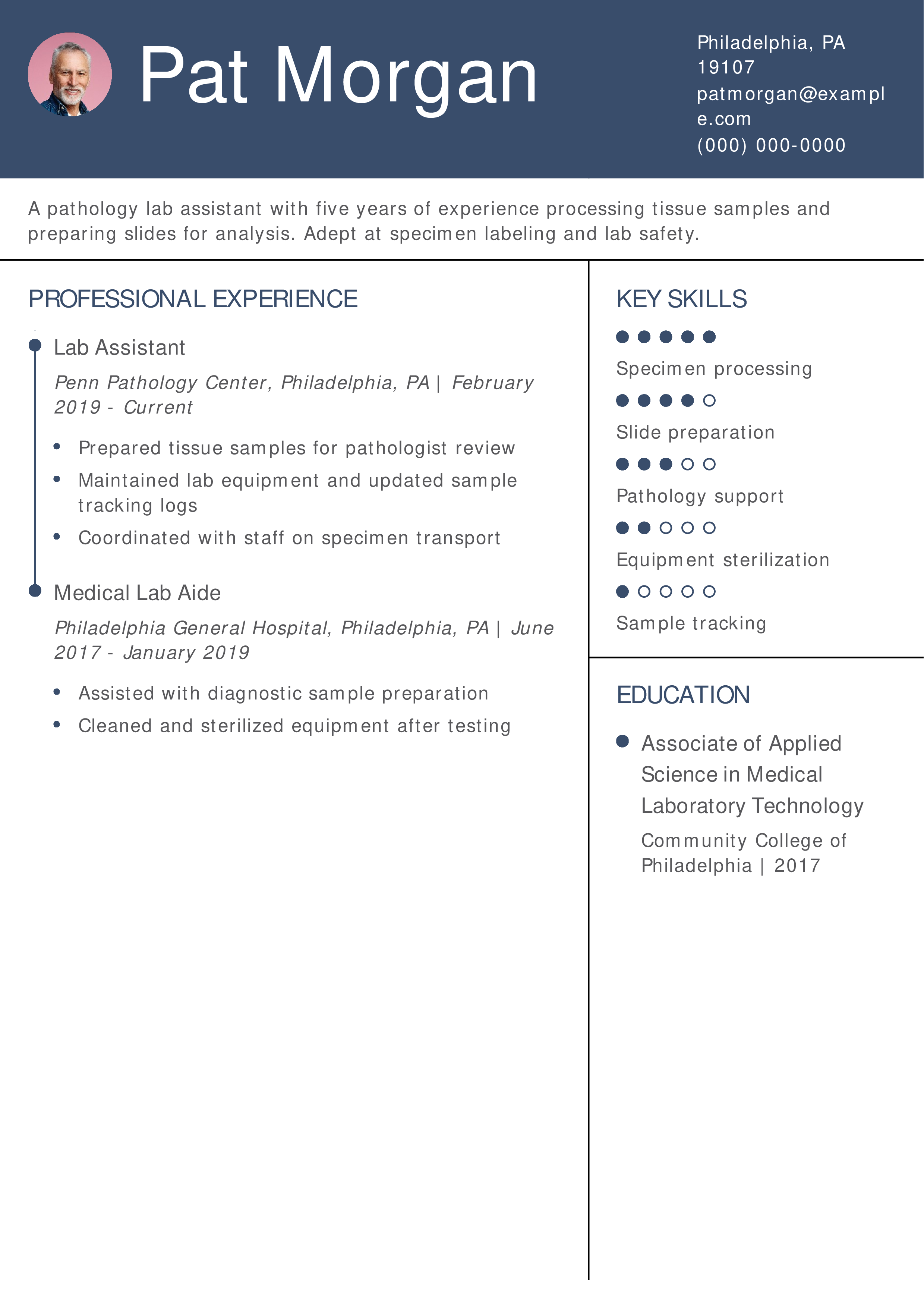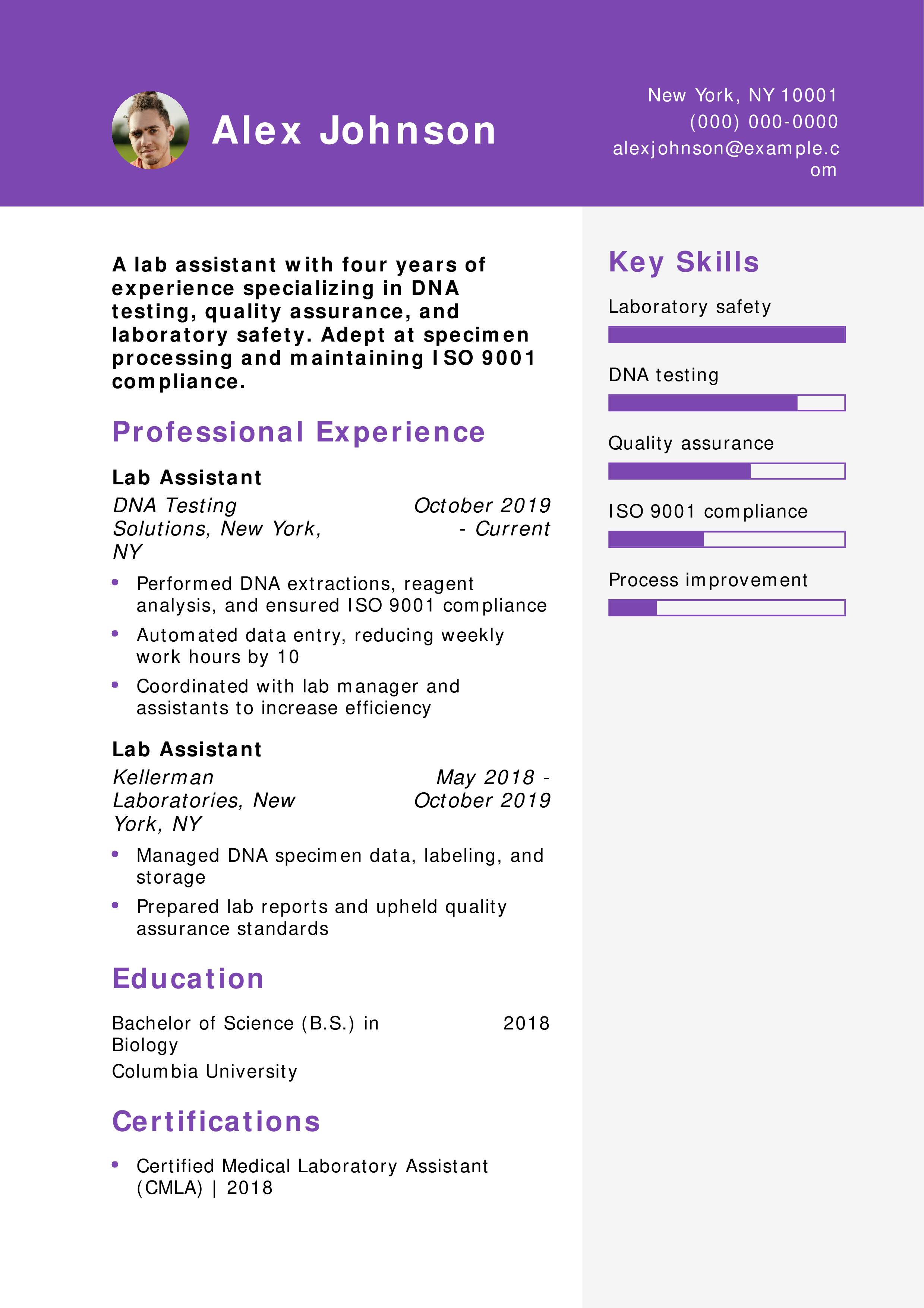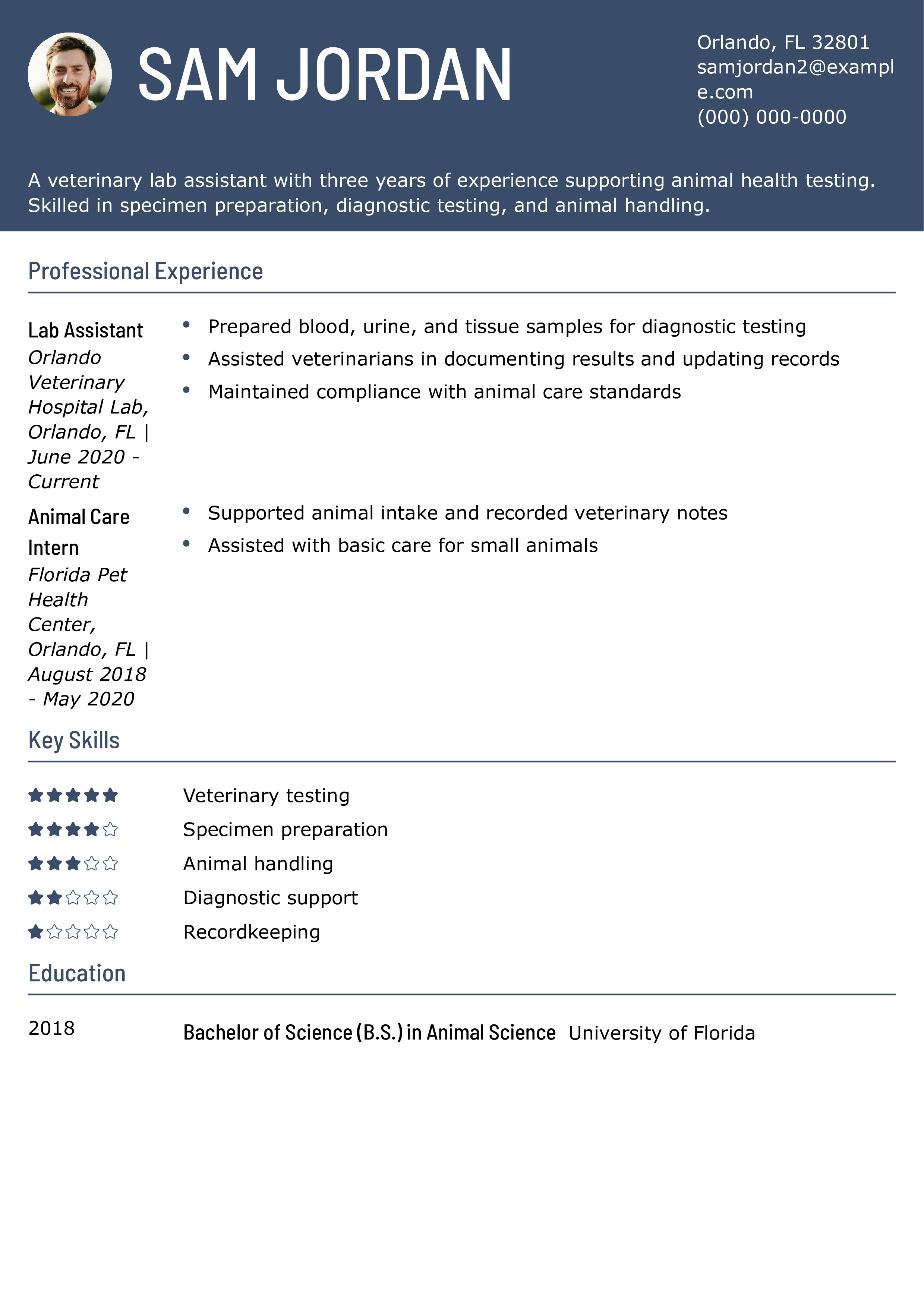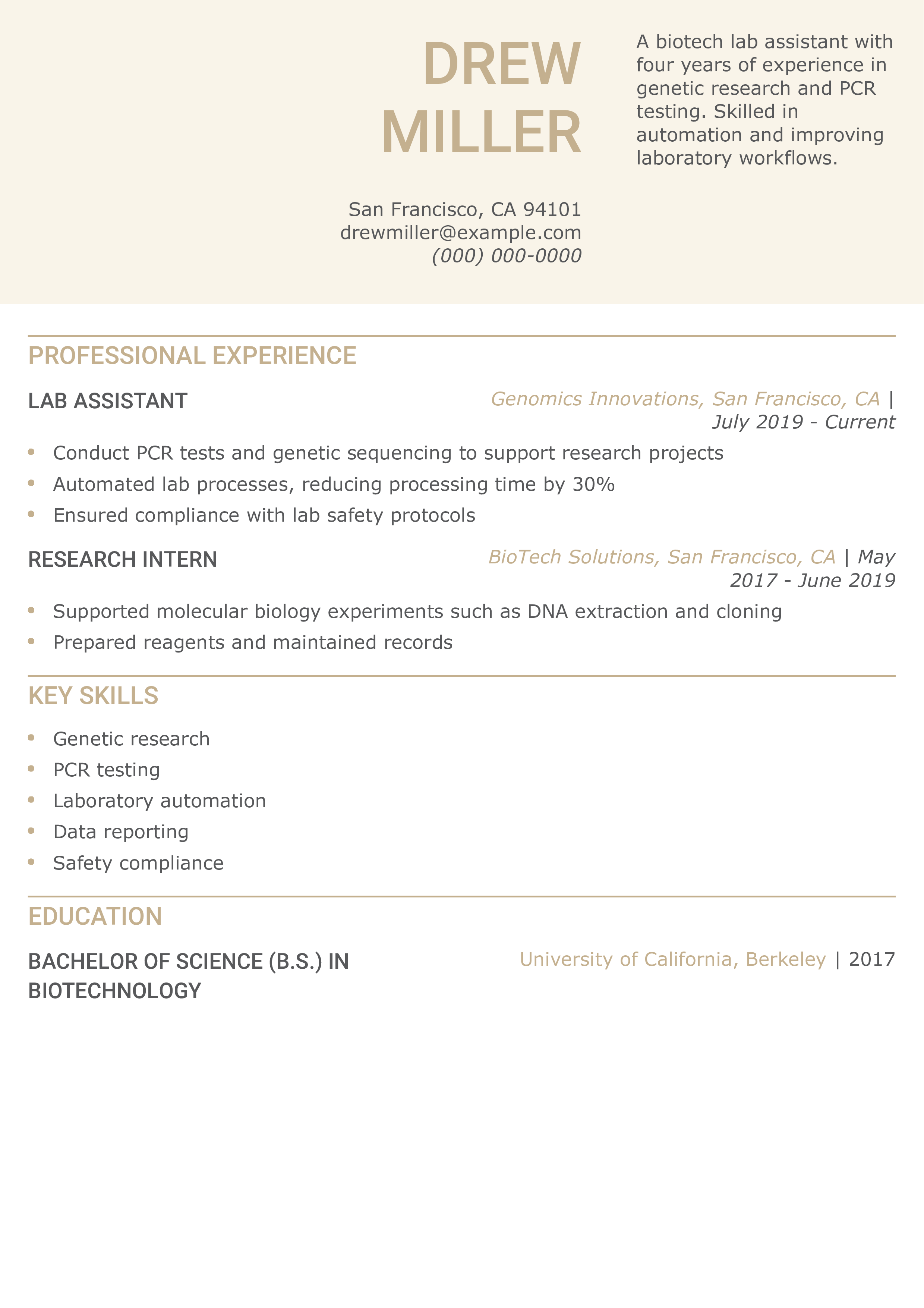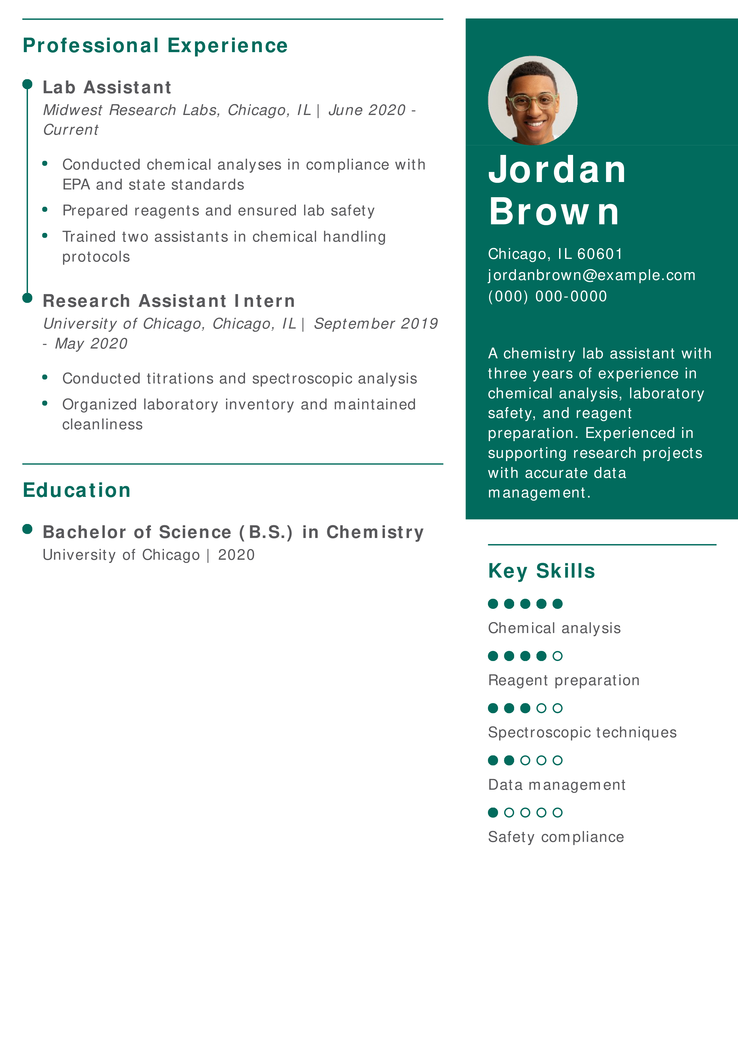 Reverse chronological is the ideal format for lab assistants. This approach places your most recent and relevant work history at the forefront of your document while showcasing your career progression. If you’re at the entry-level or making a career transition, place your skills and academic projects above your professional experience. Be sure to avoid functional resumes, as you still need to craft detailed bullet points to grab the attention of prospective employers.