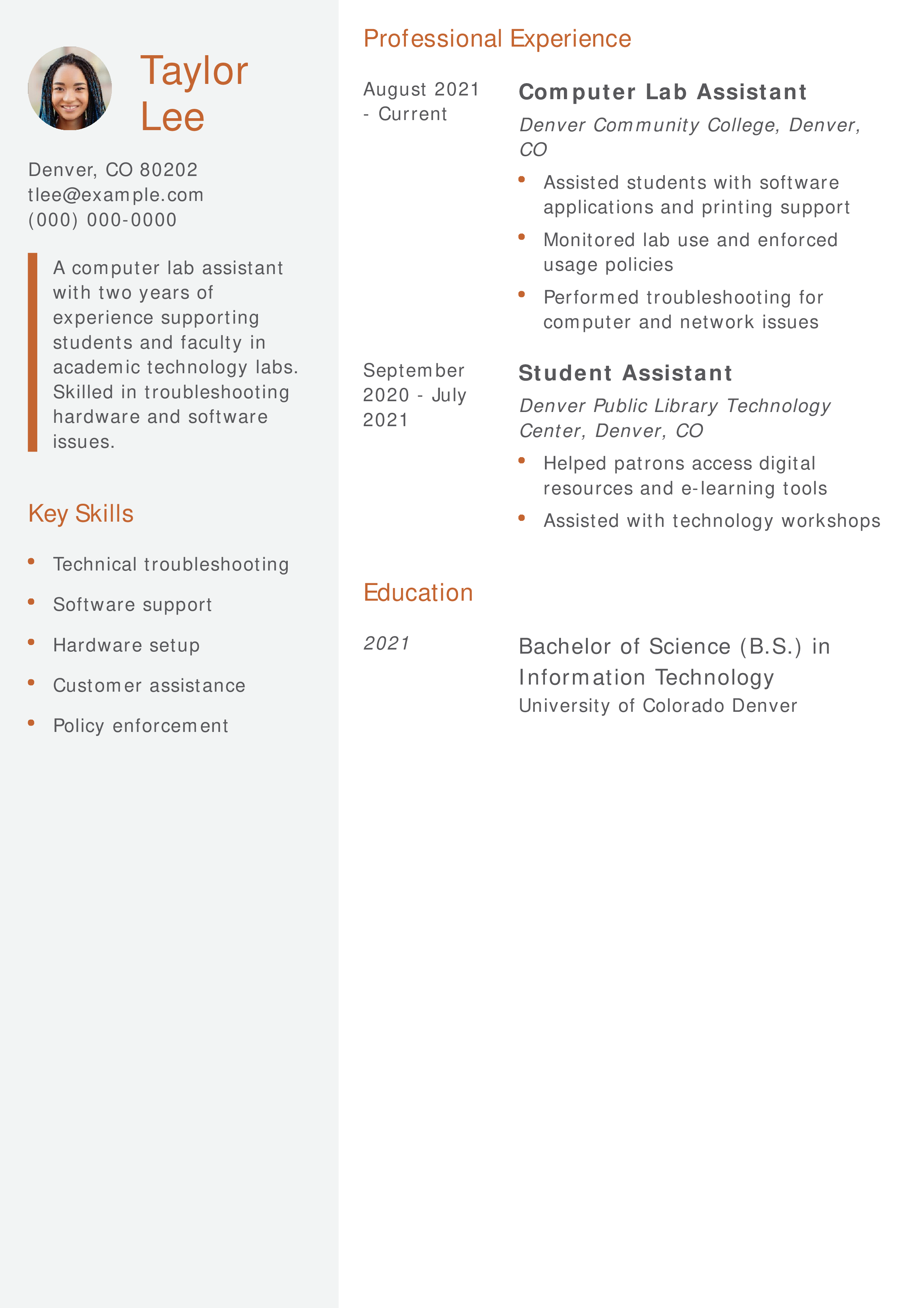 This resume is good because it highlights customer service and technical support in an academic setting. For help showing soft skills, read soft skills for a resume.