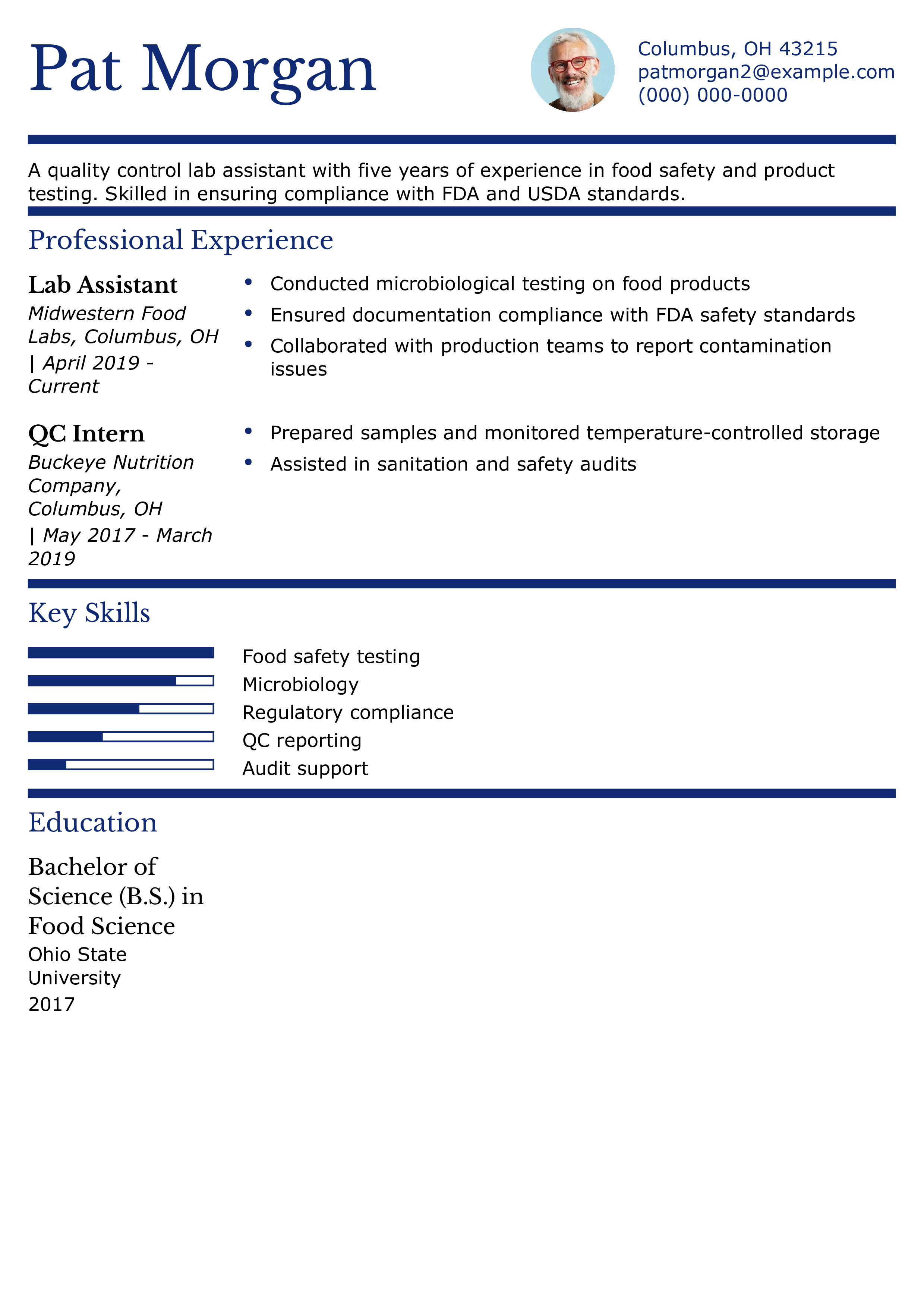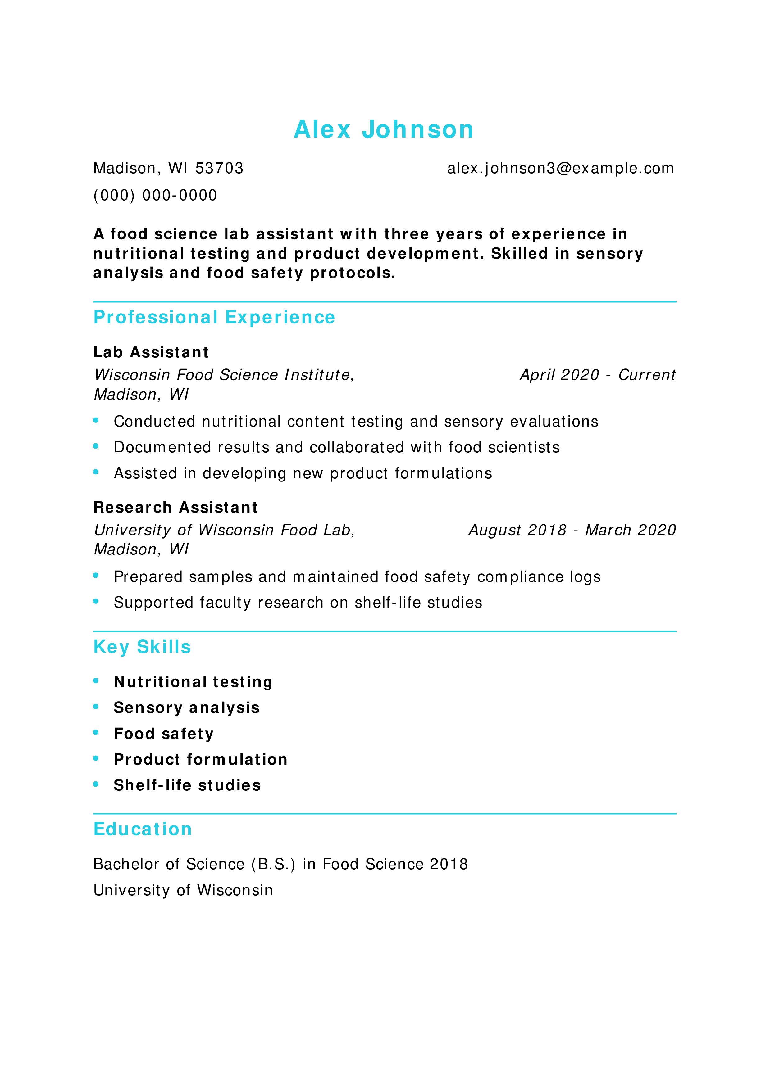 This resume is good because it highlights applied testing and research, making it relevant for food labs. To strengthen technical content, check technical skills for a resume.