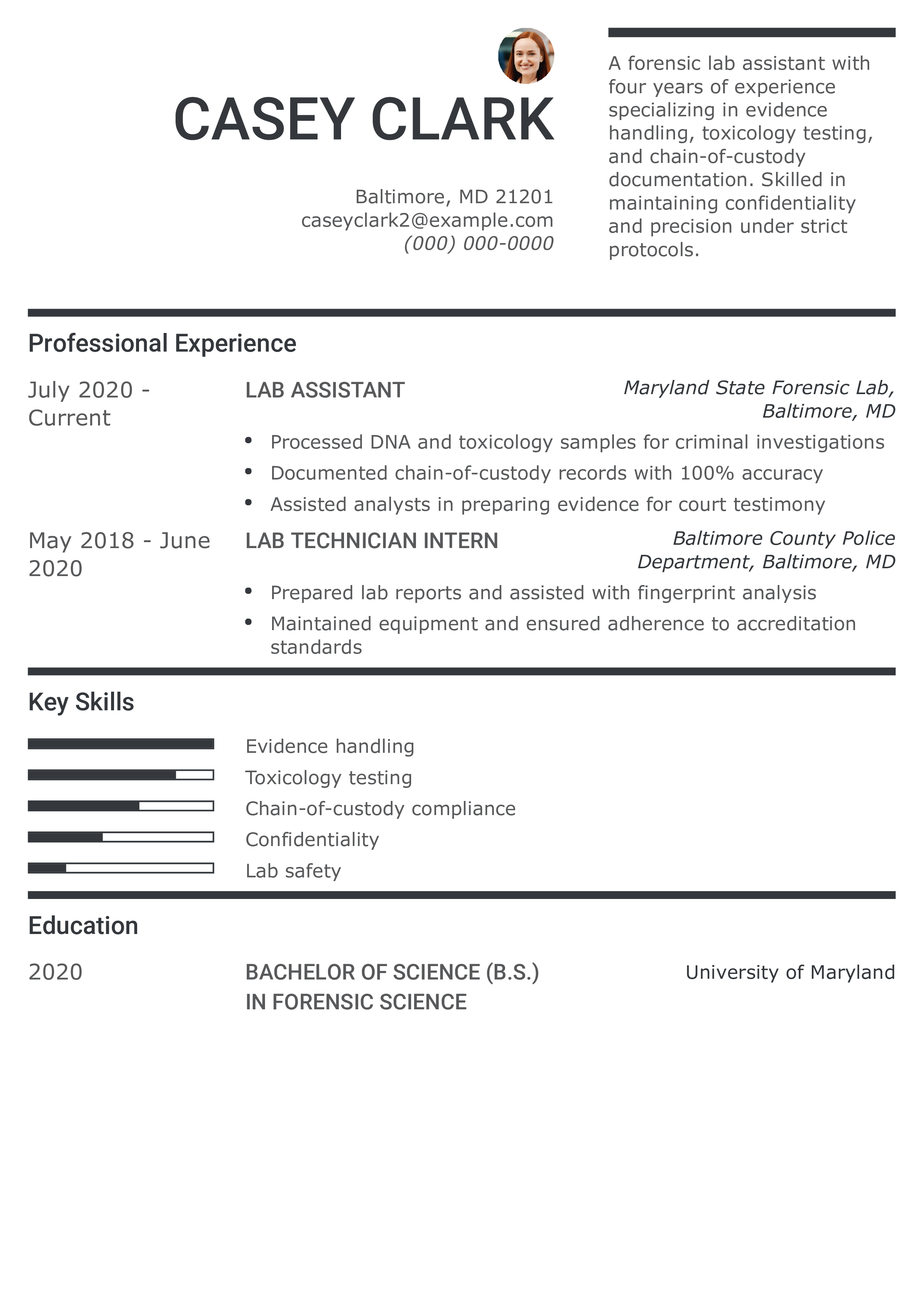 This resume is strong because it highlights forensic-specific lab skills and shows responsibility in sensitive environments. For more guidance, see cv vs. resume.