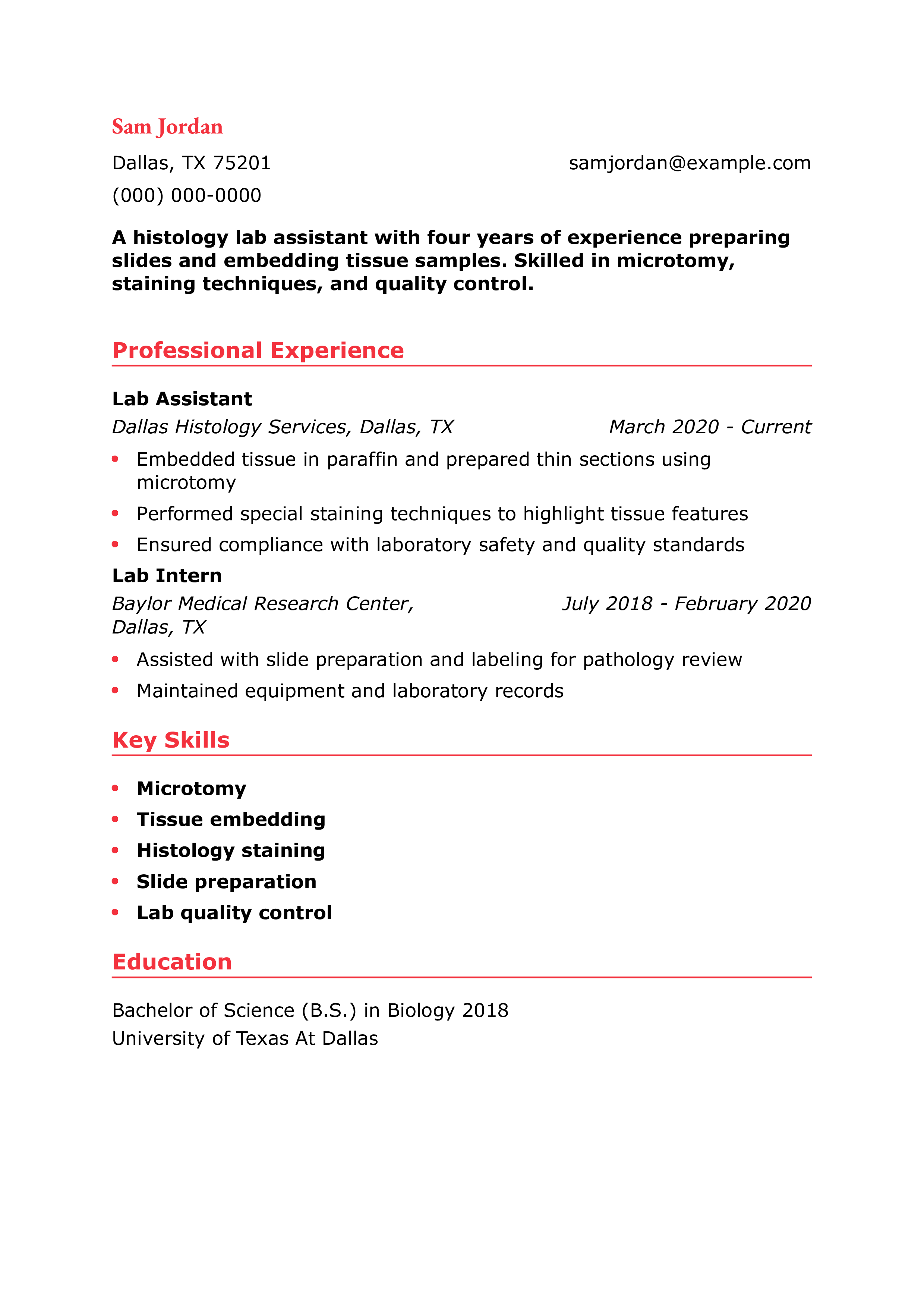 This resume is strong because it focuses on technical histology procedures while highlighting regulatory compliance. To better format technical details, see technical skills for a resume.