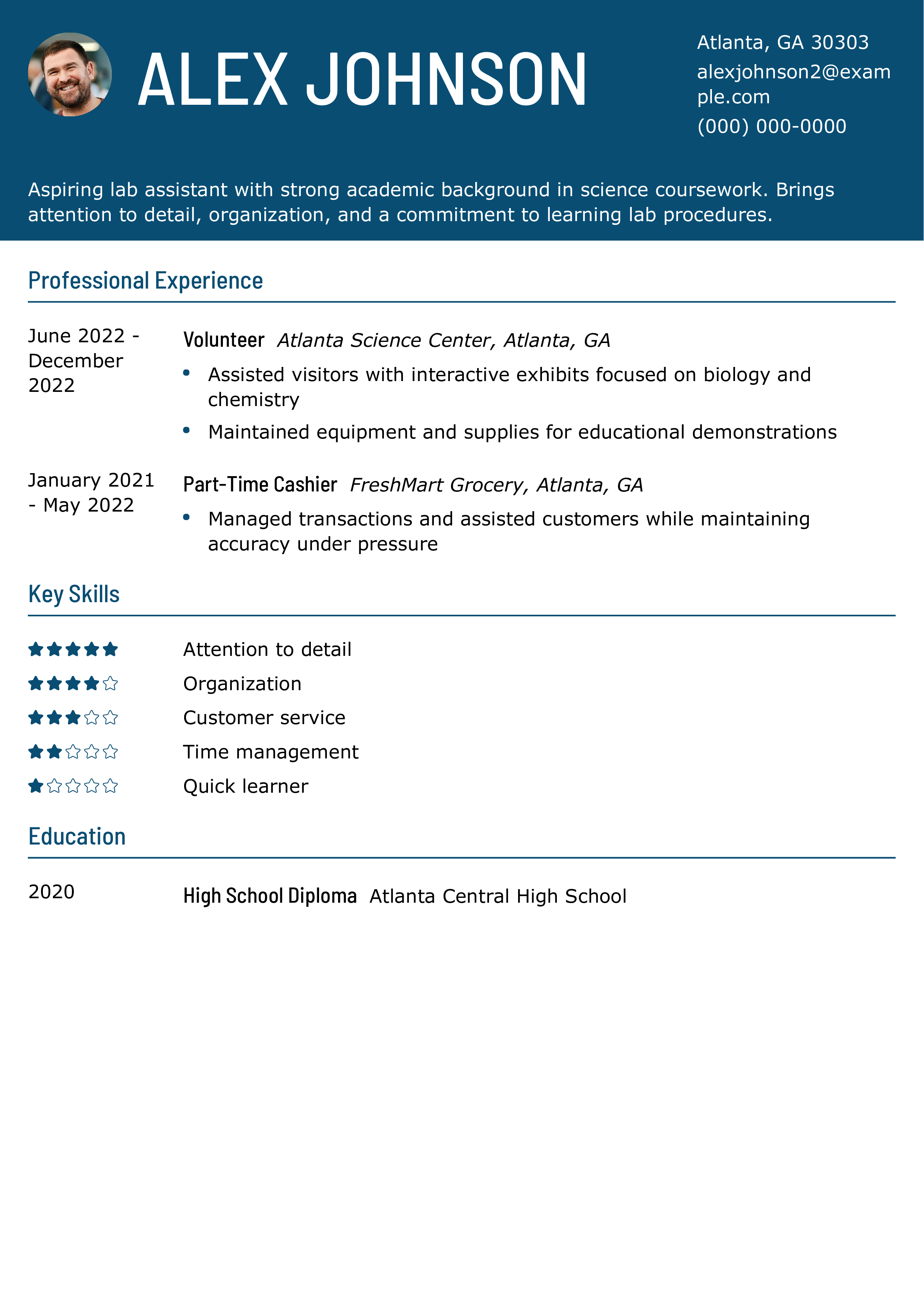 This resume is effective because it highlights transferable skills like organization and accuracy, even without direct lab experience. For guidance, see how to make a resume.