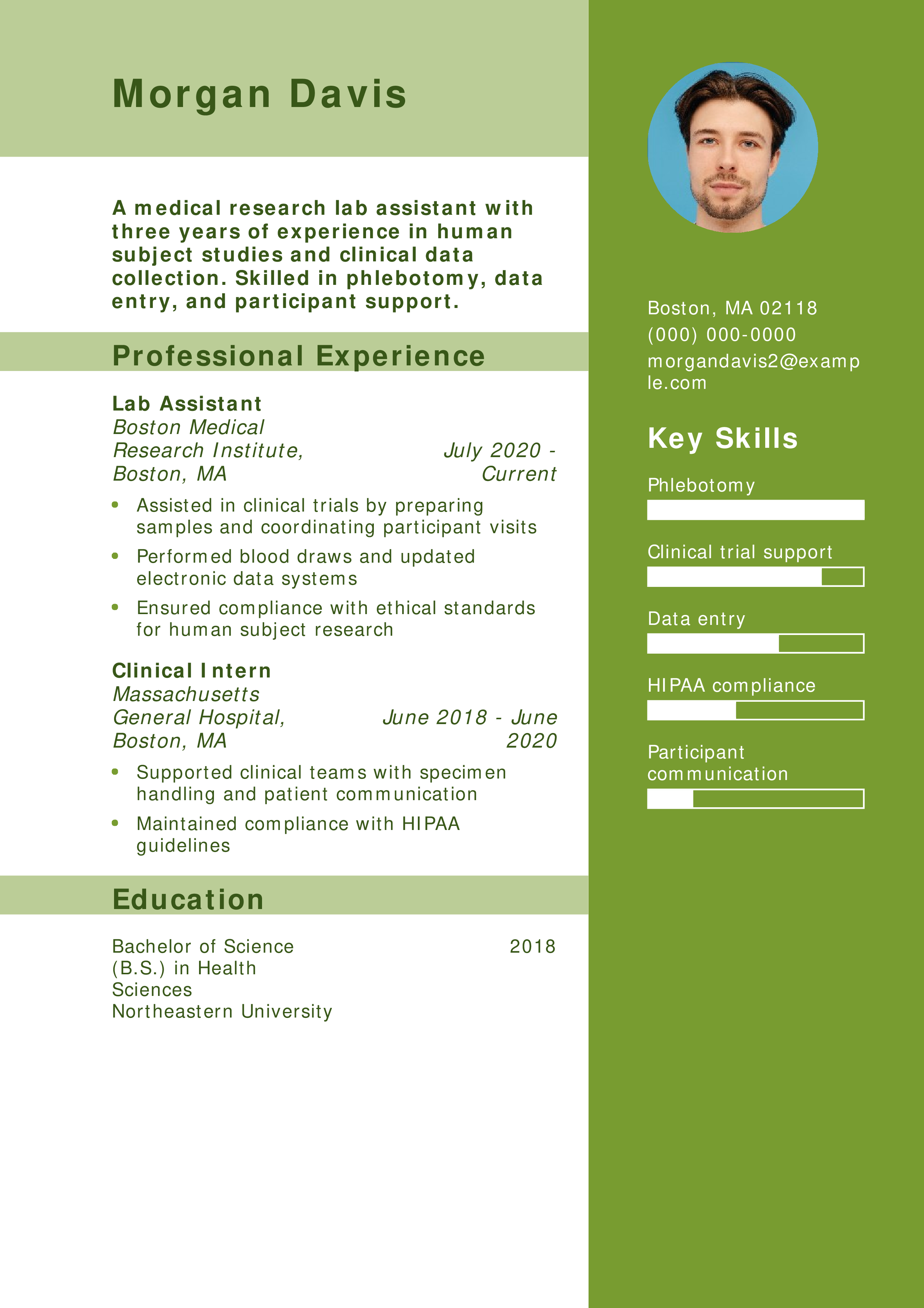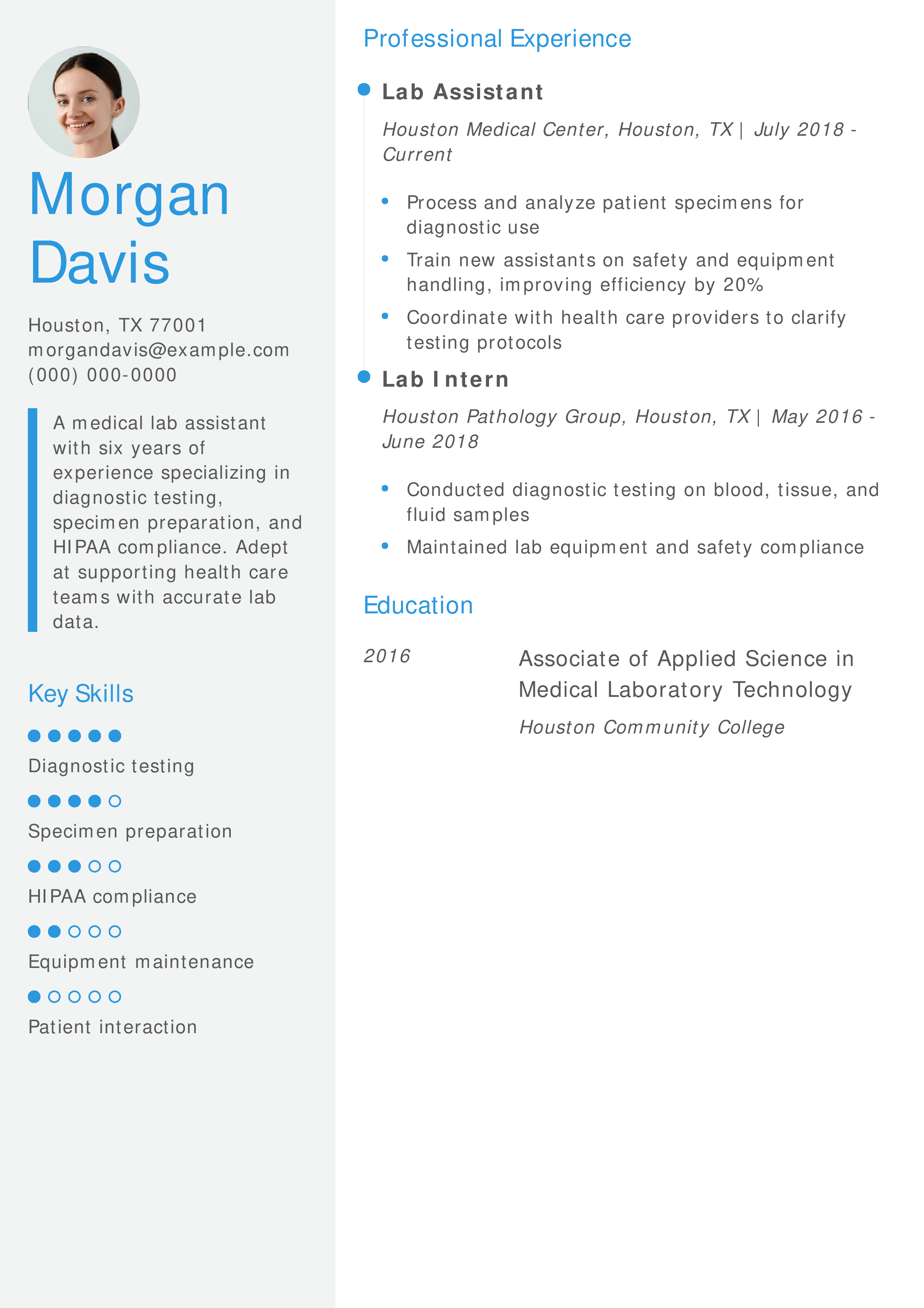 According to the Bureau of Labor Statistics, the average annual salary for lab assistants was $57,800 in 2023, with a projected growth rate of 7% over the next decade. Many of these positions will be clinical, but opportunities are available in other industries, such as the electrical engineering field. Despite these positive growth indicators, you’ll still need to align your resume with the job description to maximize your chances of landing the interview.