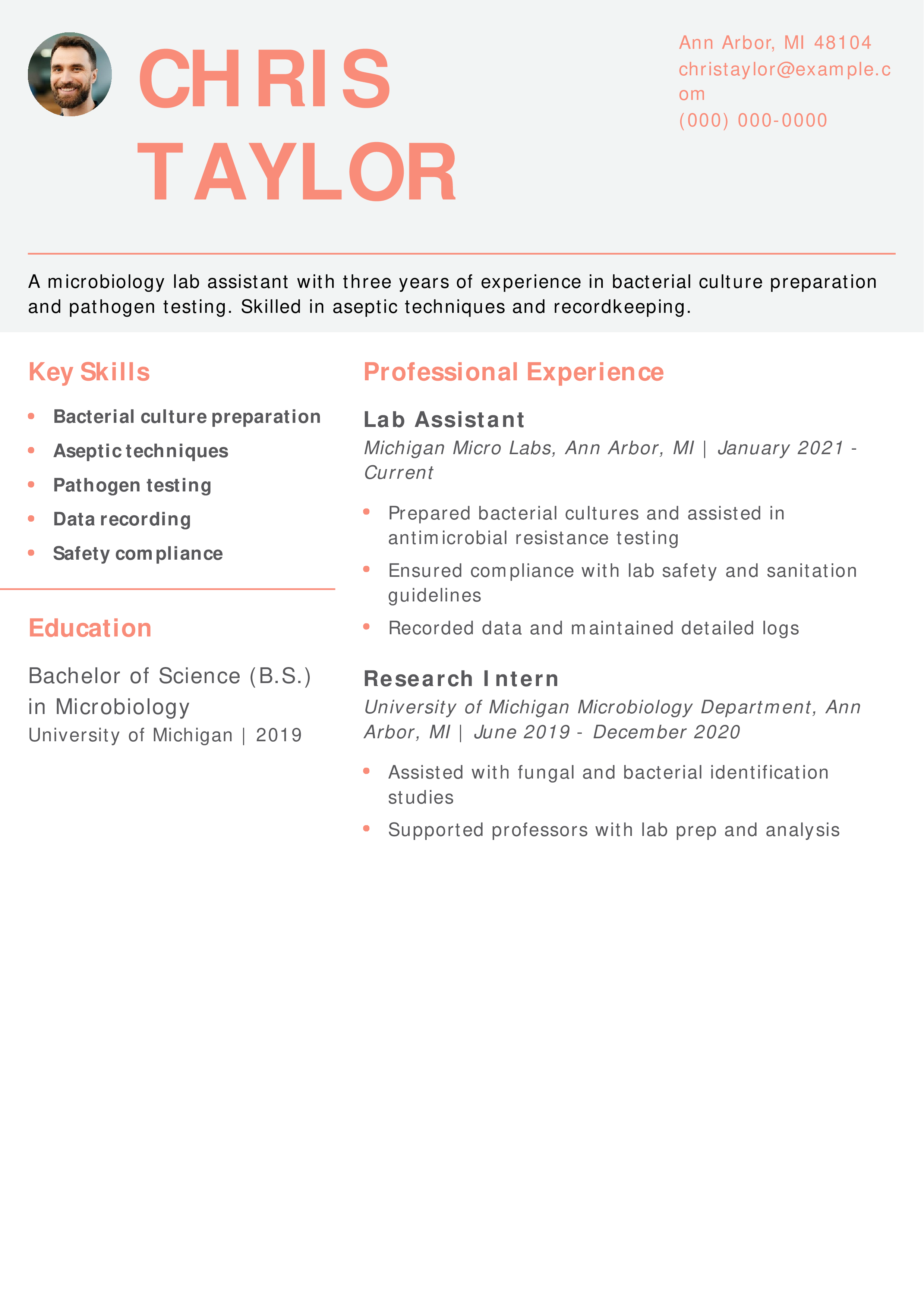This resume is strong because it shows specialized skills in microbiology and demonstrates academic to professional progression. Learn more about formatting experience with resume outline examples.