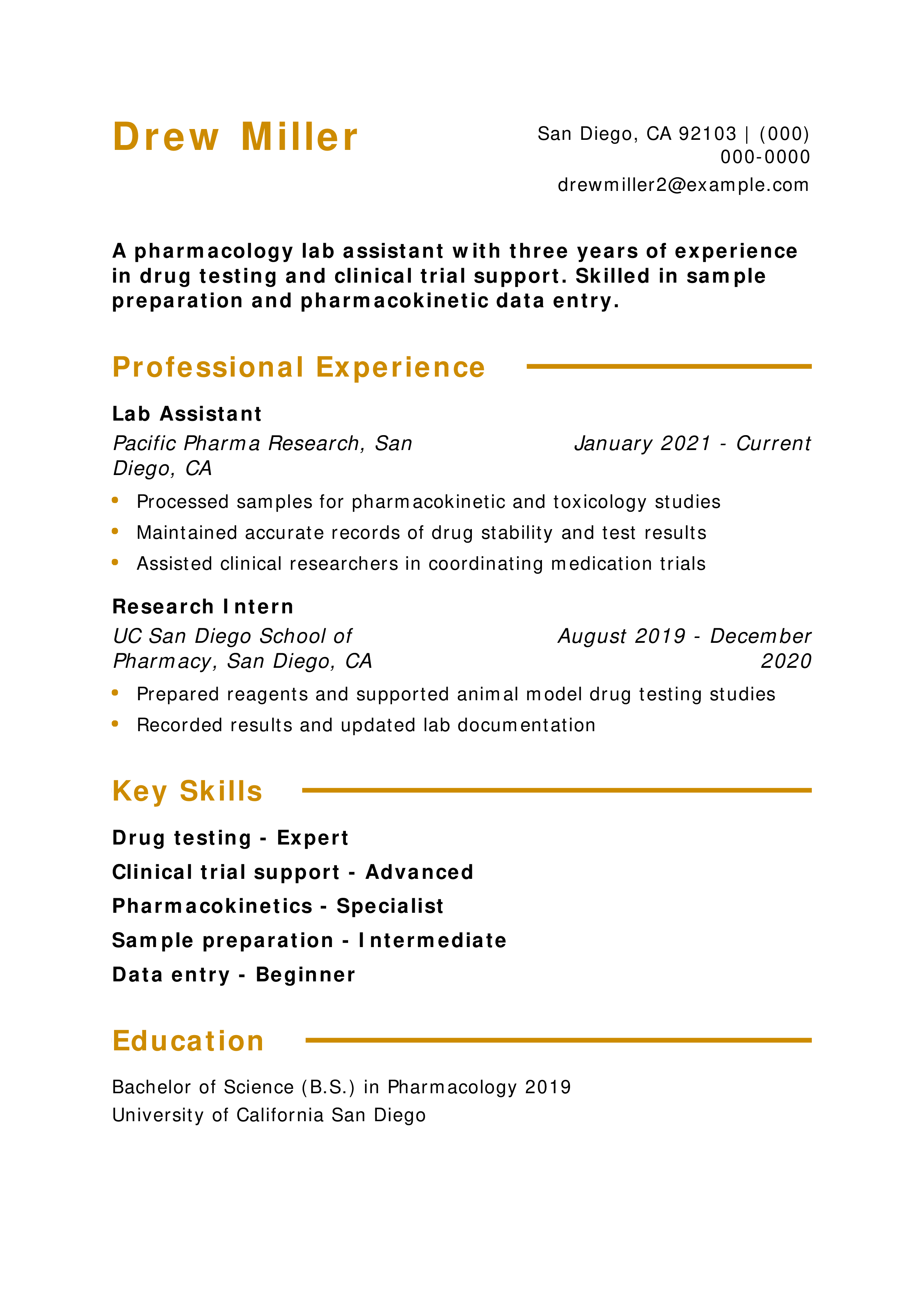 This resume is effective because it directly connects lab skills to pharmaceutical research and clinical testing. Learn how to highlight specialized training with how to list relevant coursework on a resume.