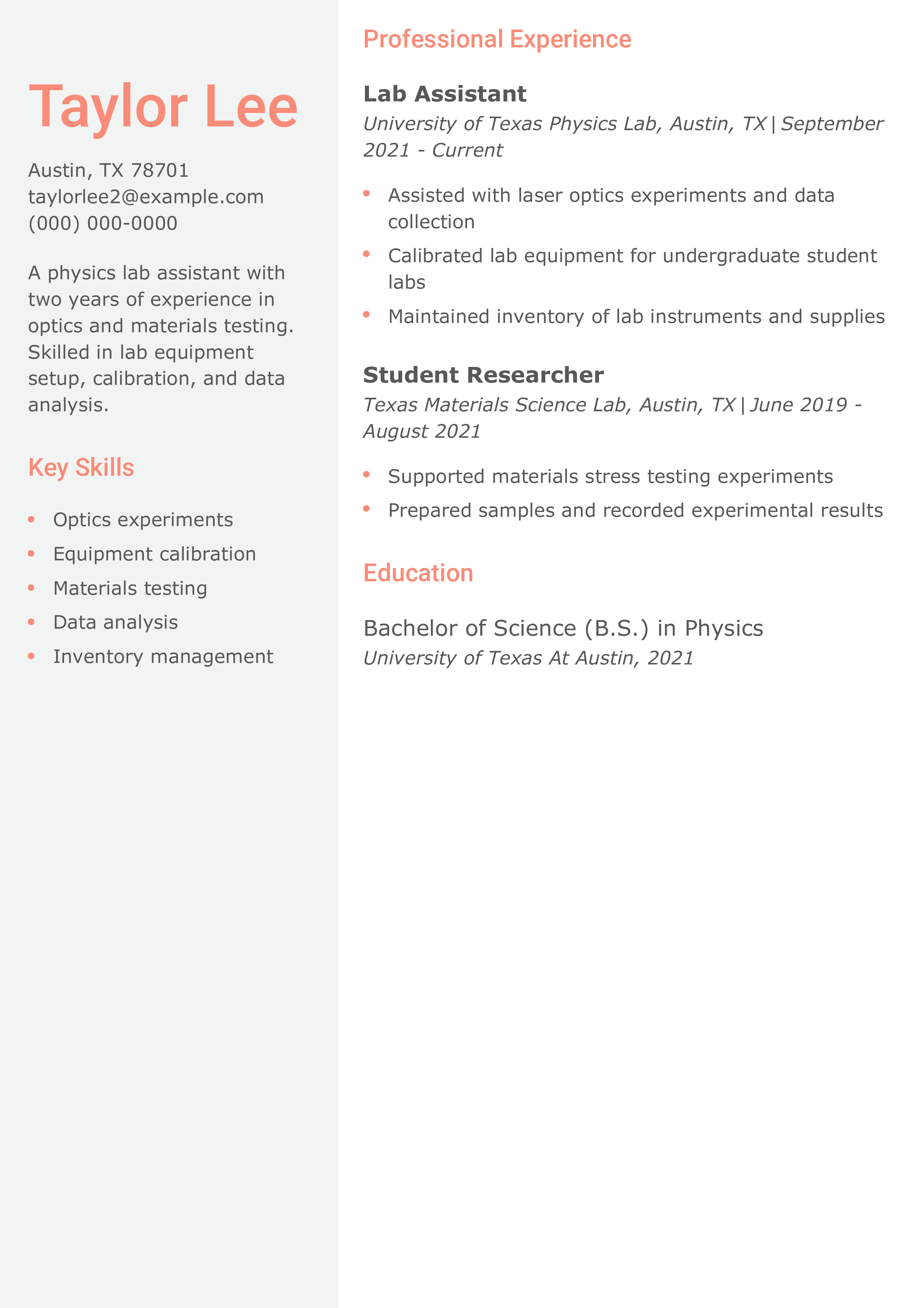 This resume is strong because it demonstrates hands-on lab skills and connects academic research to applied physics experiments. For formatting help, see best font for a resume.