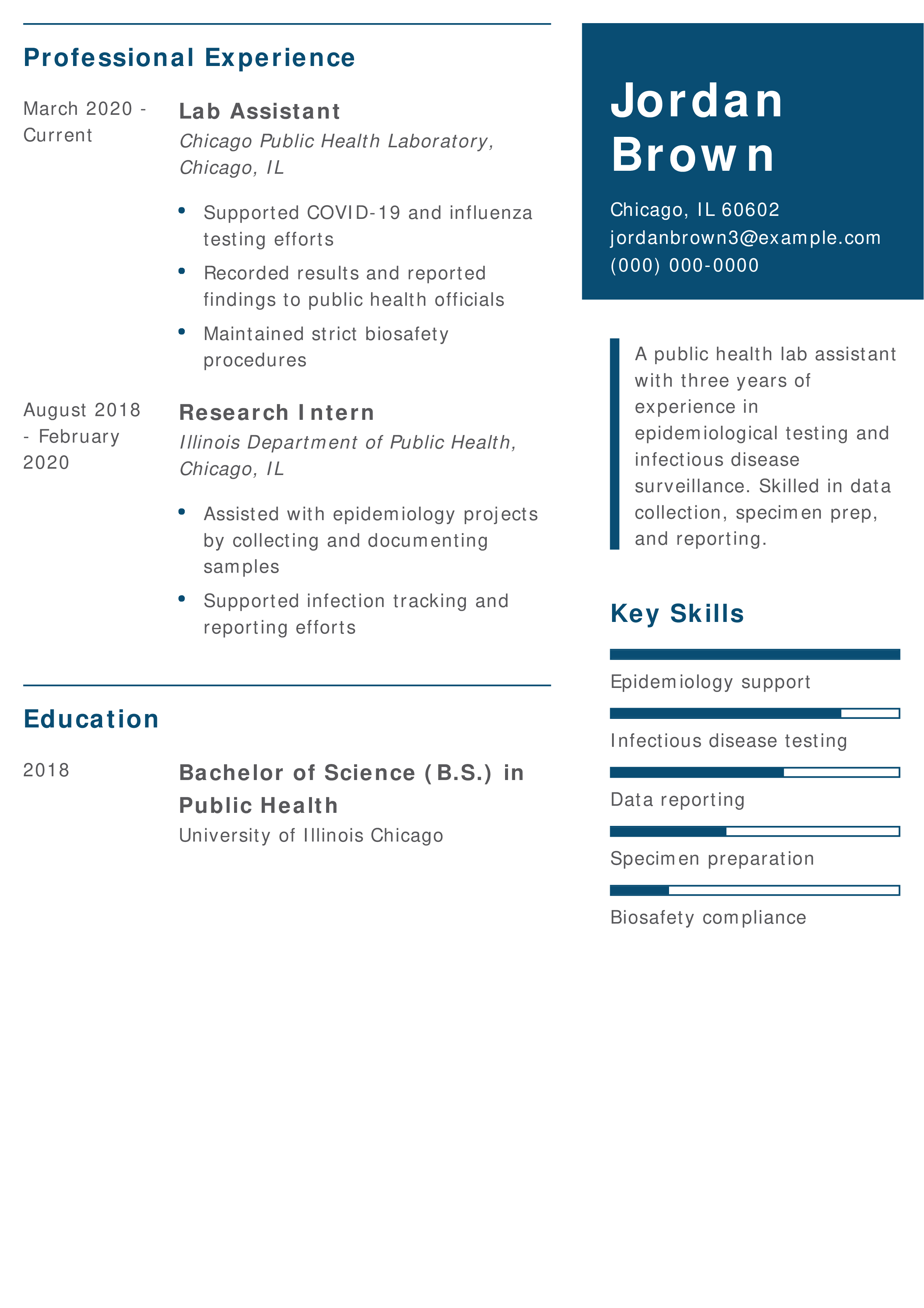 This resume effectively shows how lab support connects to broader public health goals. For more details, read how to put volunteer work on a resume.