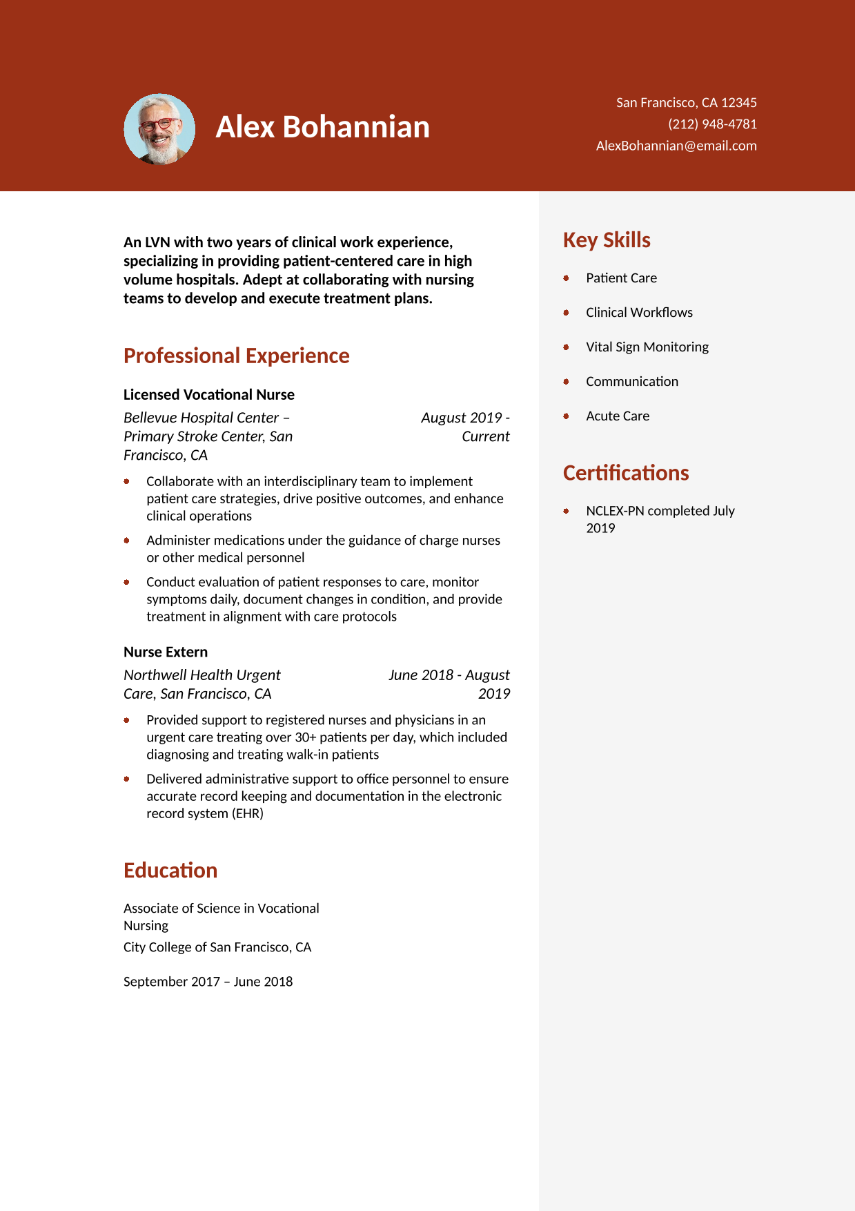 How your resume looks is just as important as how it’s written, so choose a template that allows your professional background to shine. The best resume template for a licensed vocational nurse is clean, orderly, and visually appealing. Opt for a template that focuses on your most relevant accomplishments and key skills, allowing them to take center stage.
