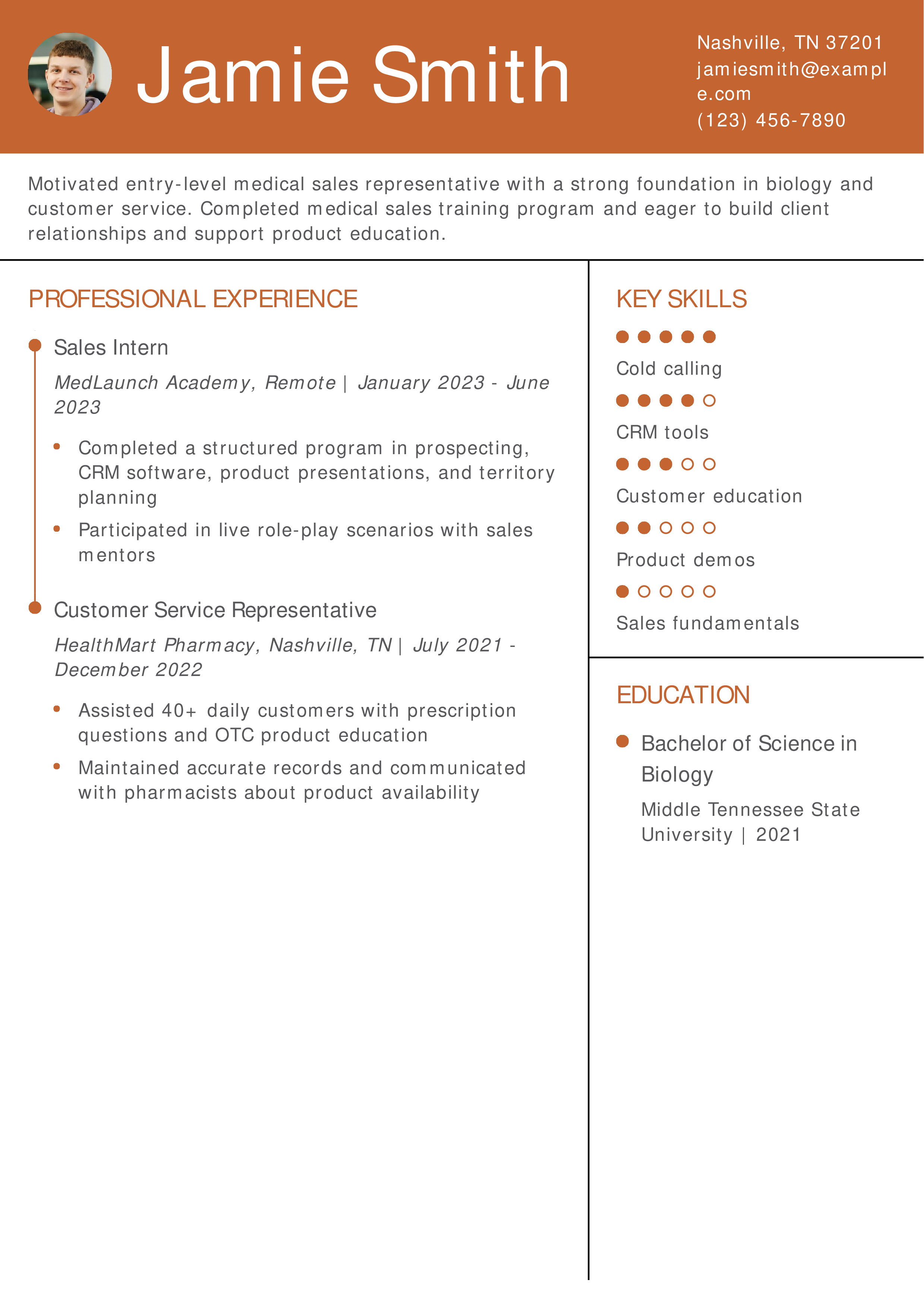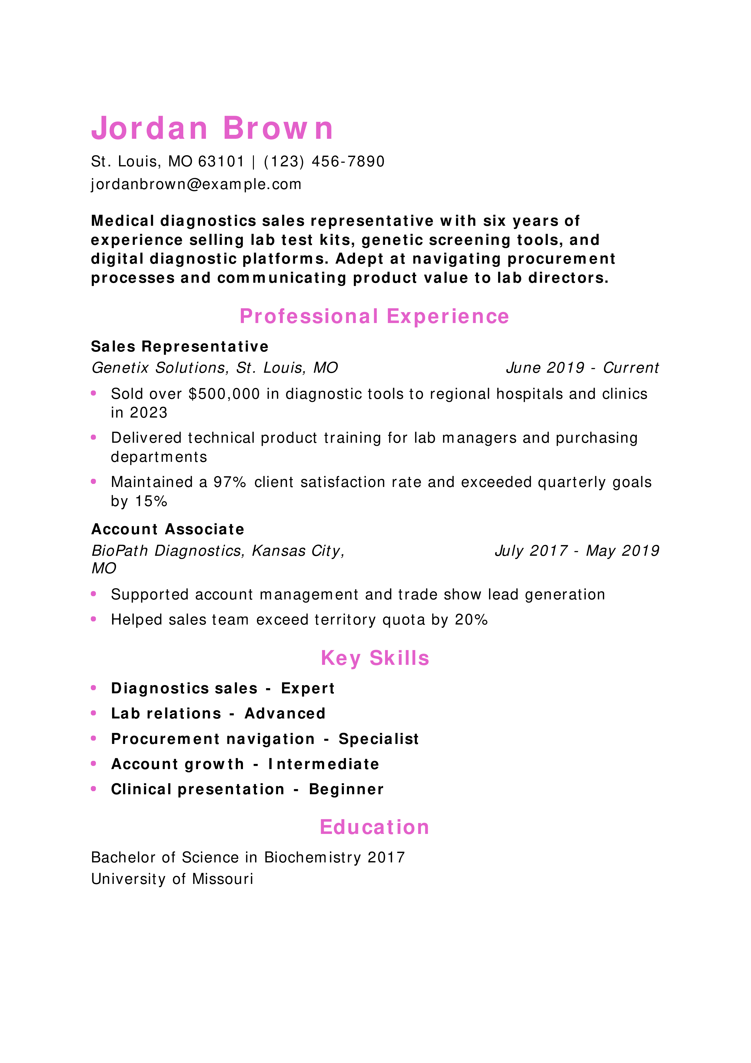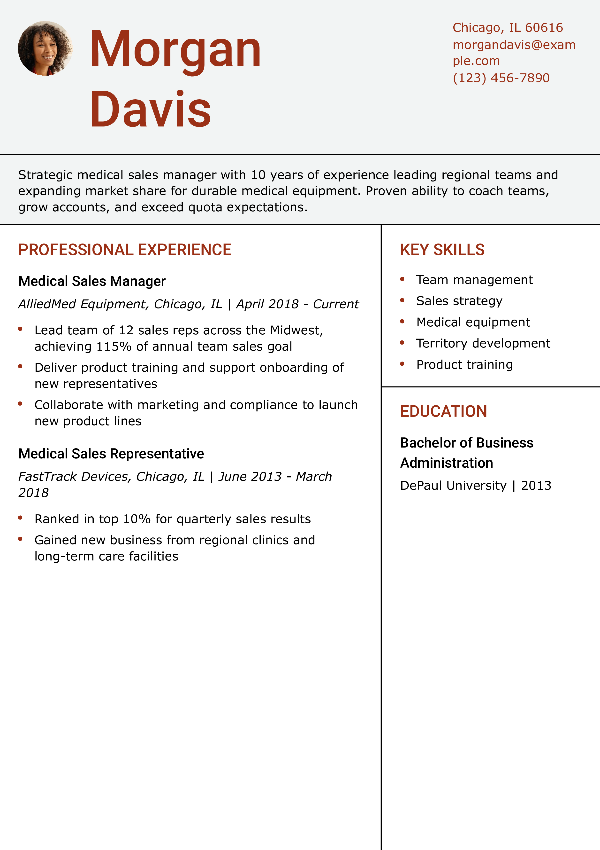 The reverse chronological resume format is often the most effective choice for medical sales representatives. This format lets you showcase your most recent work experience first while highlighting your career progression. Medical sales roles typically require a proven track record of success and a strong sales background, and this format works to your advantage, allowing you to demonstrate your most notable achievements.