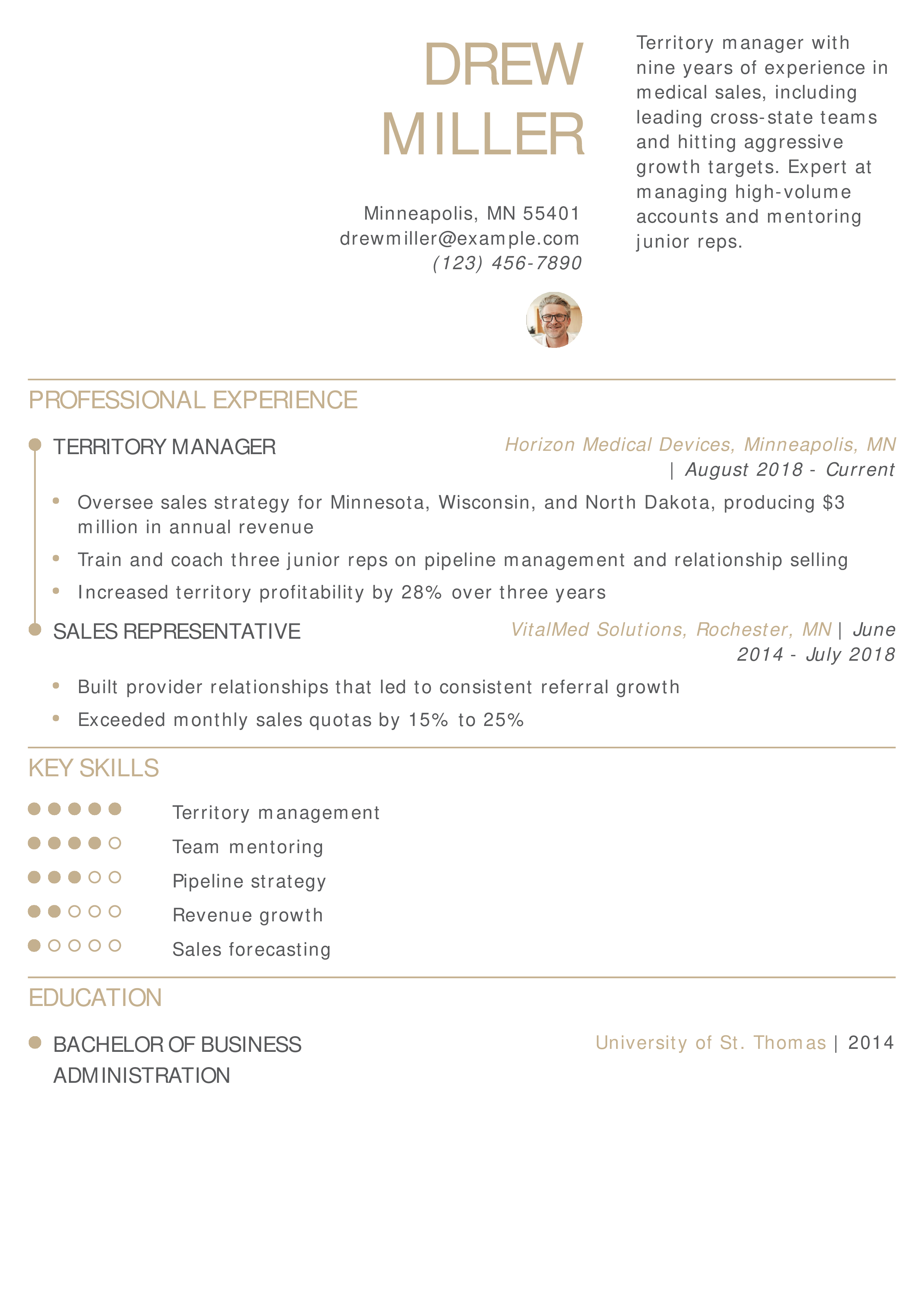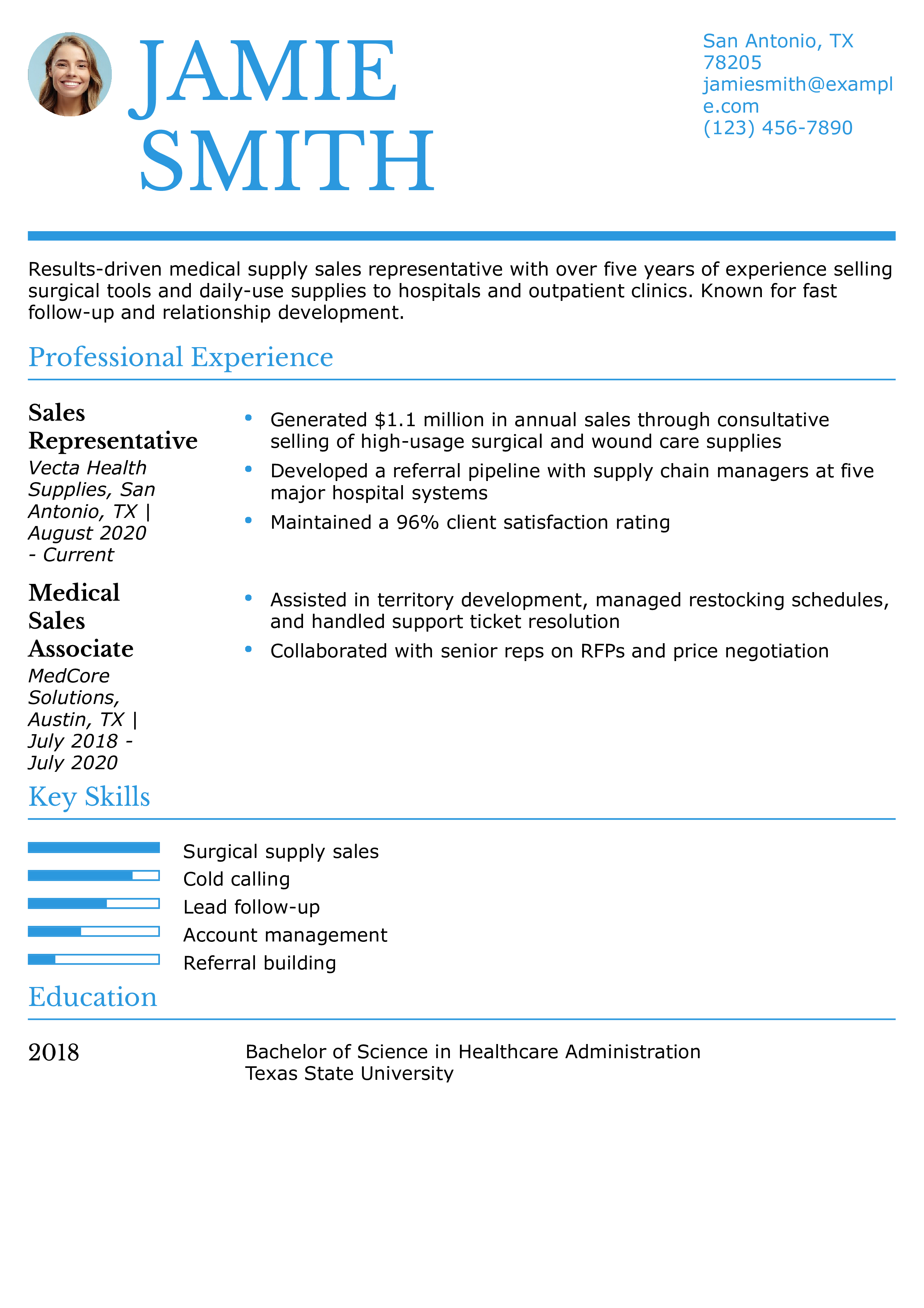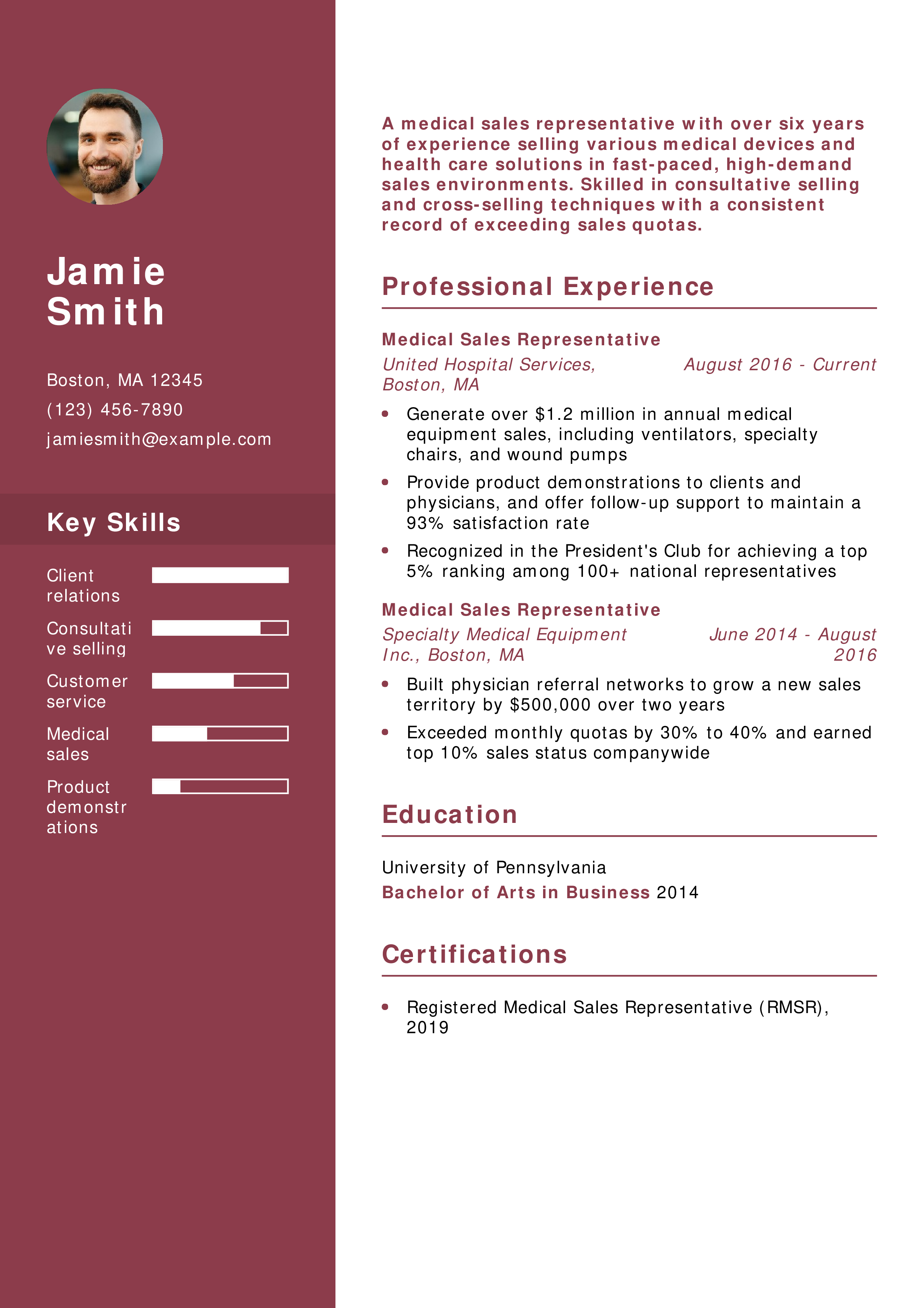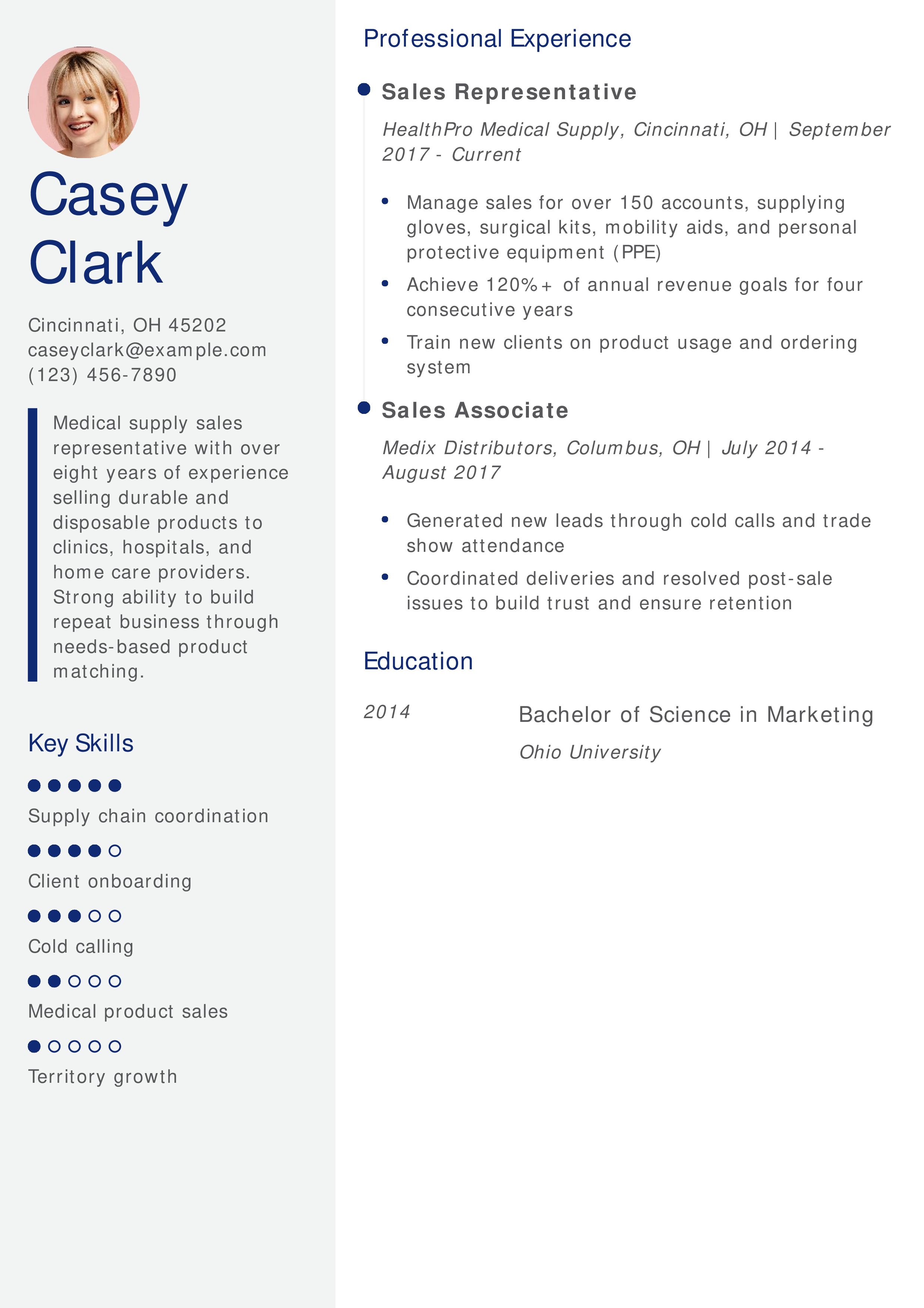 Demonstrate your impact by showcasing how your sales strategies and customer relationship management (CRM) skills contributed to the success of your territory or product lines. Be specific in the types of products you sell, as hiring managers want to see your specific areas of medical knowledge. By showcasing your advanced knowledge of both health care products and sales techniques, you’ll generate interviews during the job search.