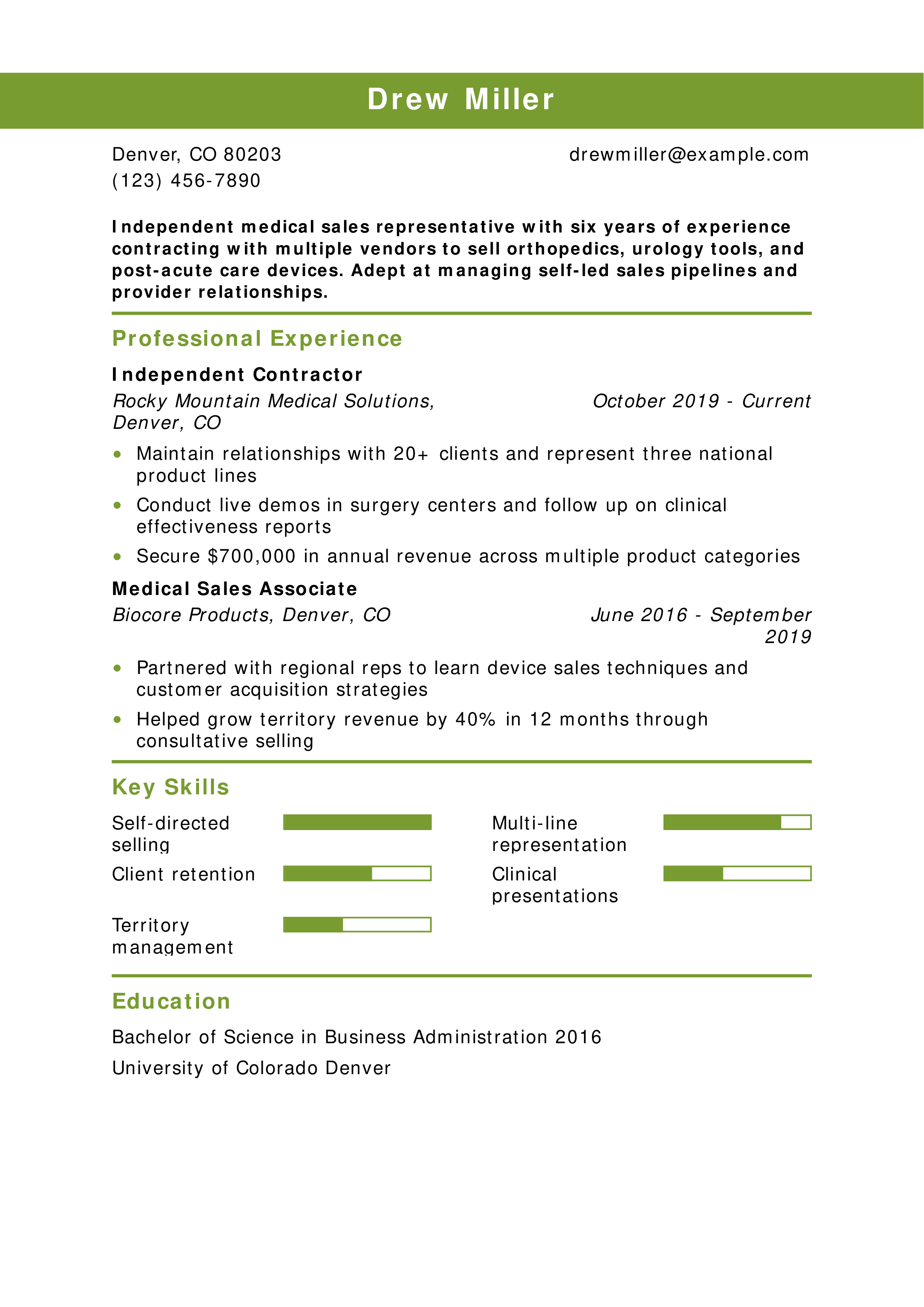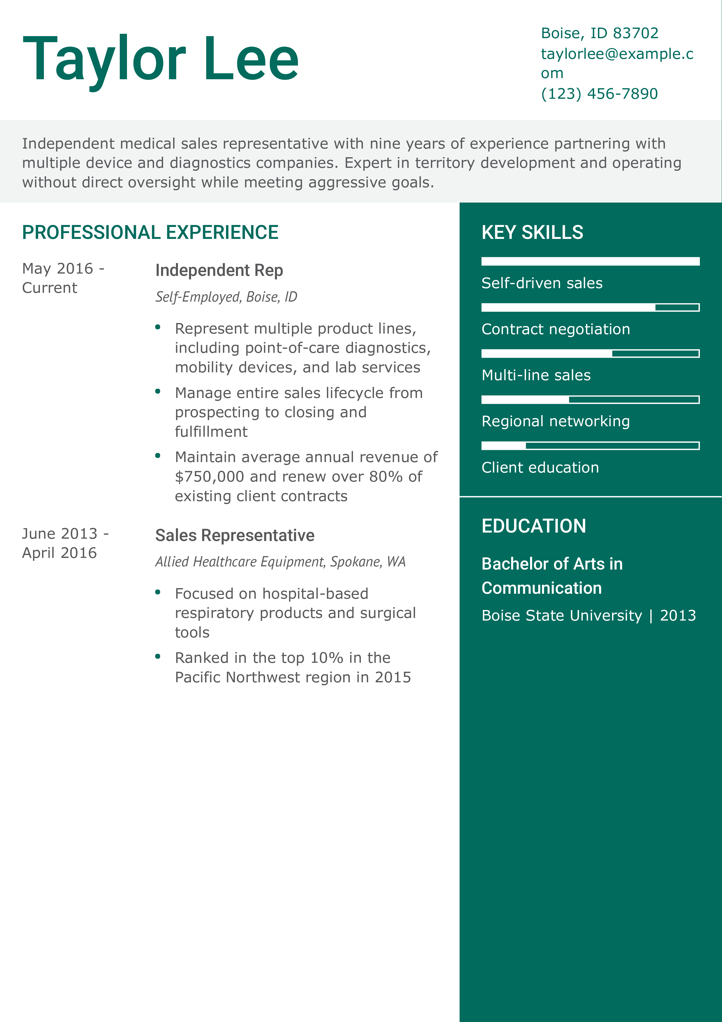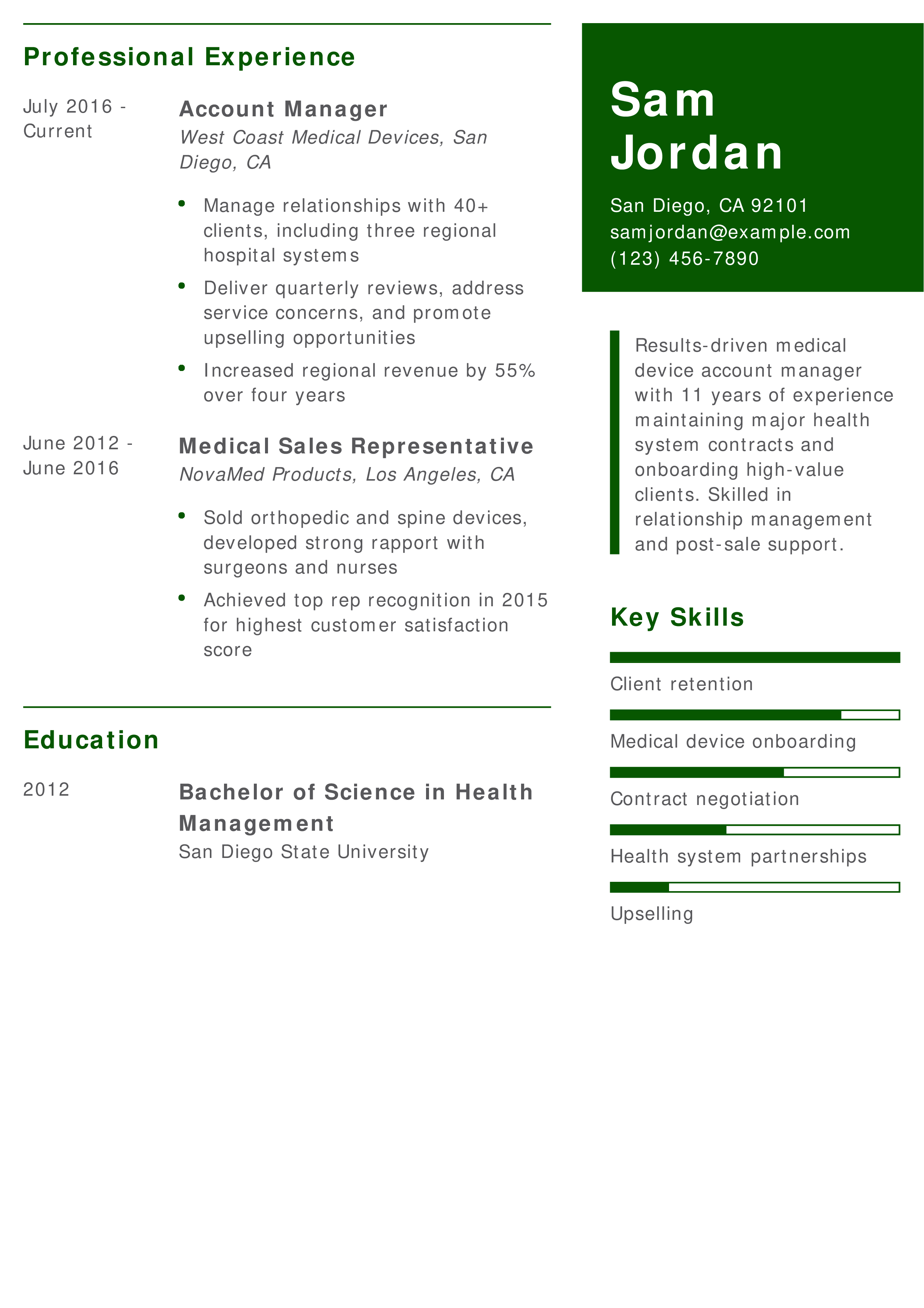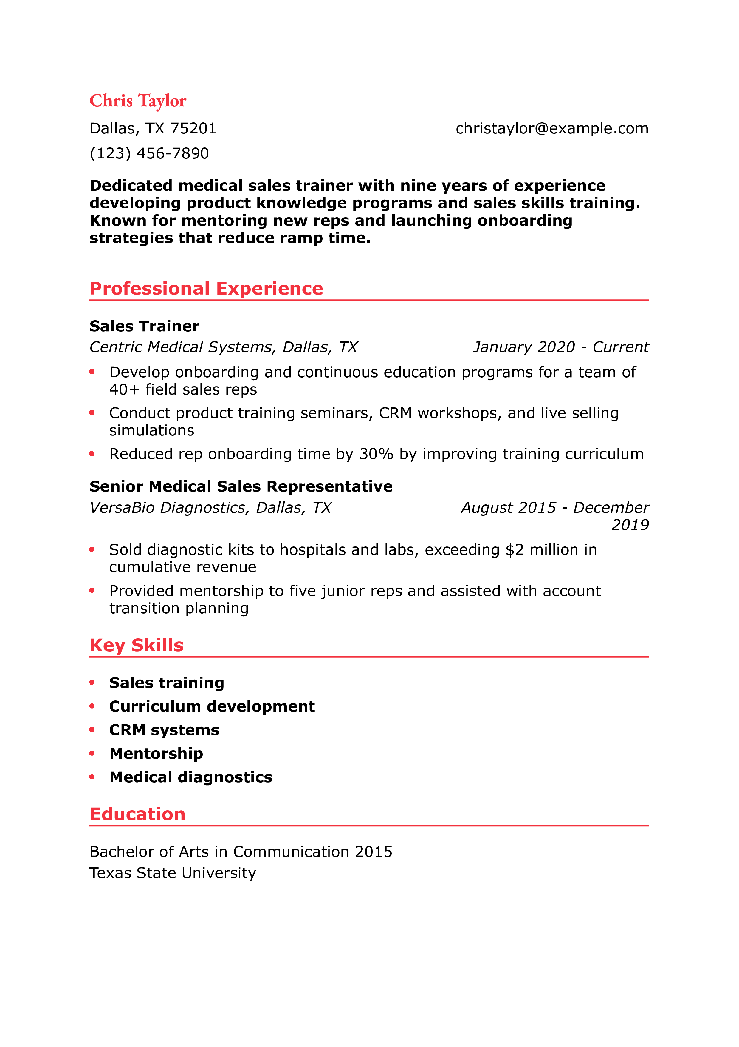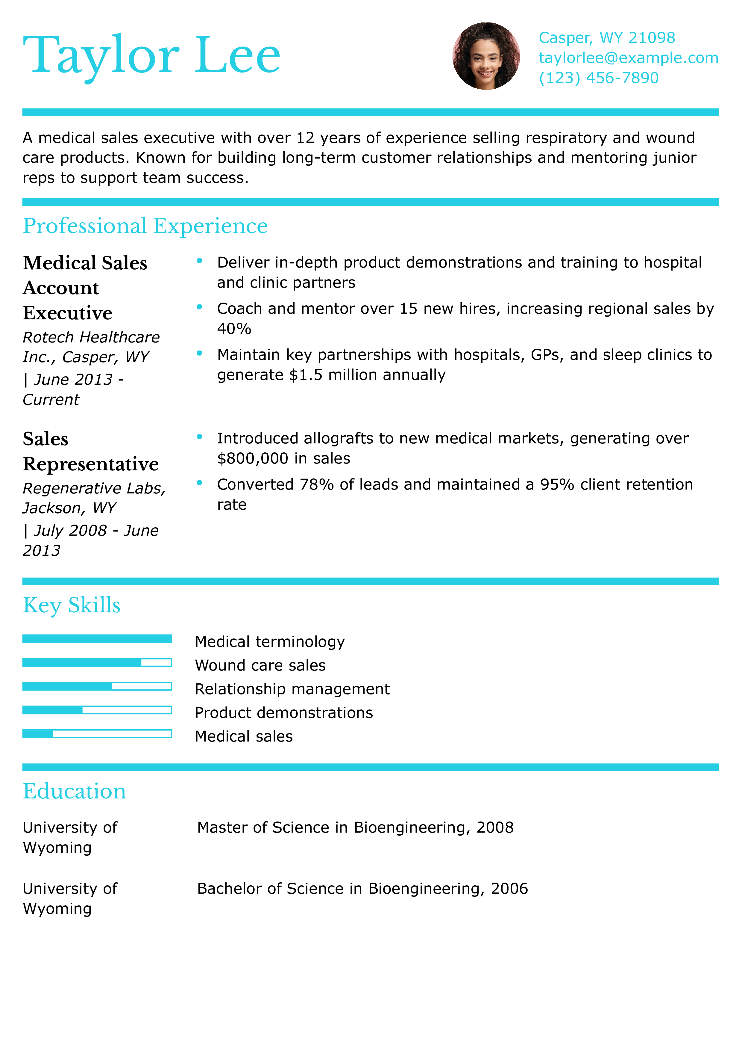 Demonstrate your impact by showcasing how your sales strategies and customer relationship management (CRM) skills contributed to the success of your territory or product lines. Be specific in the types of products you sell, as hiring managers want to see your specific areas of medical knowledge. By showcasing your advanced knowledge of both health care products and sales techniques, you’ll generate interviews during the job search.