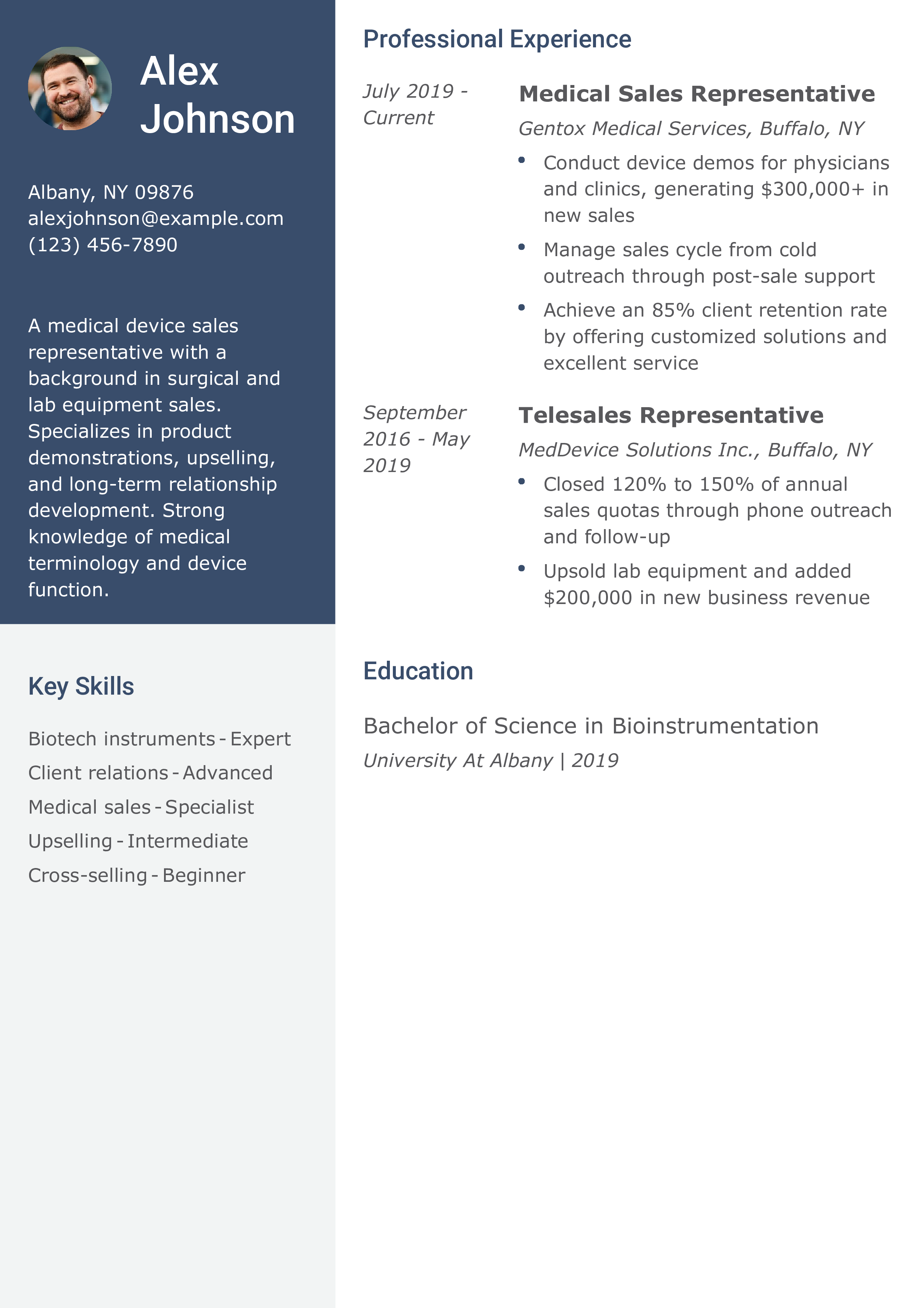 Employers want to know about your academic background to assess your industry knowledge, product understanding, and capacity to handle the responsibilities of a medical sales role. Relevant education can include a degree in a related field such as business, marketing, or life sciences. Starting your list with the highest level of education, provide the degree name, institution, location, and graduation date.