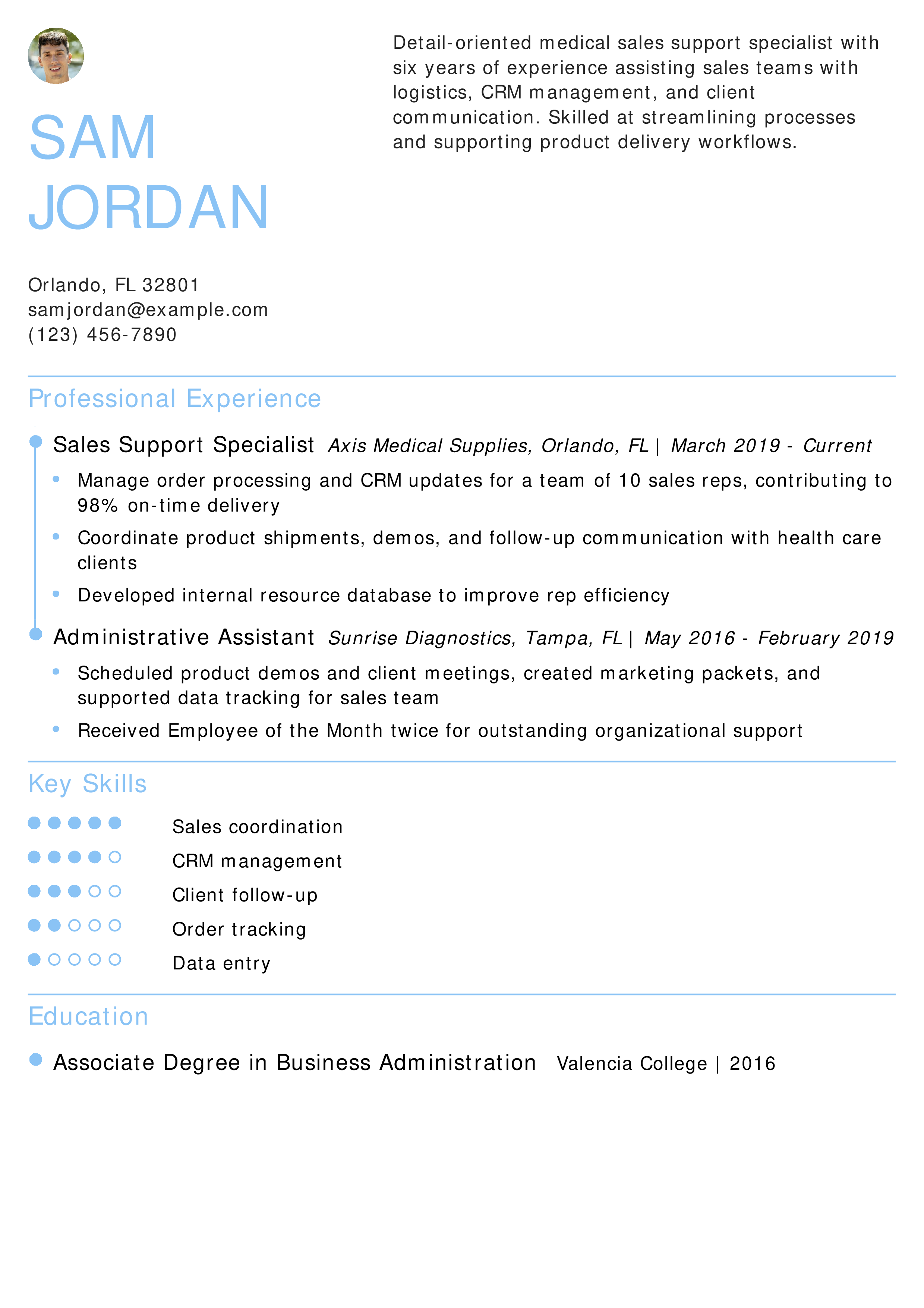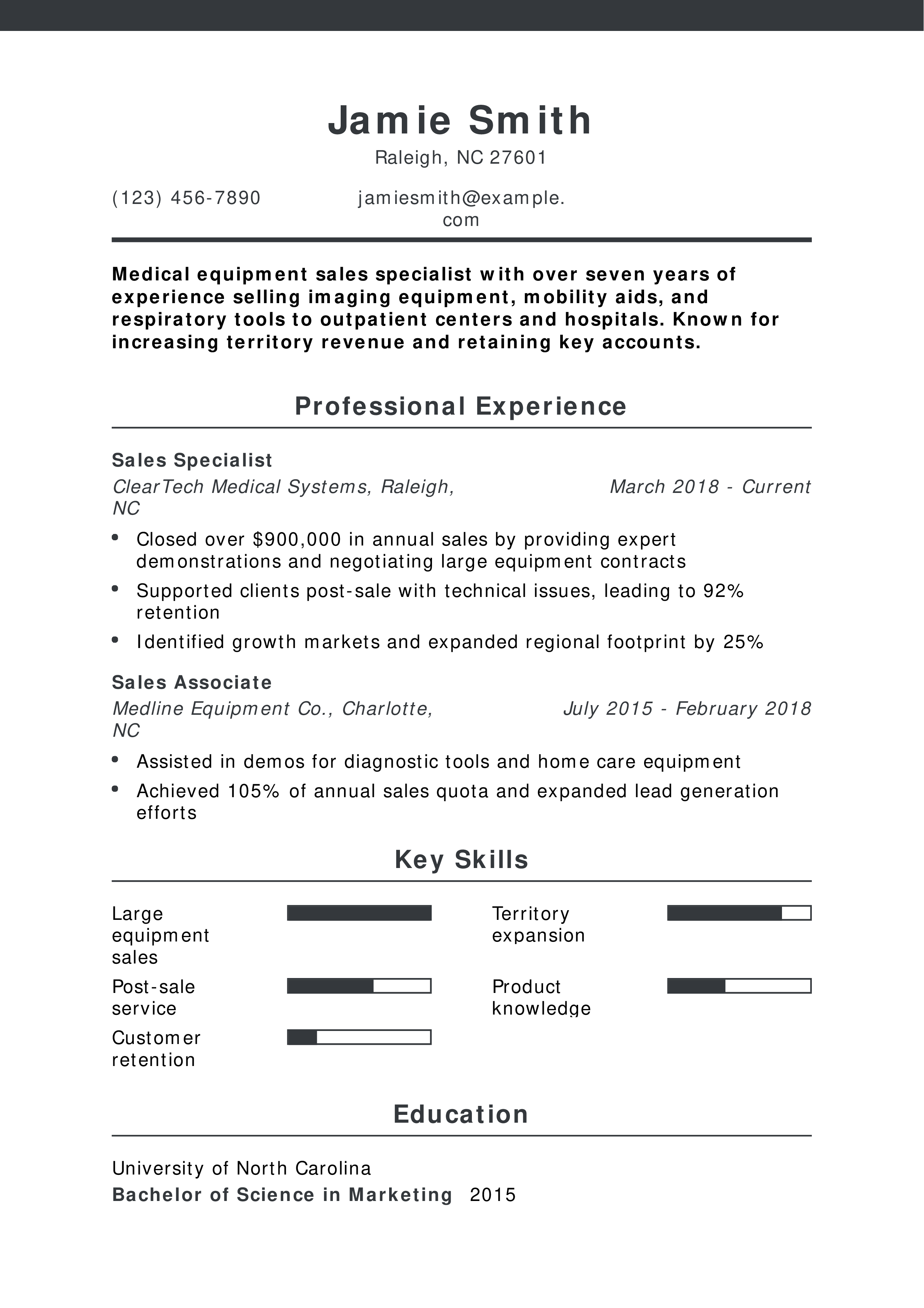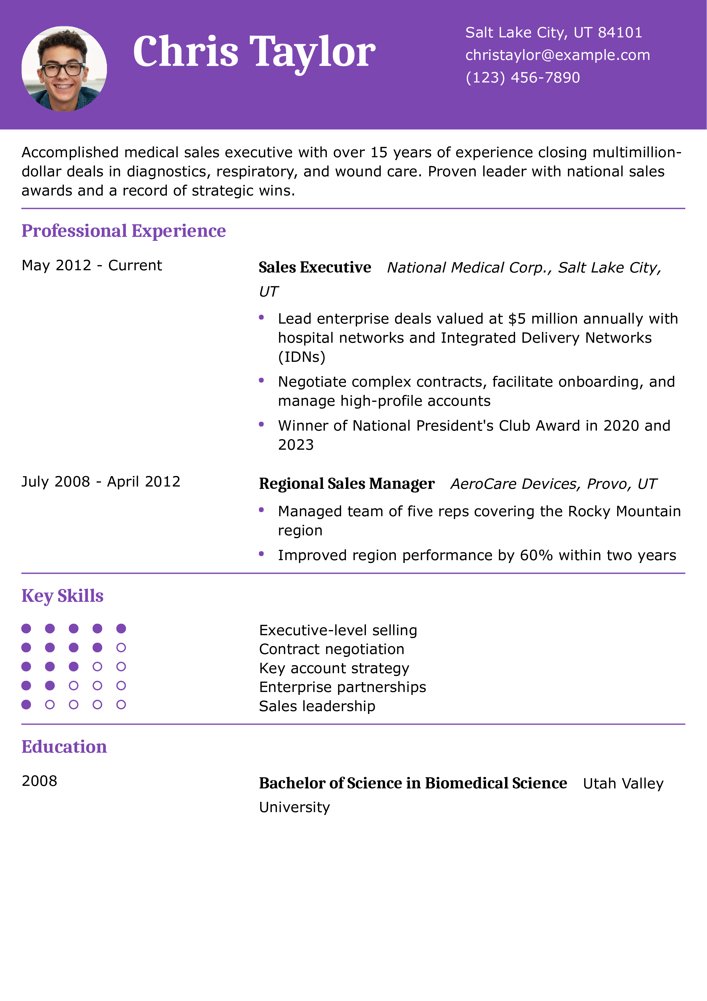 However, a combination resume might be more suitable if you're transitioning into medical sales from a different field or have gaps in your work history. This format allows you to emphasize medical skills and accomplishments while chronologically presenting your work history. Select a resume format that best presents your professional background and aligns with your career goals.