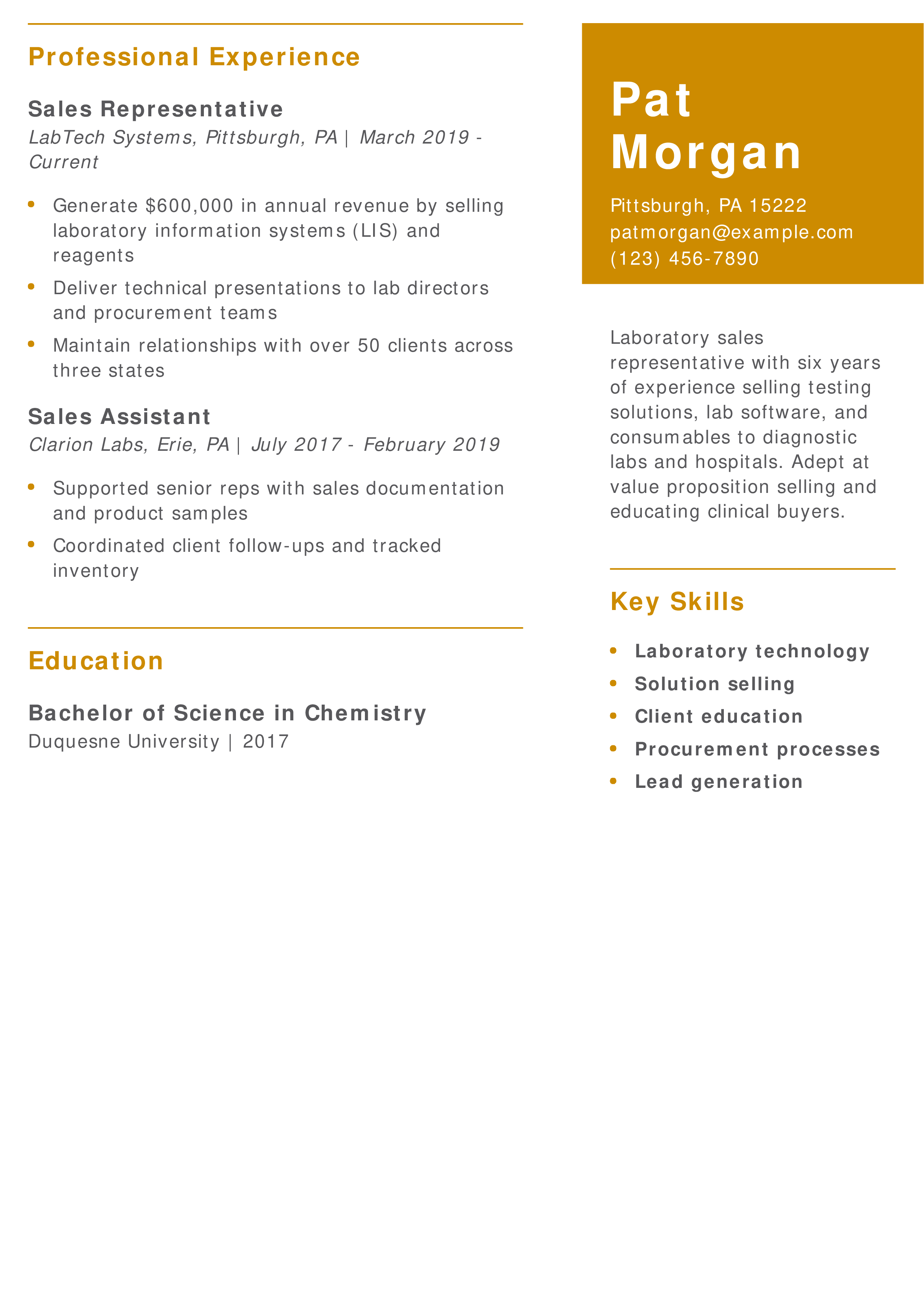 This resume stands out because it merges technical science knowledge with sales achievement. For help writing your own, review technical skills for a resume.