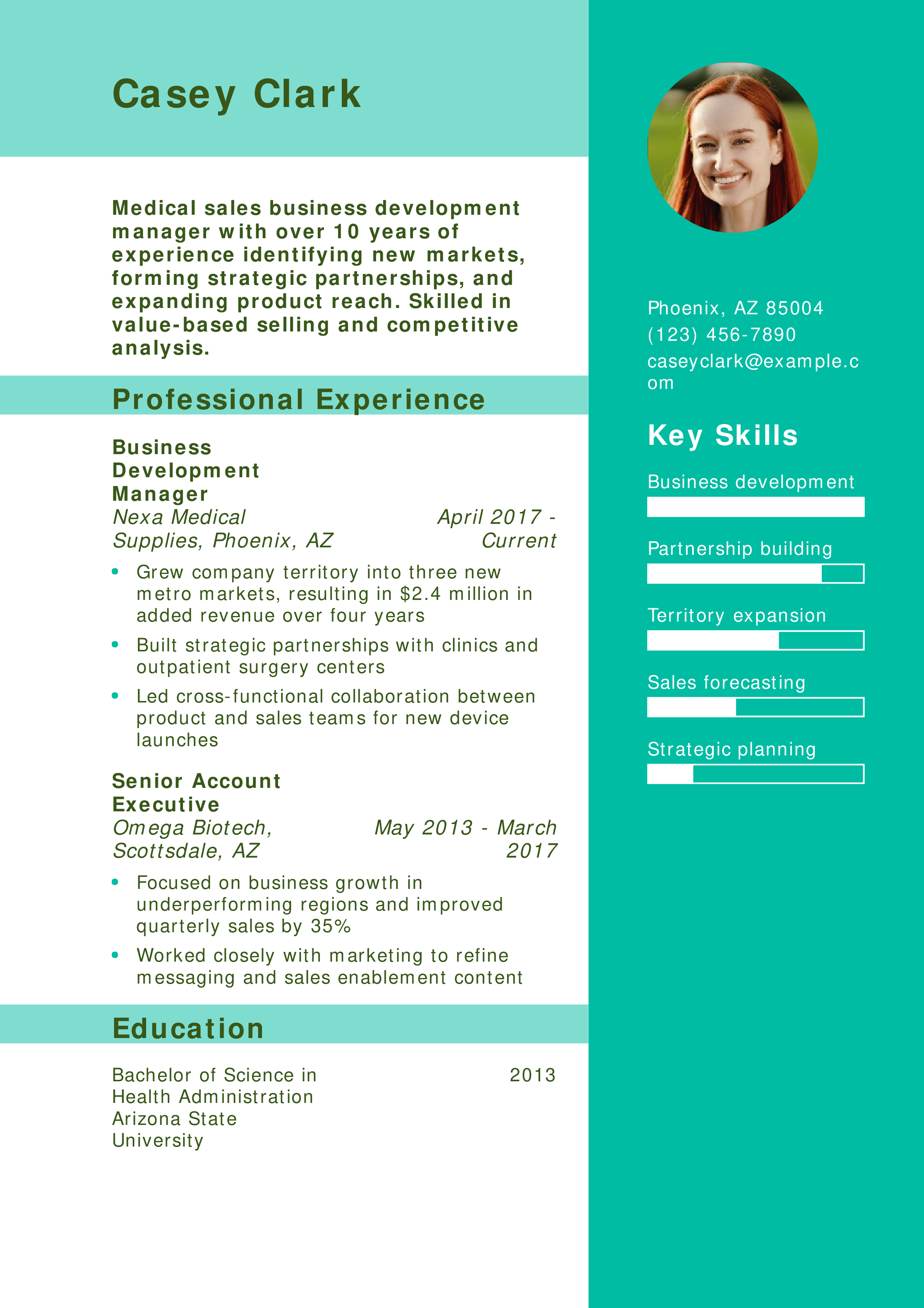 This resume is successful because it shows long-term strategic growth paired with tactical execution. To learn more about emphasizing business development experience, visit resume skills.