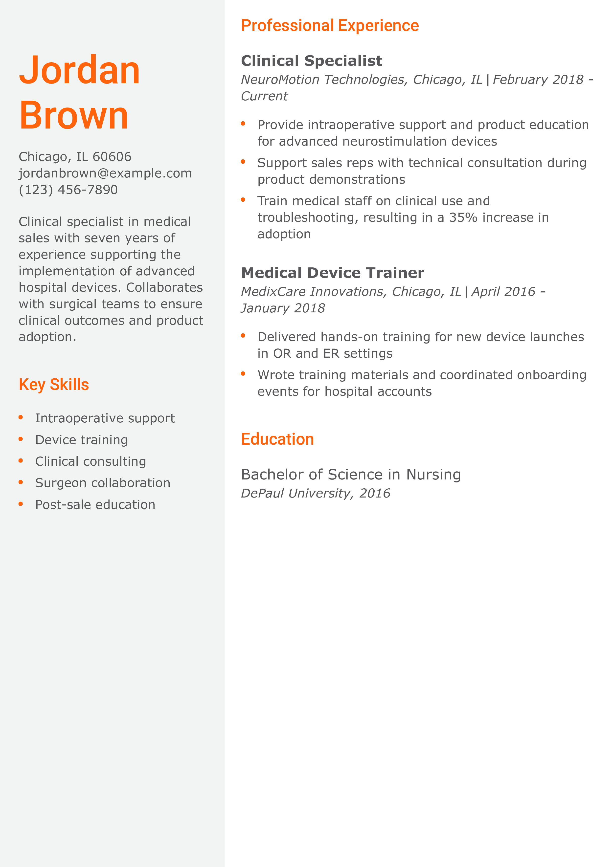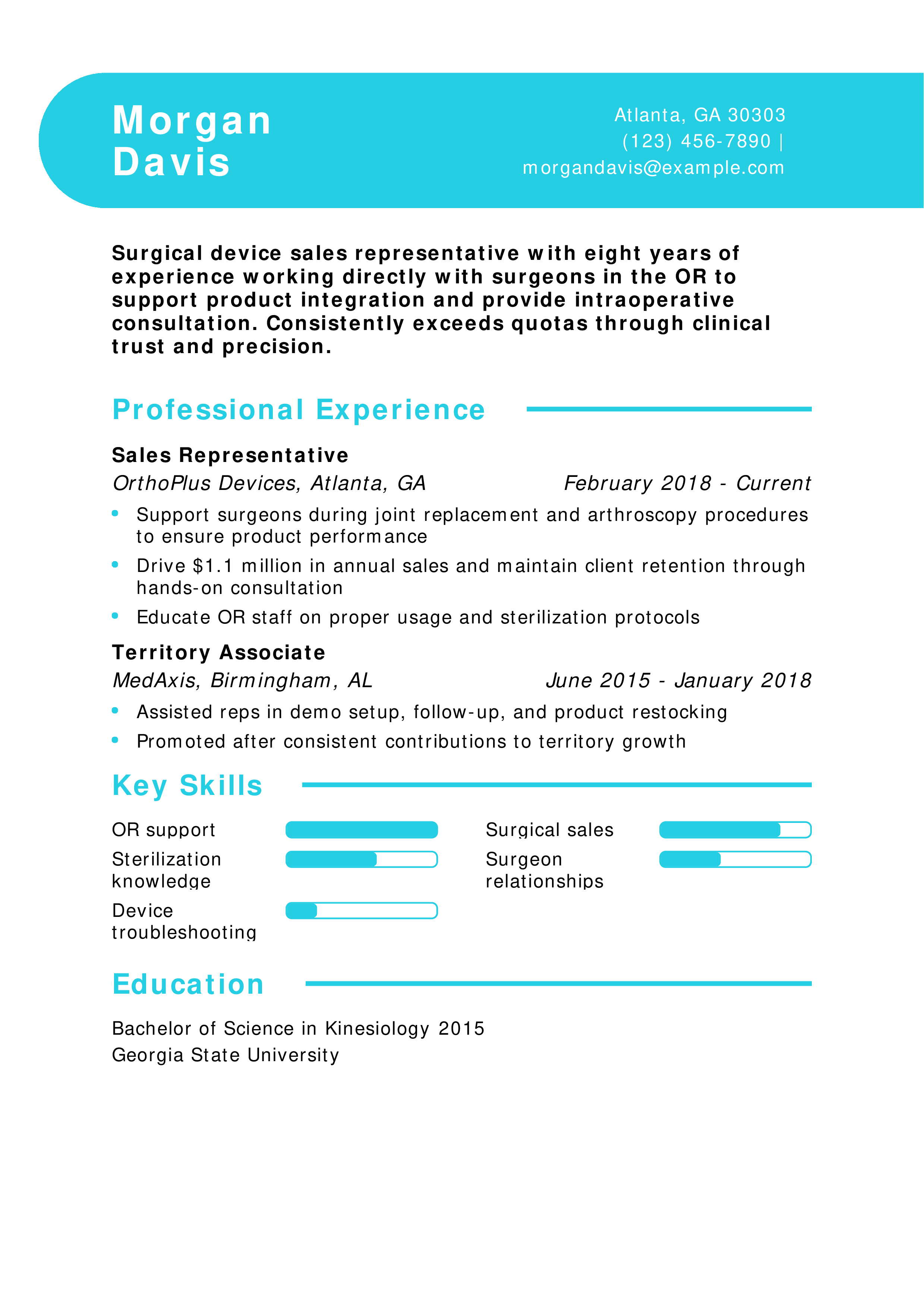 This resume is strong because it emphasizes technical skill and OR support, two major hiring factors in surgical sales. For more help optimizing structure, read best font for a resume.