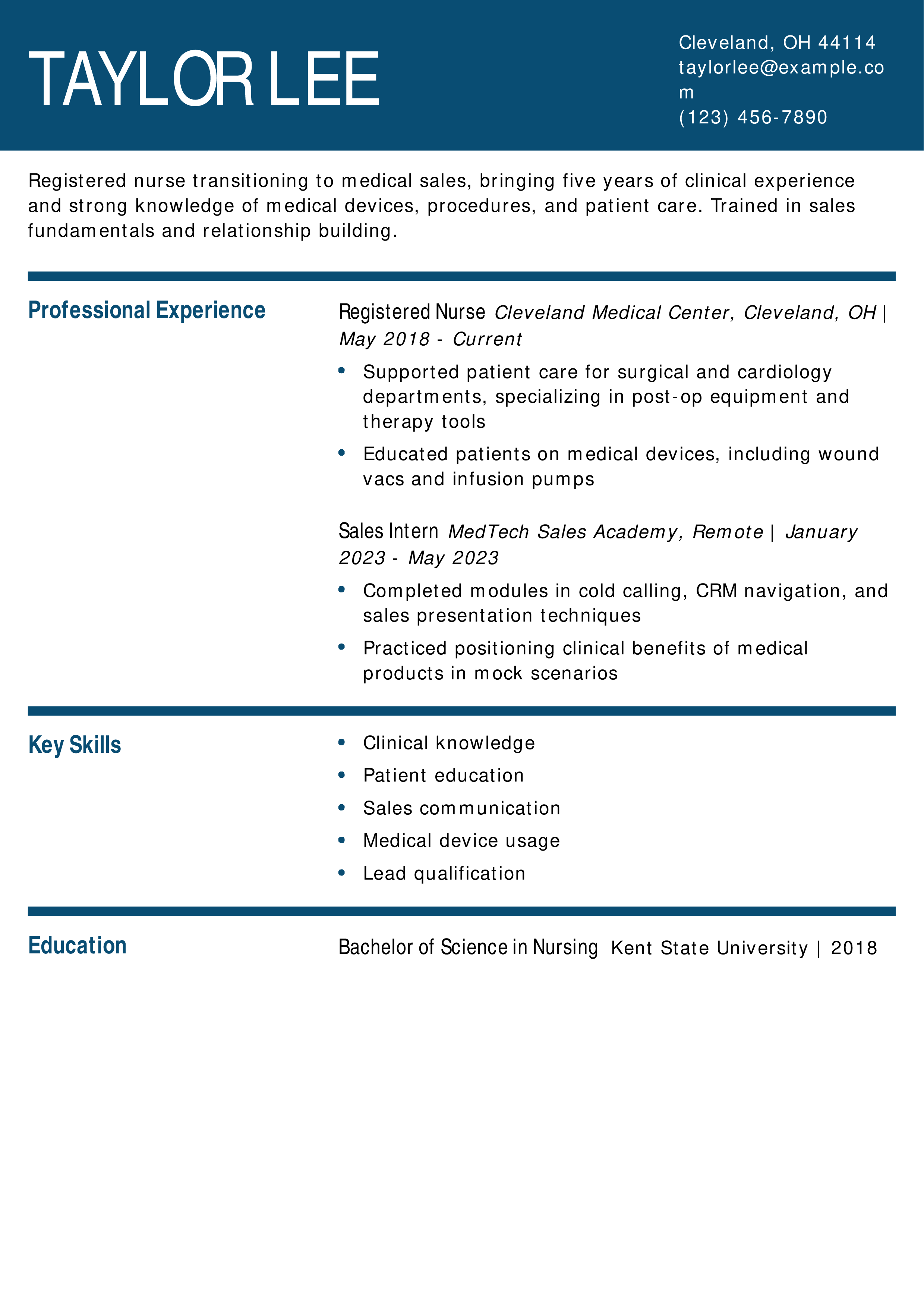 This resume is effective because it clearly demonstrates transferable clinical skills and a proactive approach to breaking into sales. Learn more about showcasing career transitions at cv vs. resume.